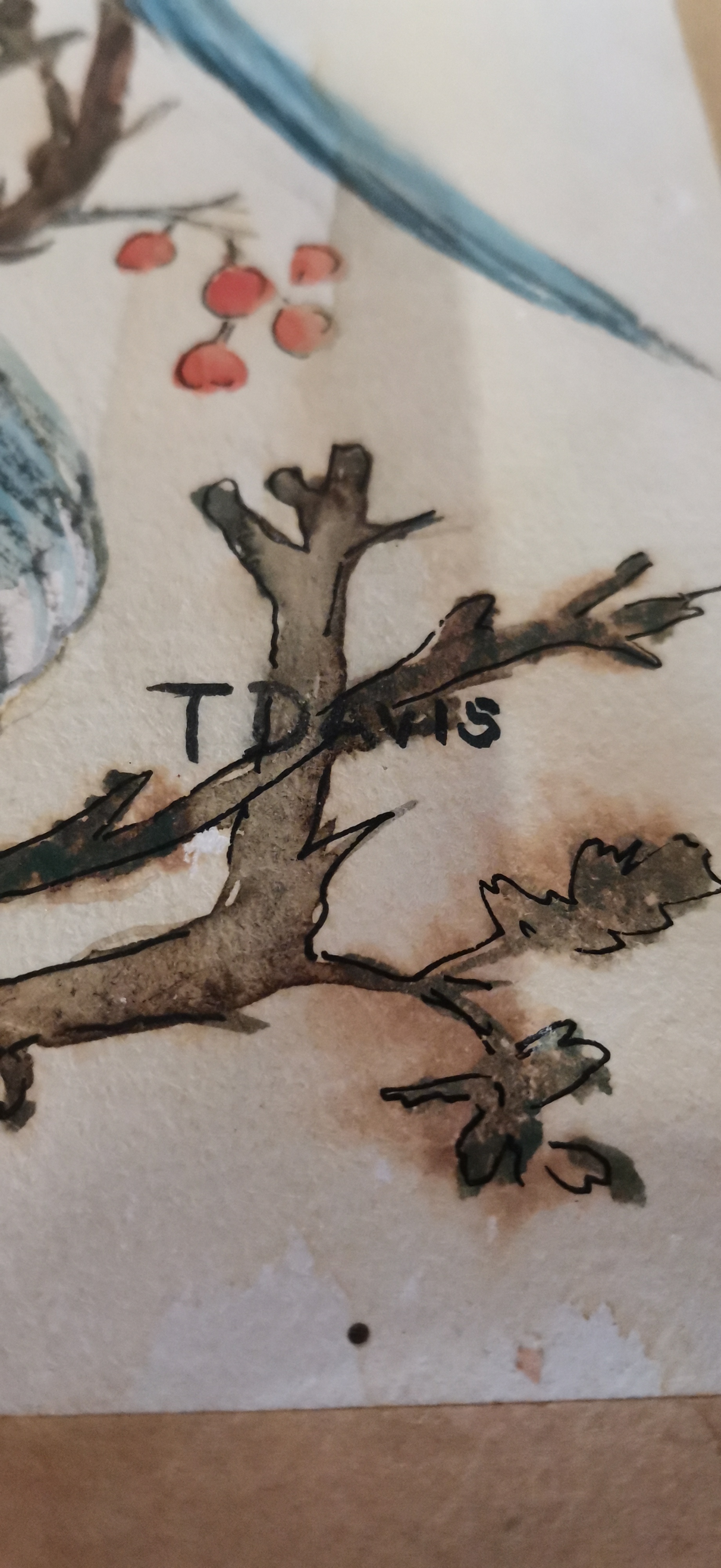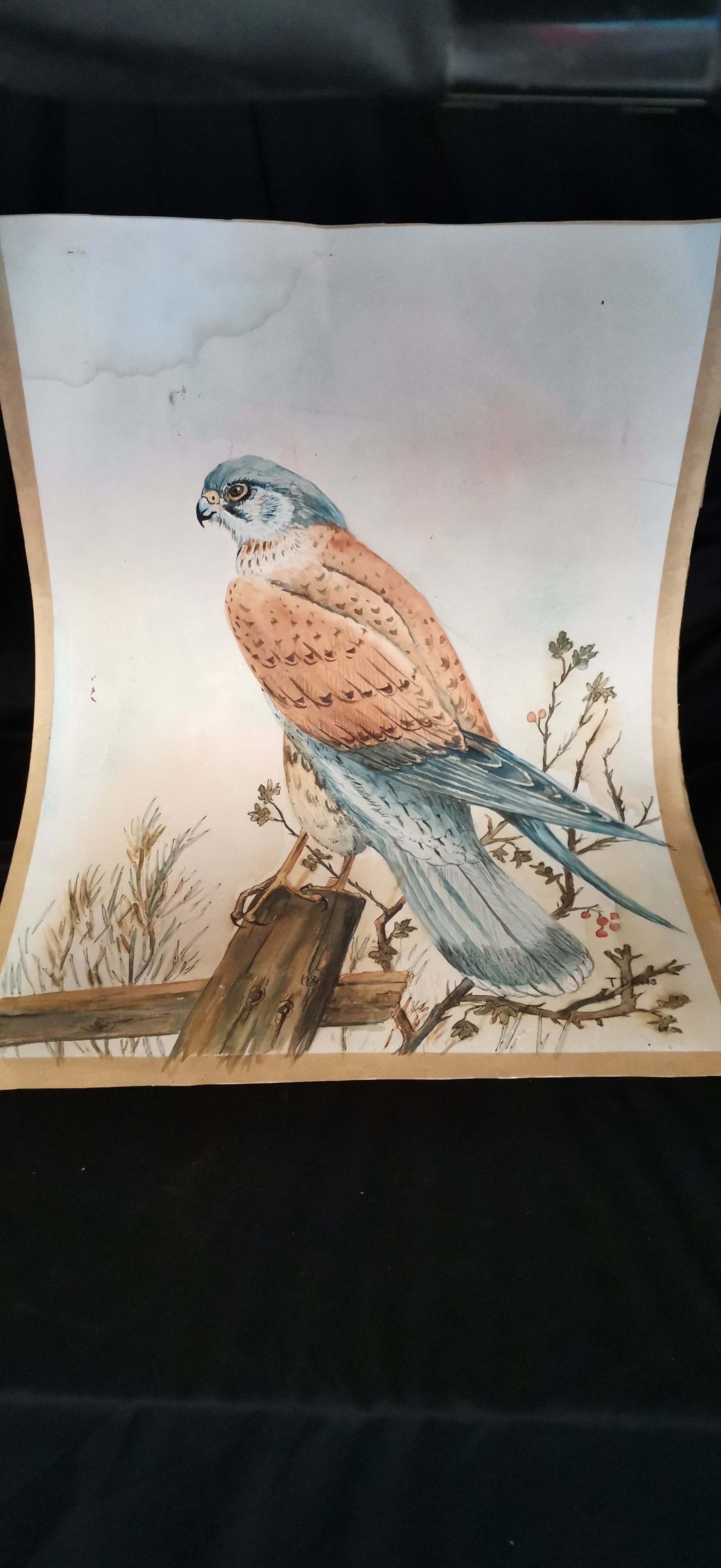 An unframed watercolour painting depicting a bird of prey in shades of blue, brown, and cream, signed T DAVIS in the lower right corner.