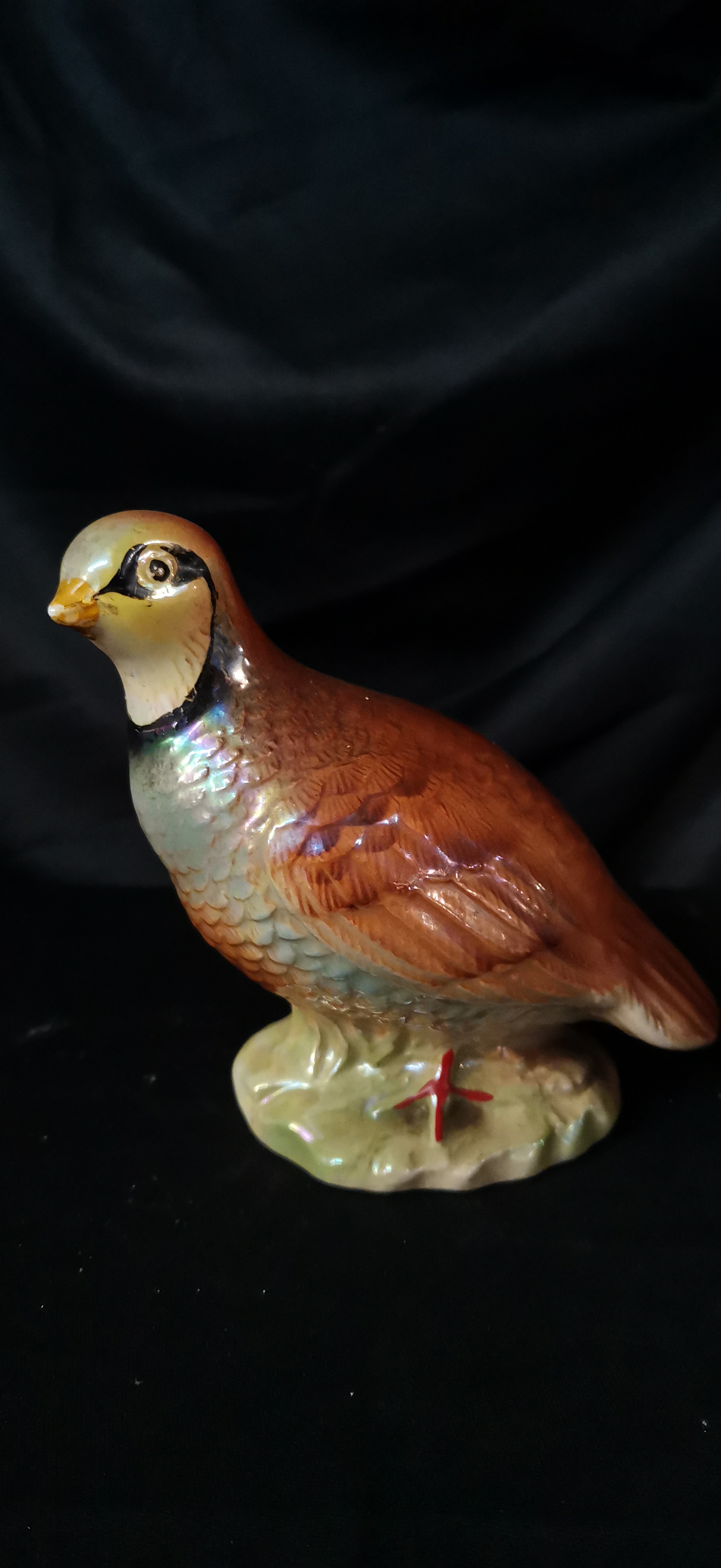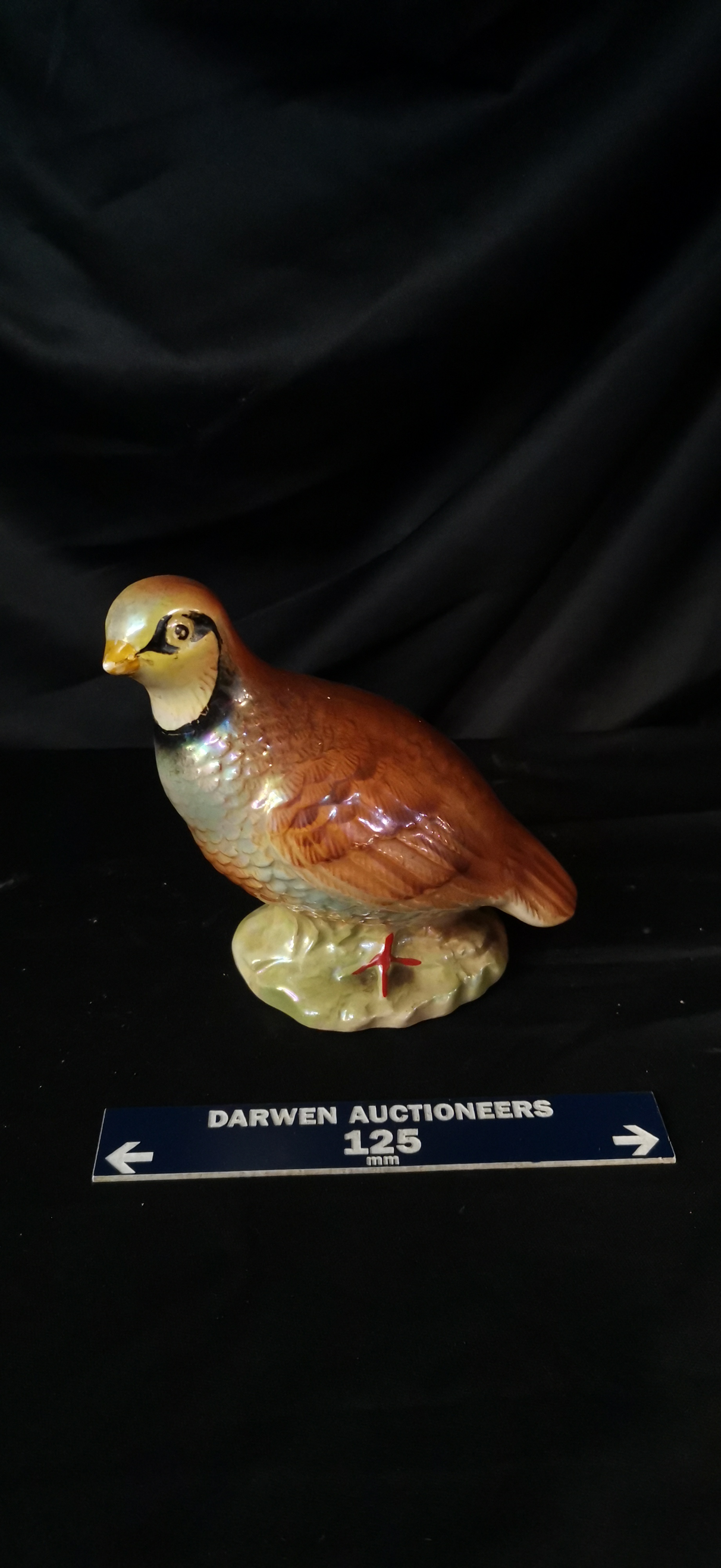 A ceramic quail bird figurine featuring brown and yellow plumage with iridescent chest highlights, measuring approximately 125 mm in length.