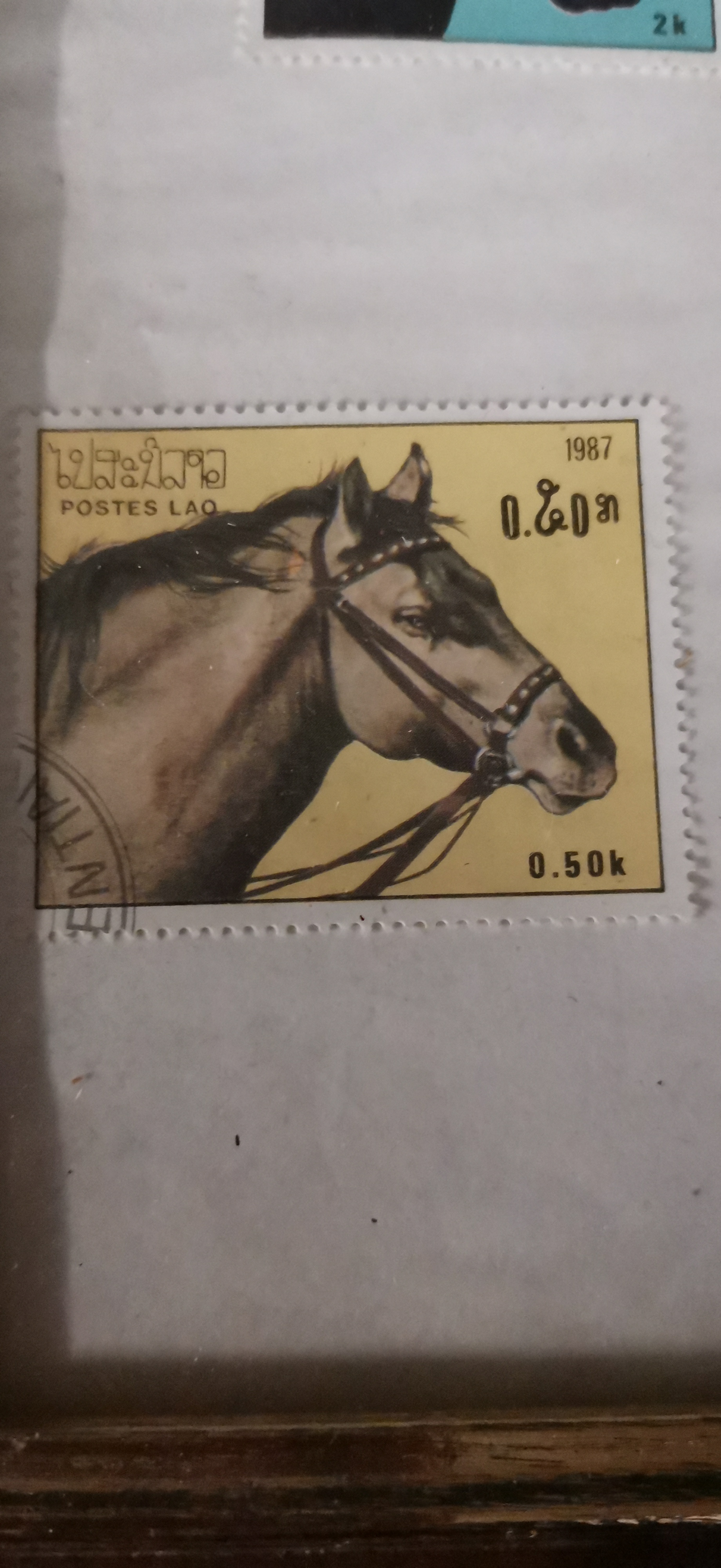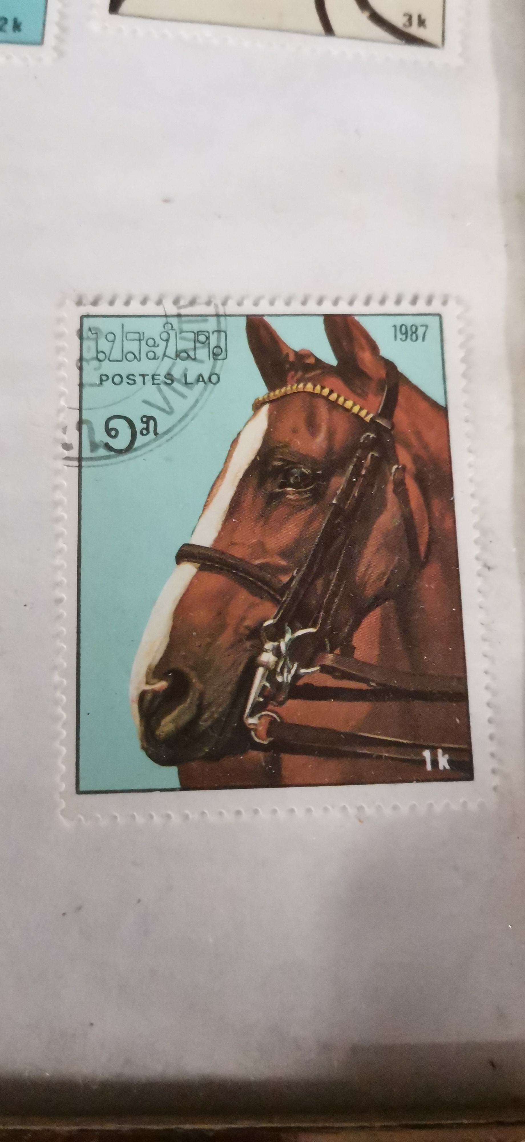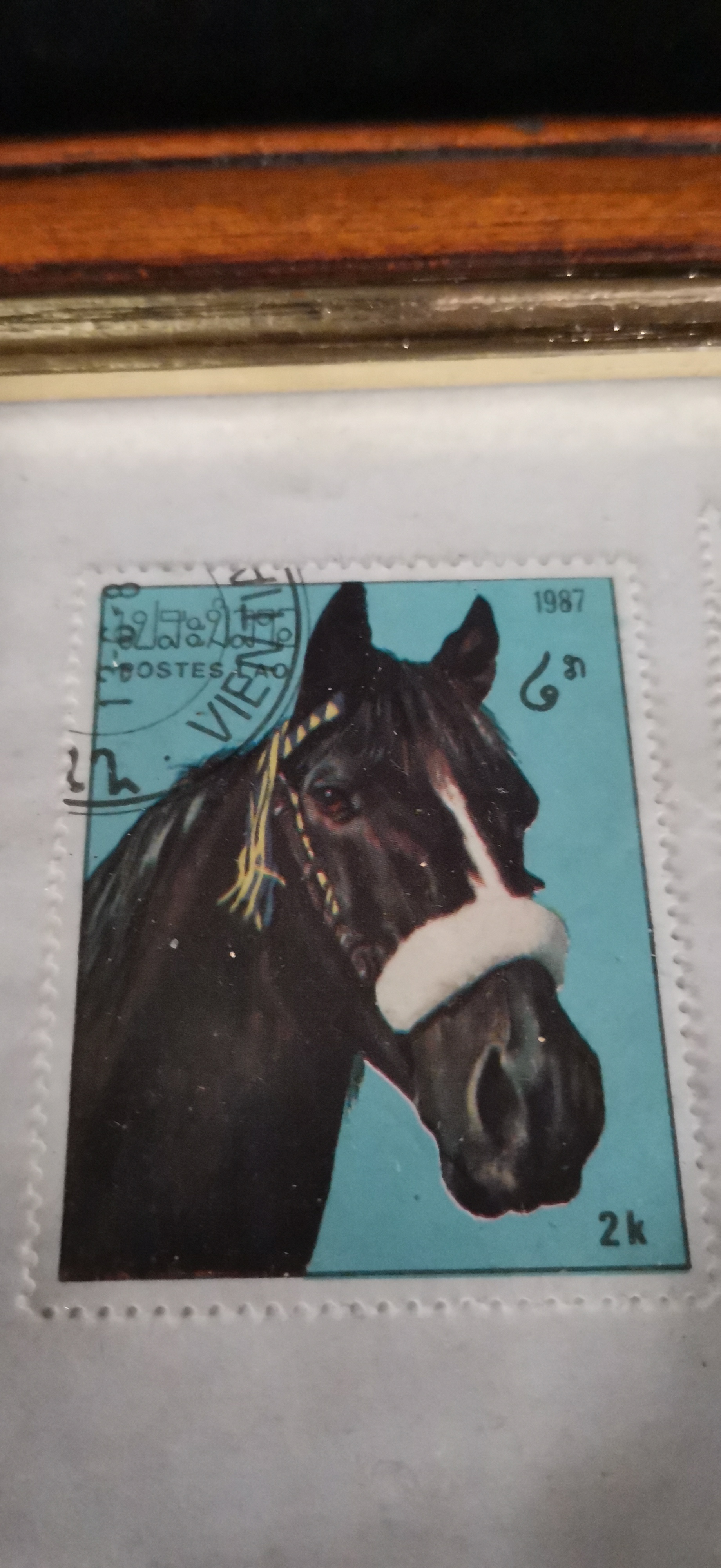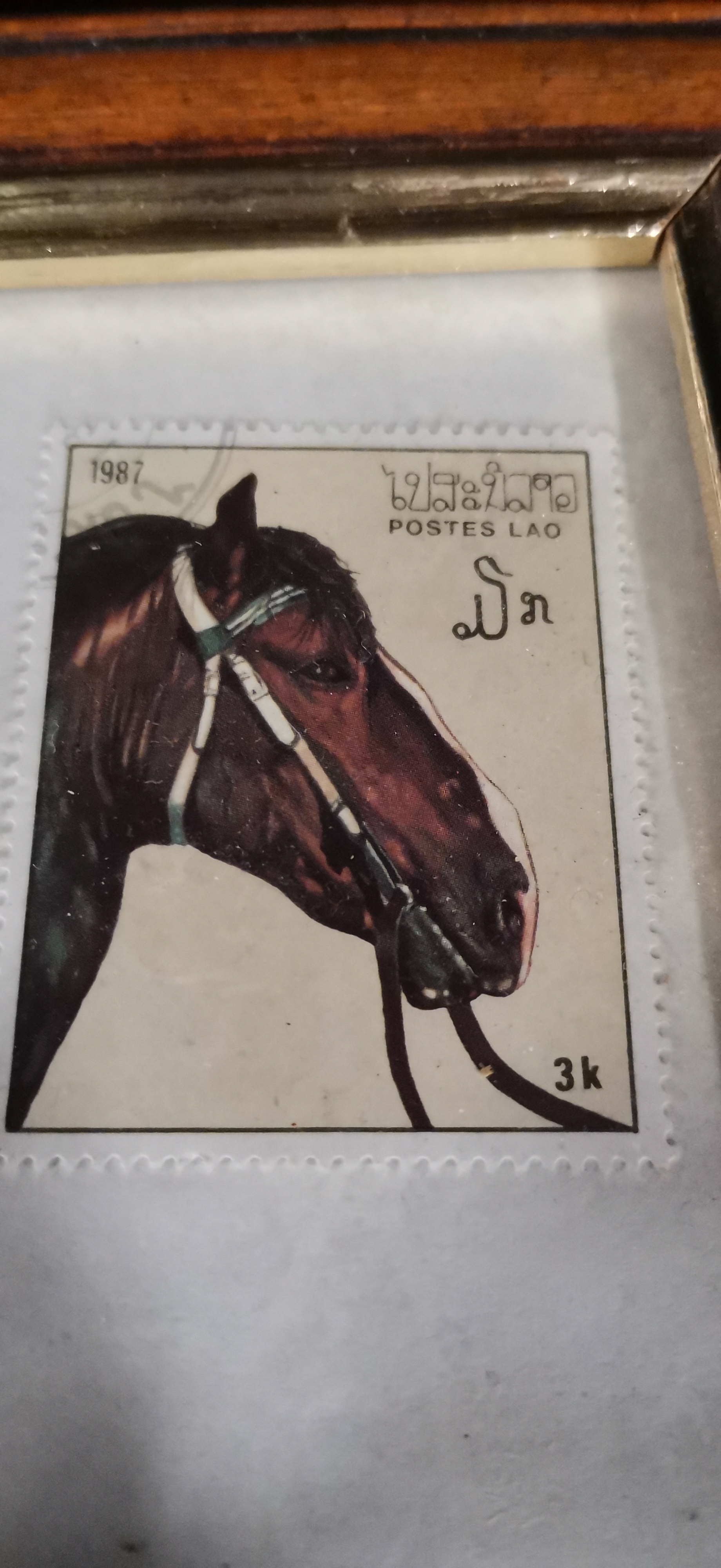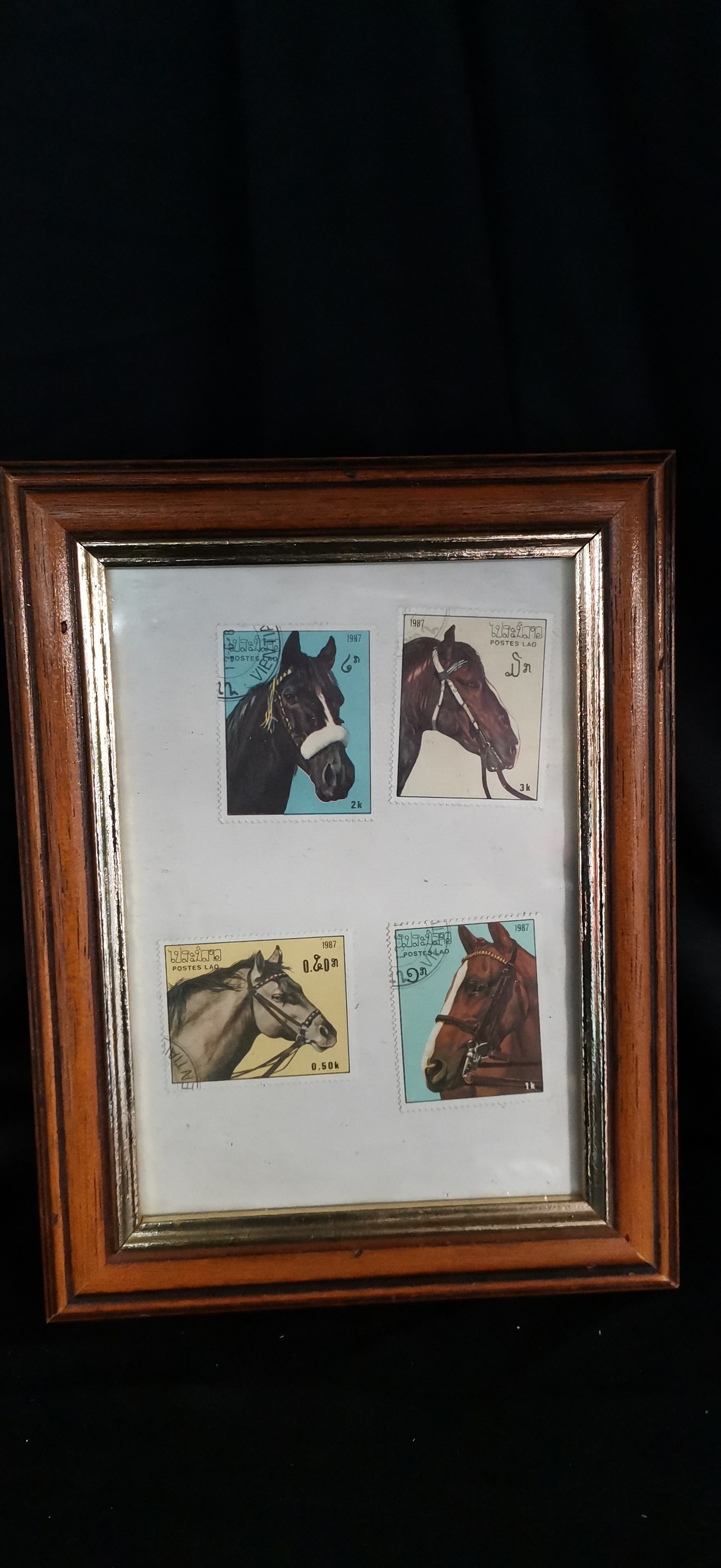 A collection of four 1987 postage stamps from Laos featuring various coloured horse heads with values of 0.50k, 1k, 2k, and 3k, presented in a single wooden frame.