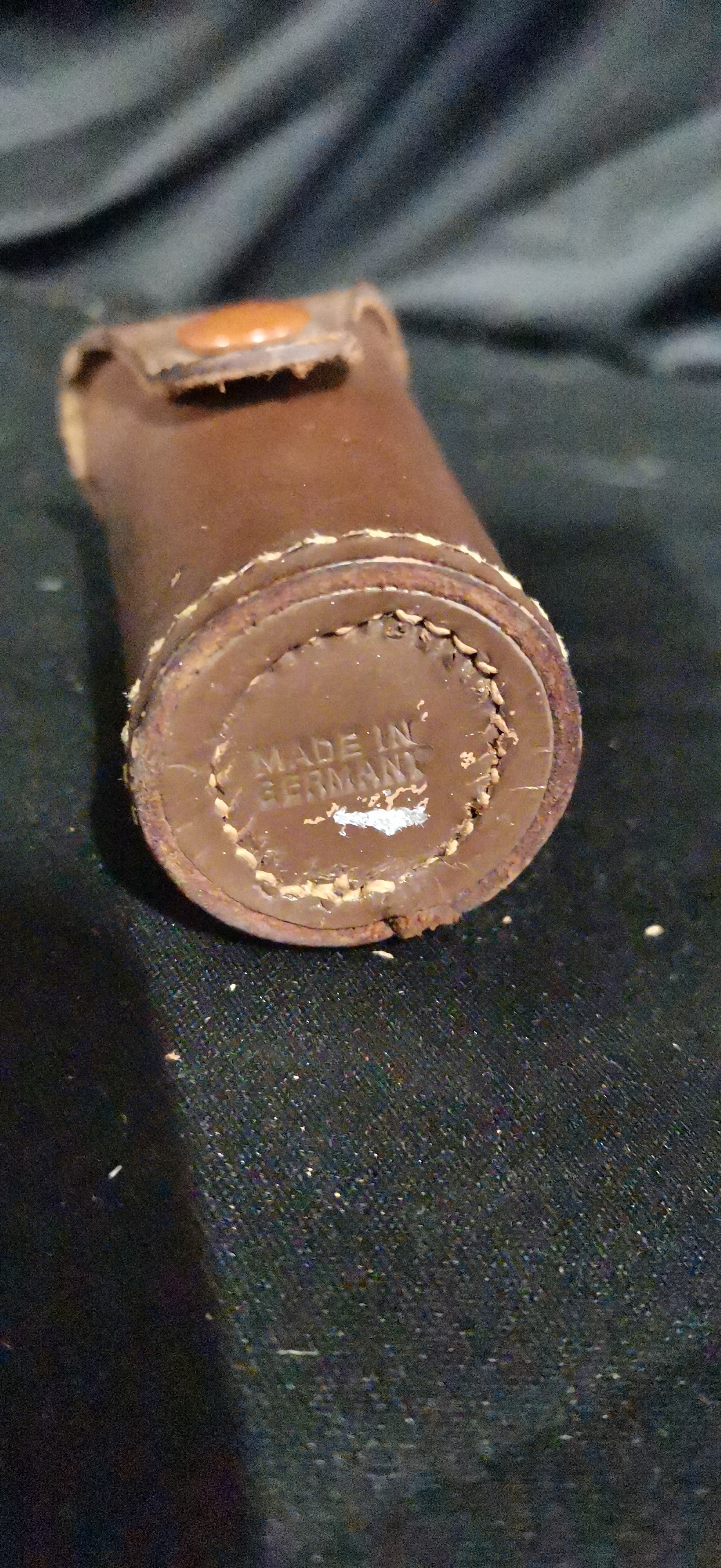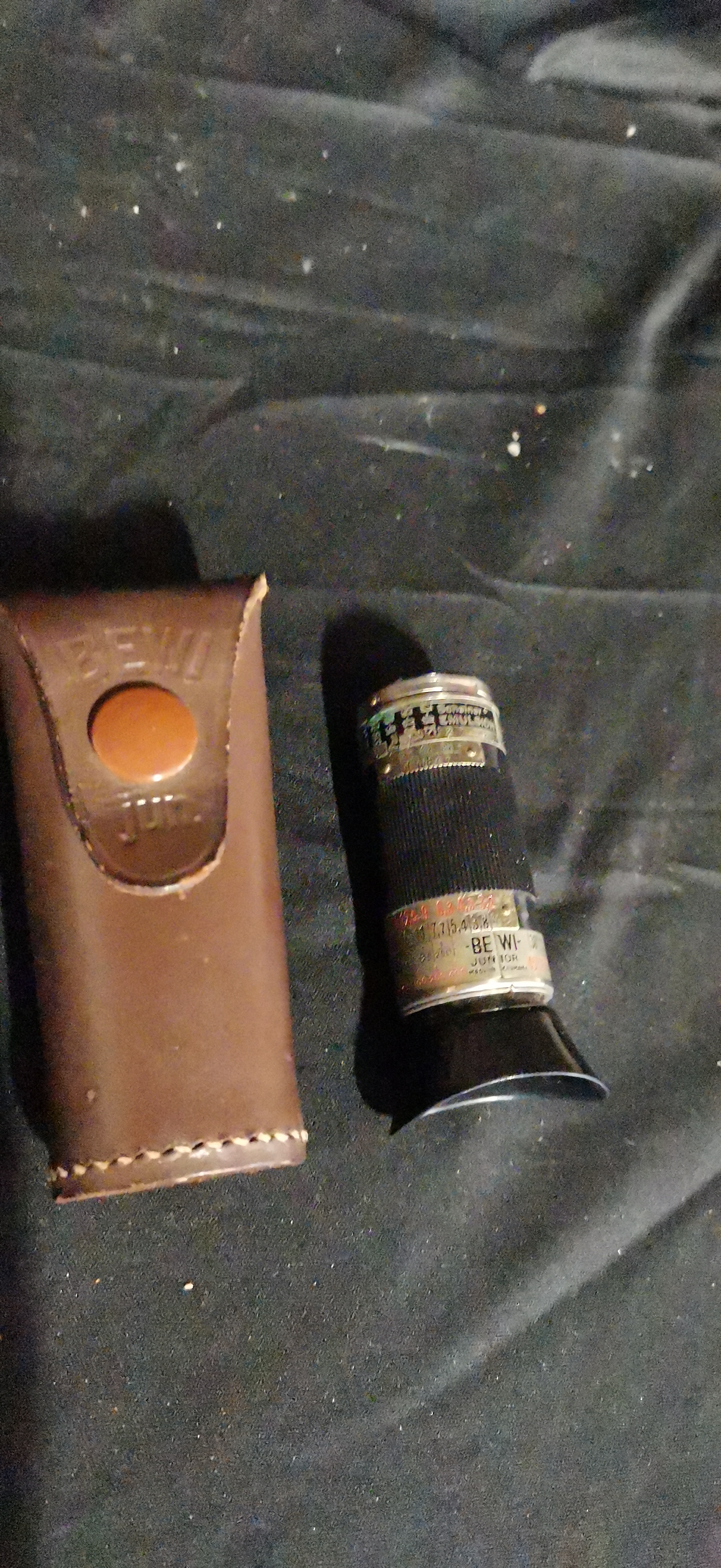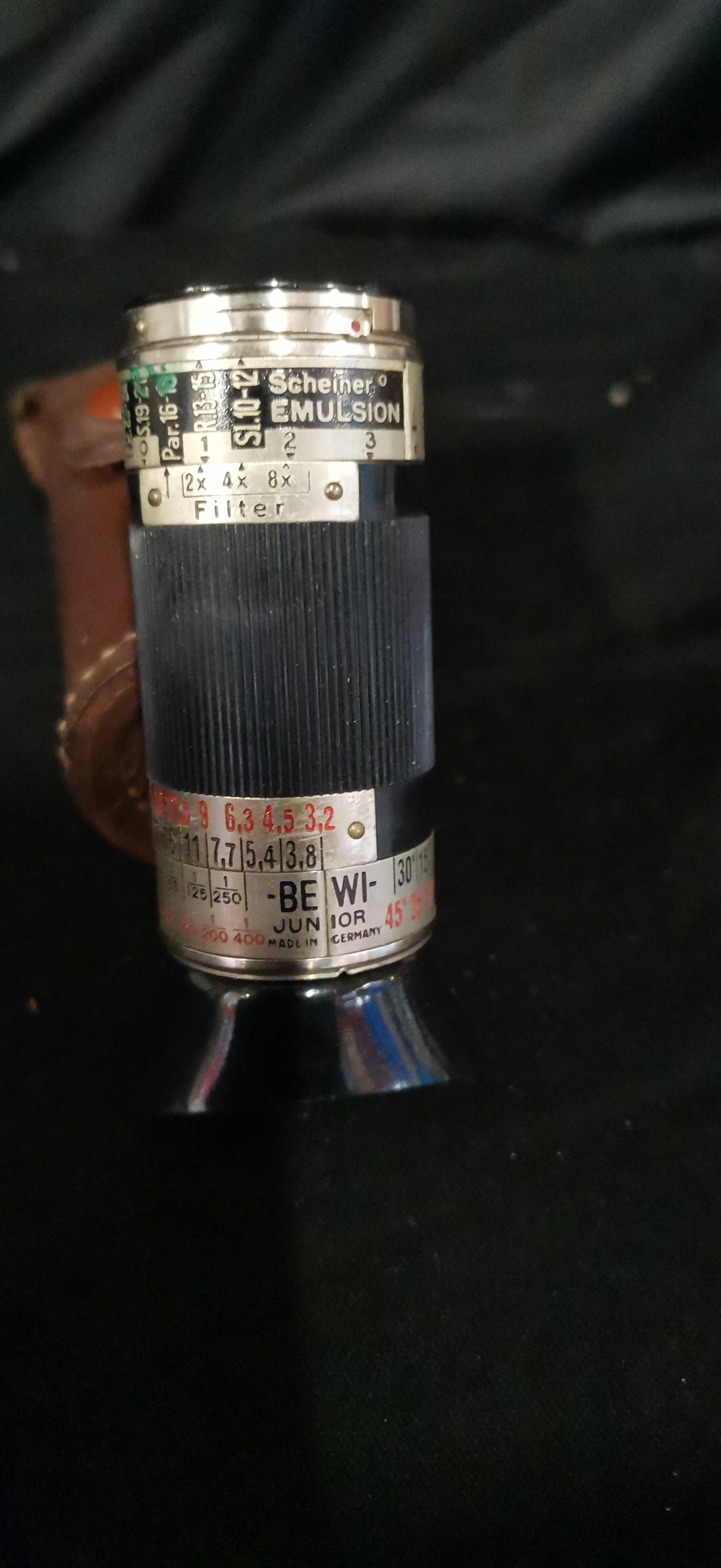 A vintage black and silver BEWI-JUNIOR photographic exposure meter made in Germany, accompanied by a coordinating brown leather case embossed with BEWI jun.