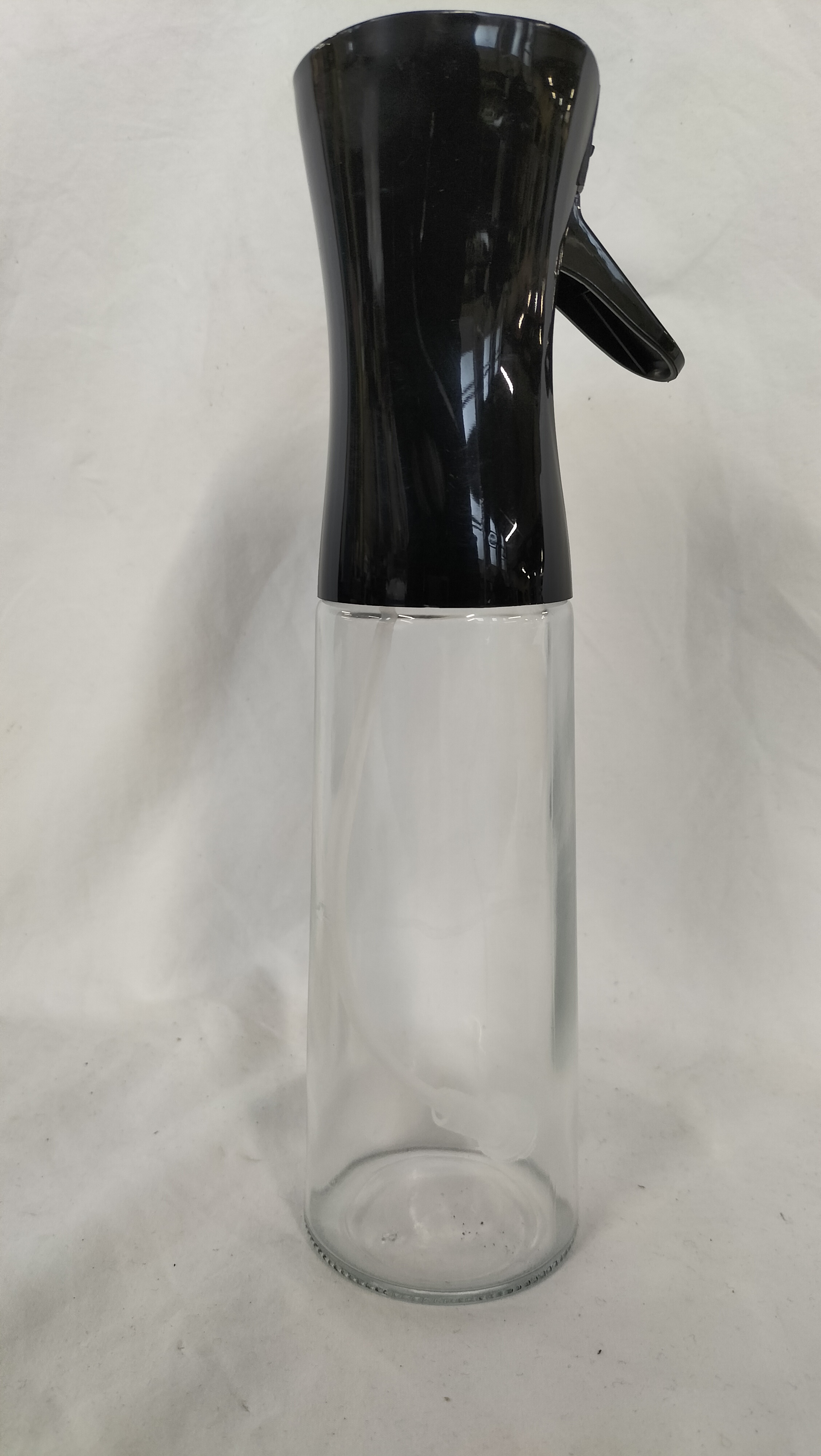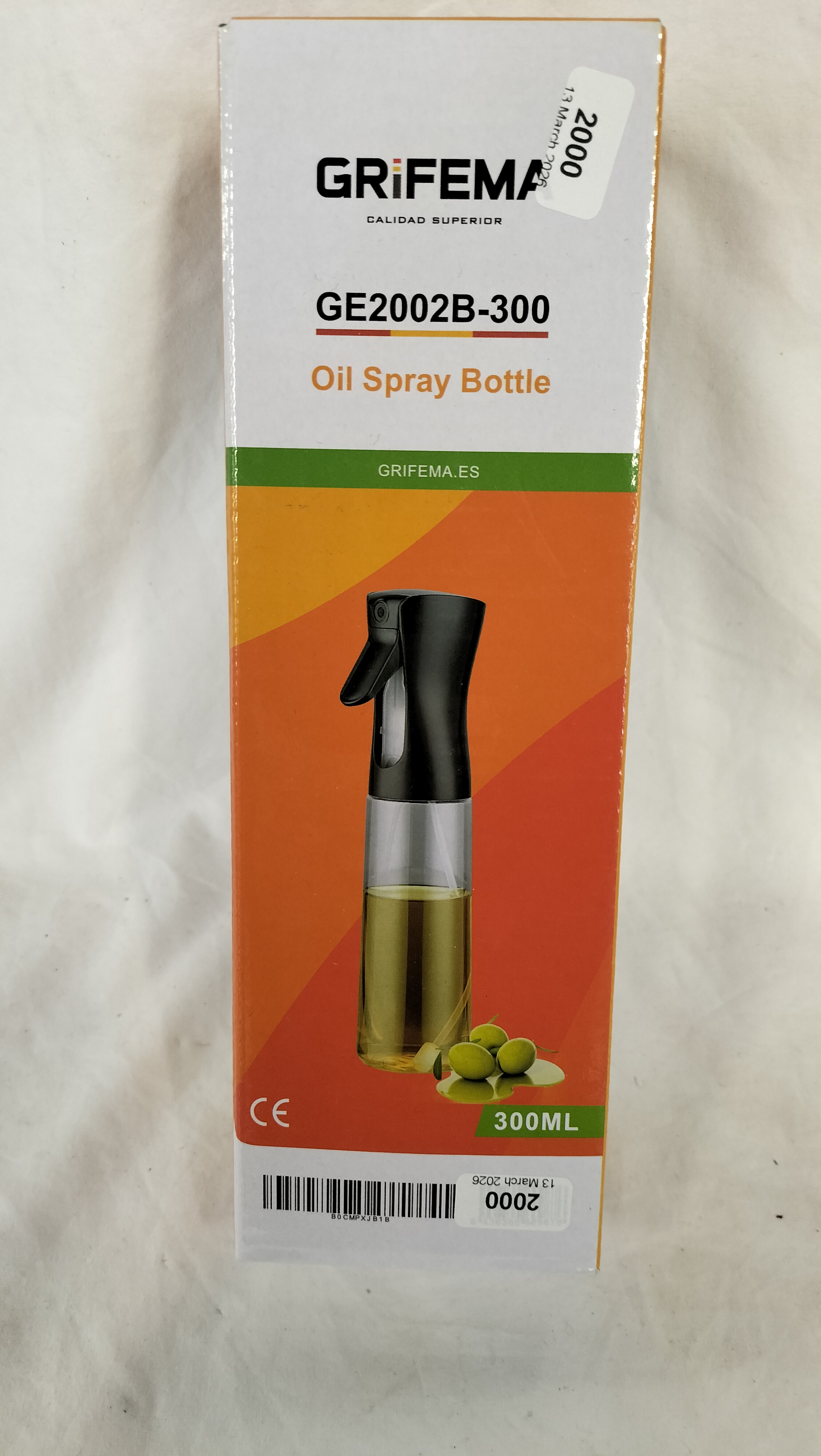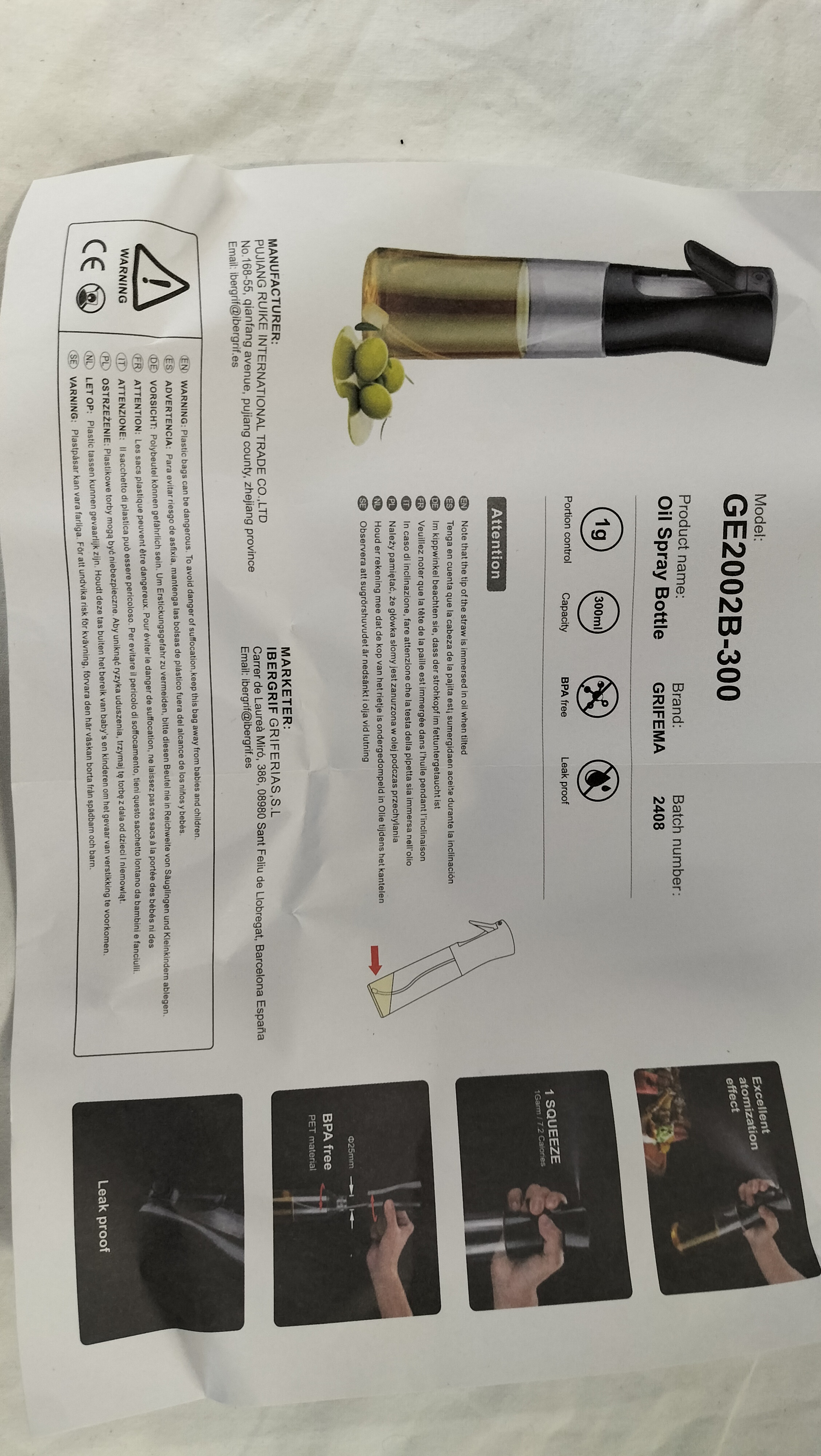 A Grifema model GE2002B-300 oil spray bottle designed for kitchen use. The item features a clear PET plastic reservoir with a stated capacity of 300ml, fitted with a black trigger-operated spray head. The retail packaging and accompanying user manual identify the marketer as Ibergrif Griferias, S.L. of Spain and the manufacturer as Pujiang Ruike International Trade Co., Ltd. of China. The product is documented as being BPA-free and leak-proof, and the packaging bears a CE mark. This lot includes the original retail box and the manufacturer’s instruction manual.