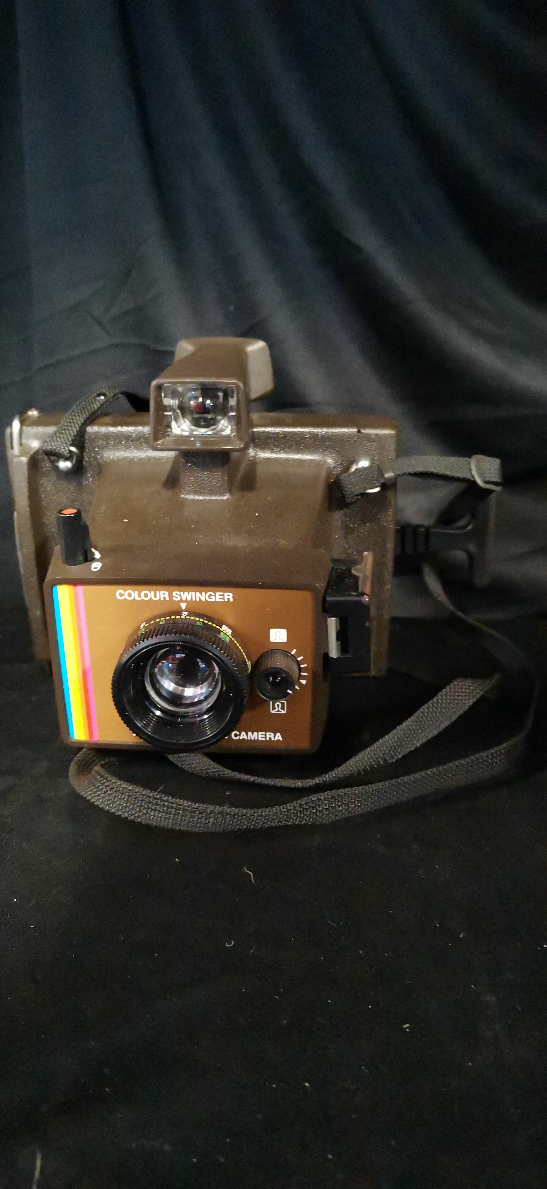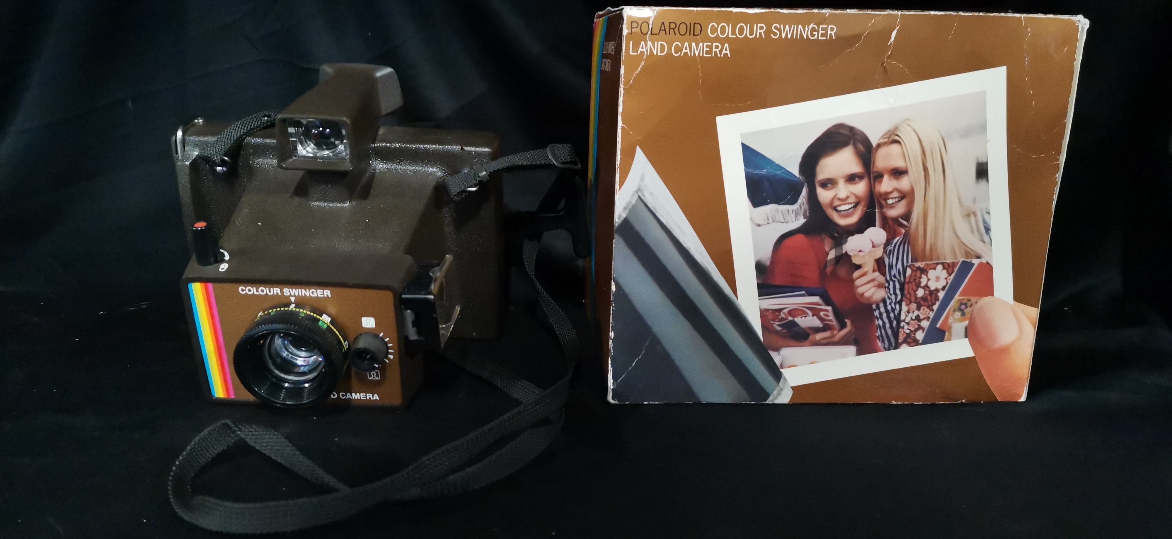 A brown Polaroid Colour Swinger Land Camera featuring a rainbow stripe detail and its original retail packaging.