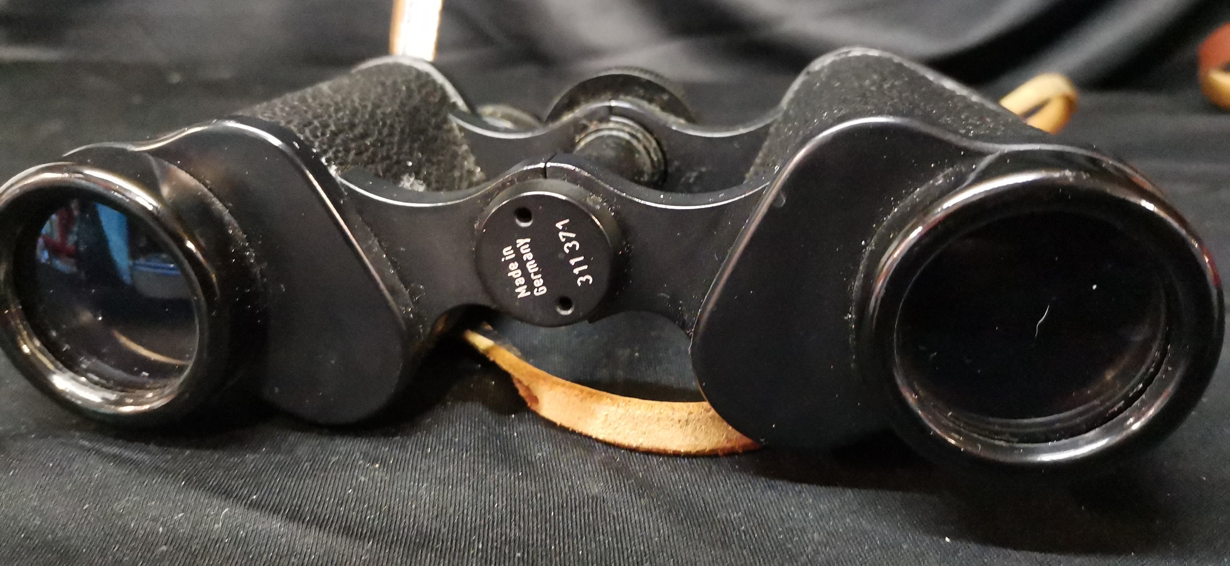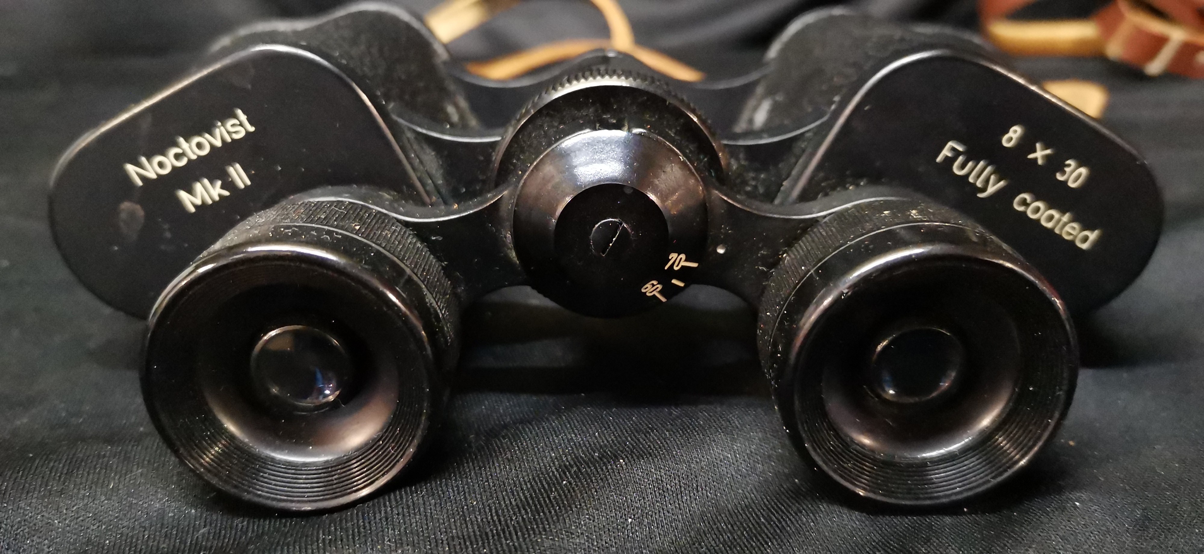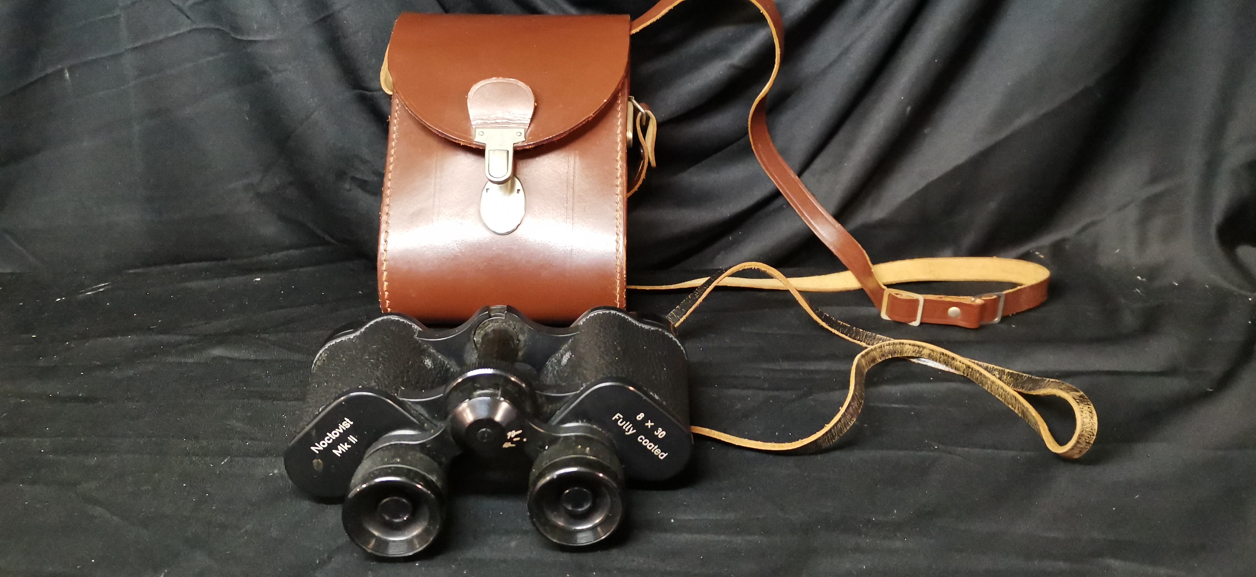 A pair of black Noctovist Mk II 8 x 30 wide angle fully coated binoculars made in Germany with serial number 311371 and a brown leather carrying case.