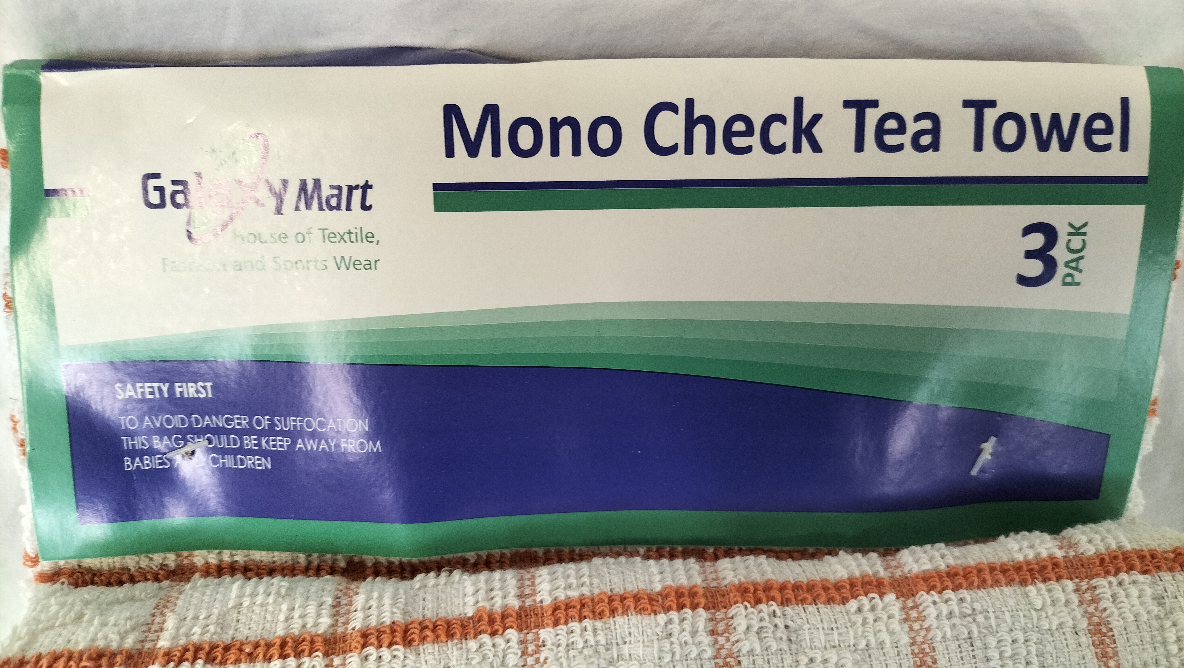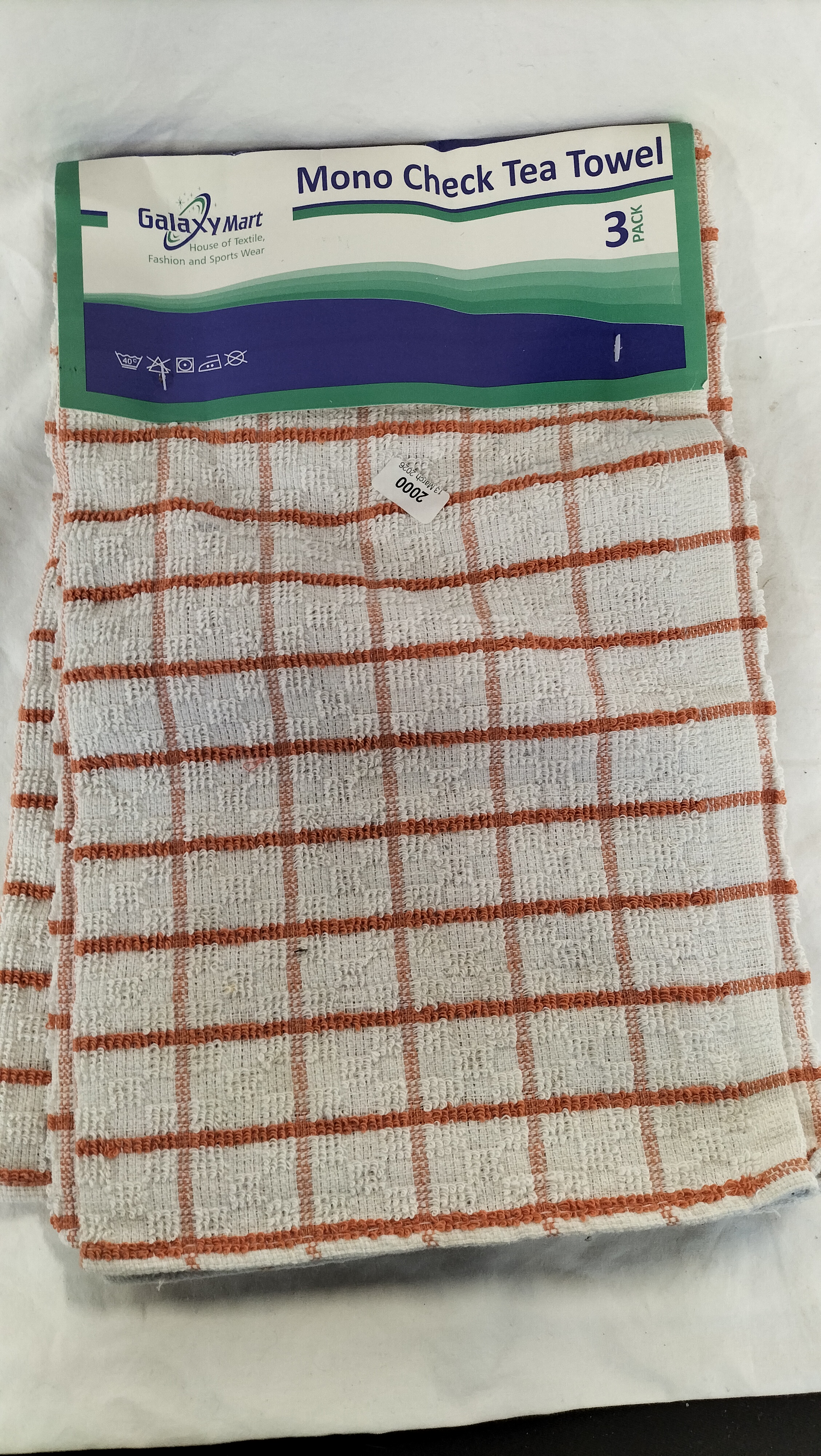 A trio of tea towels by Galaxy Mart, House of Textile, Fashion and Sports Wear. The towels feature an orange and white mono check pattern and are constructed from a material with a looped, terry-like texture. The items are contained within their original retail packaging, which displays the maker mark, pattern name, and laundry care symbols. A small adhesive inventory sticker is attached to the front towel, printed with 2000 and 13 March 2024.