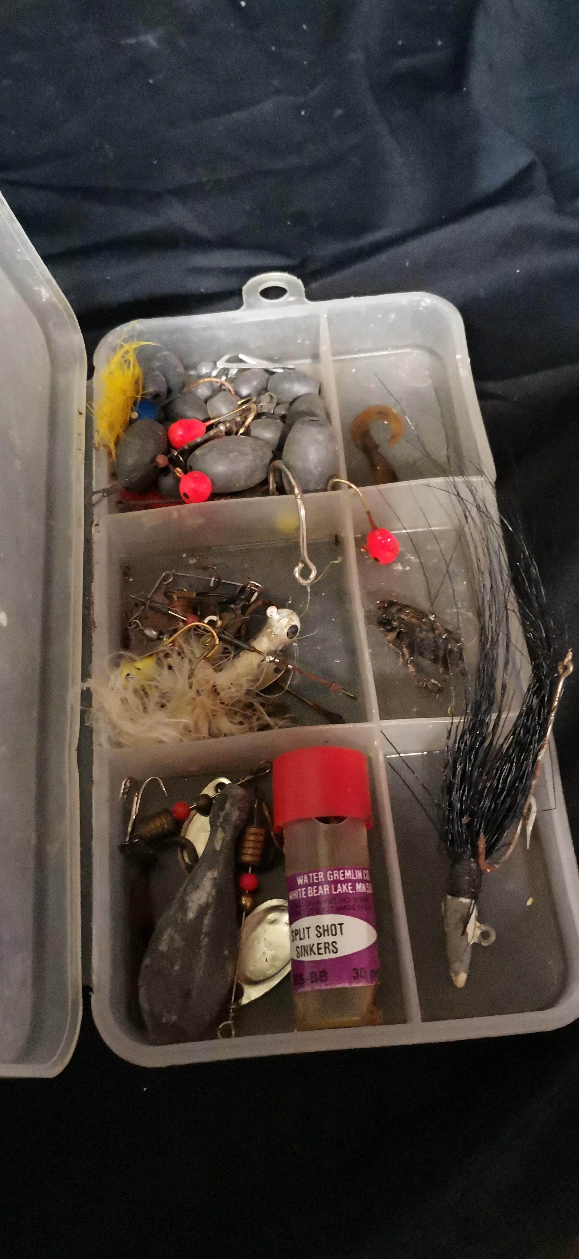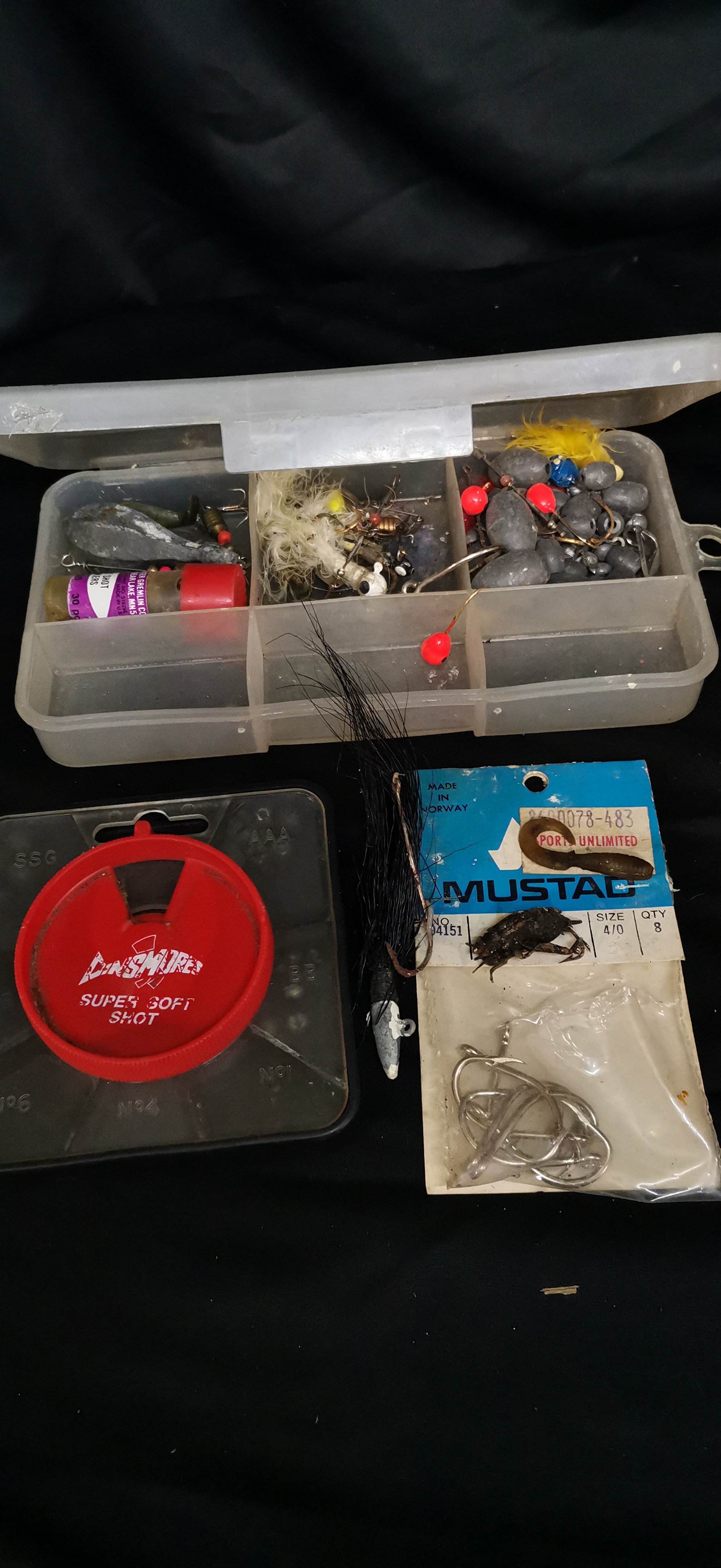 A collection of multicoloured fishing tackle including various lures, lead sinkers, and hooks featuring brands such as Dinsmores Super Soft Shot, Water Gremlin Co., and Mustad Live Bait hooks.