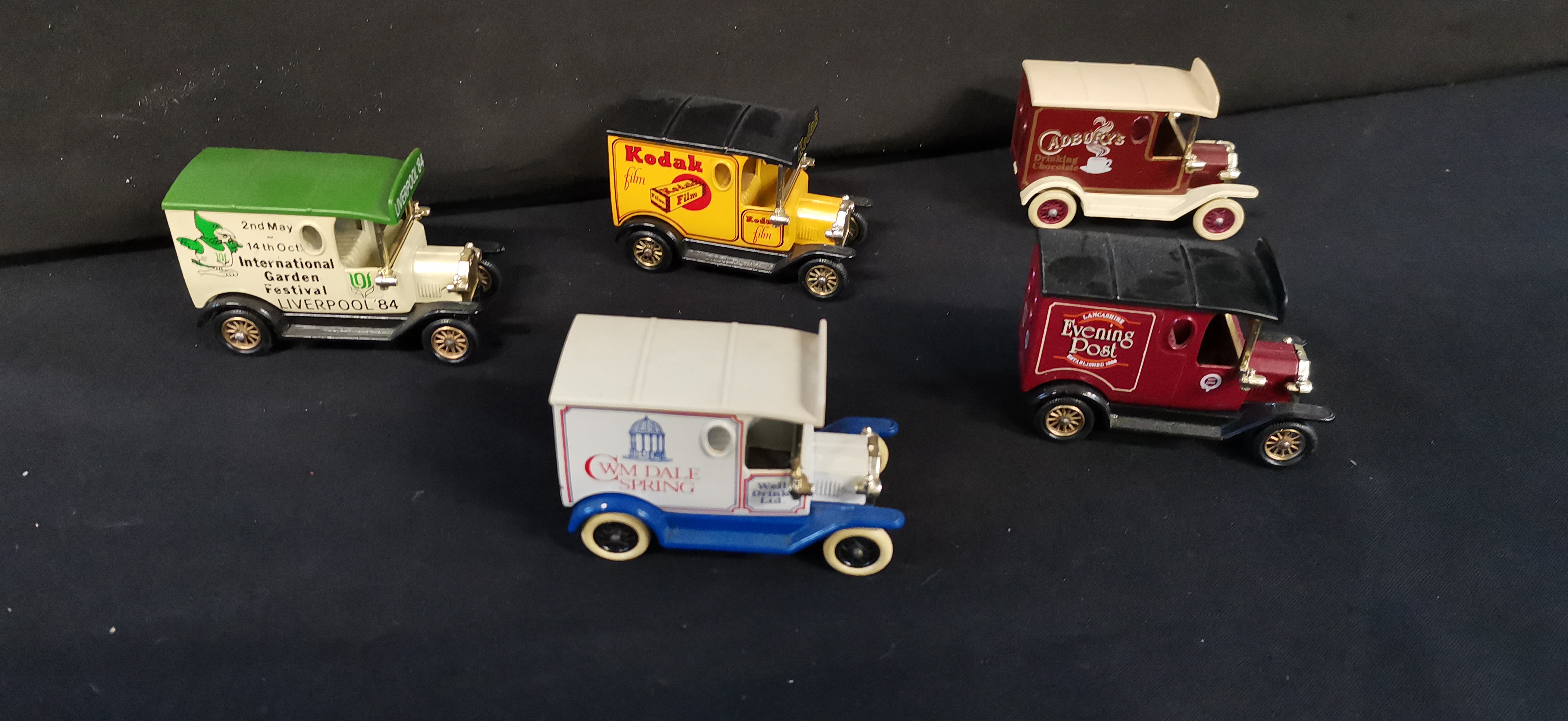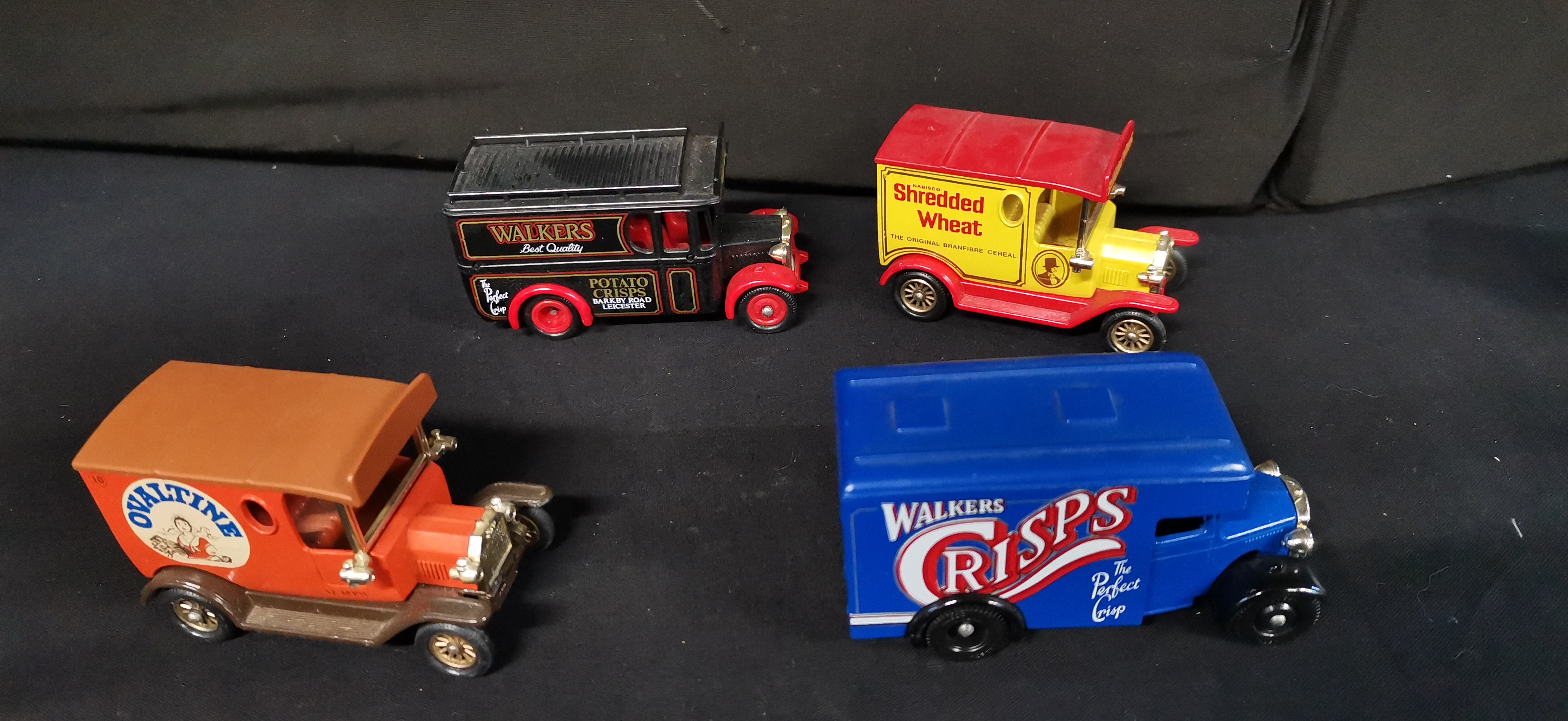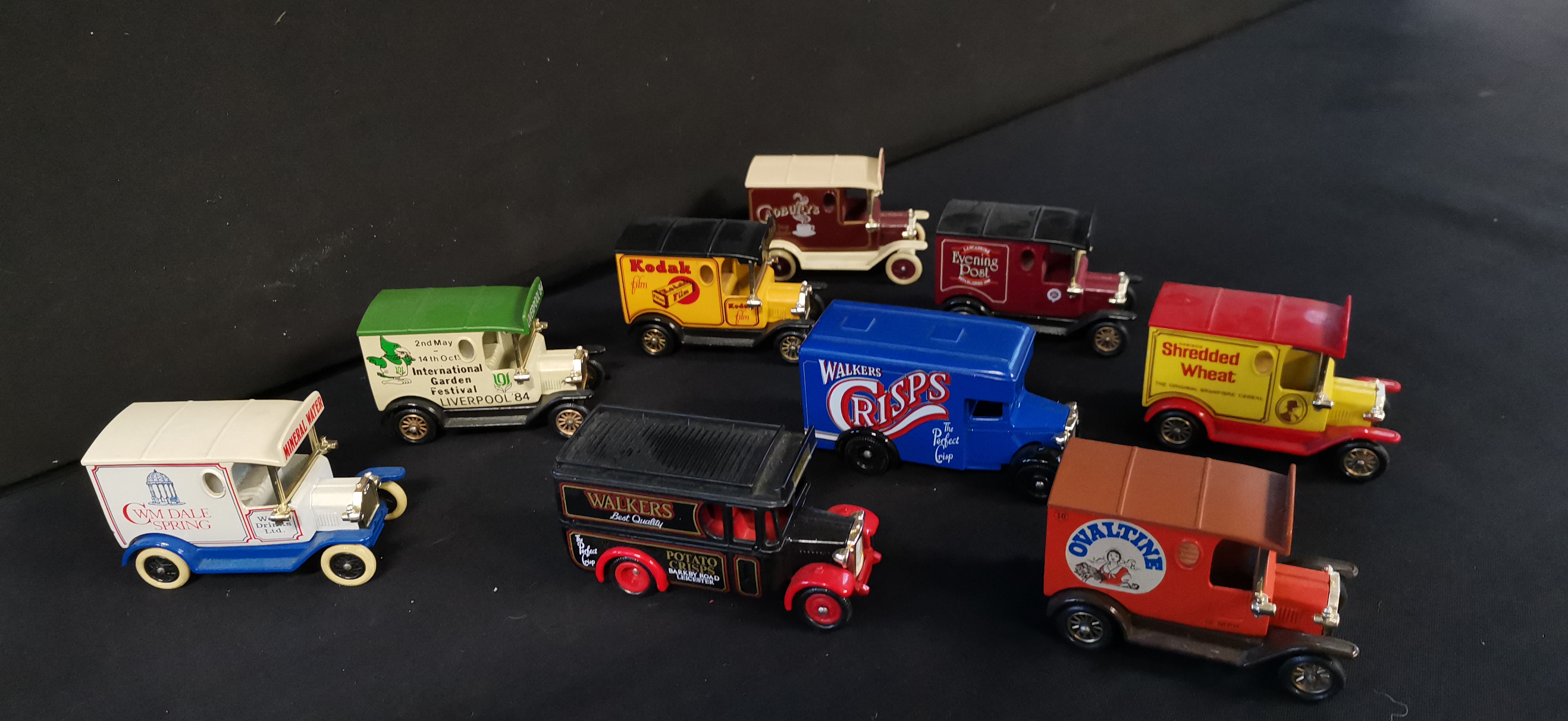 A collection of multi-coloured die-cast model delivery vans featuring various vintage brand advertisements including Walkers Potato Crisps, Shredded Wheat, and Kodak.