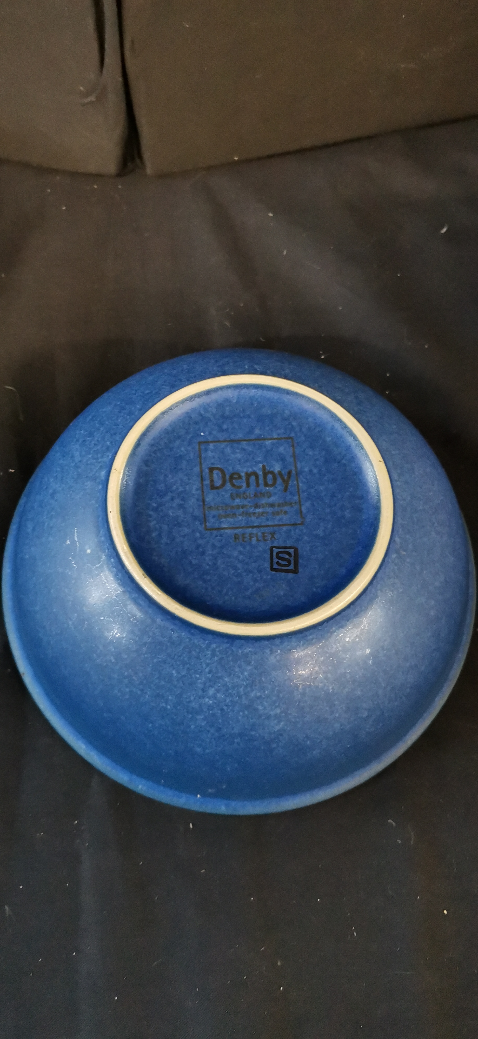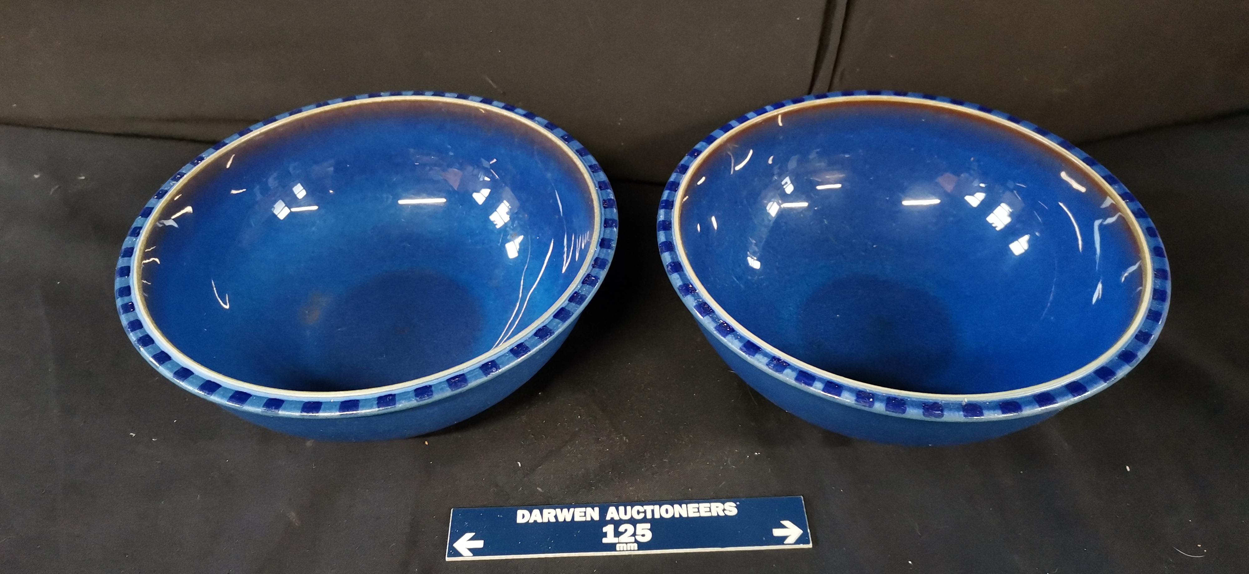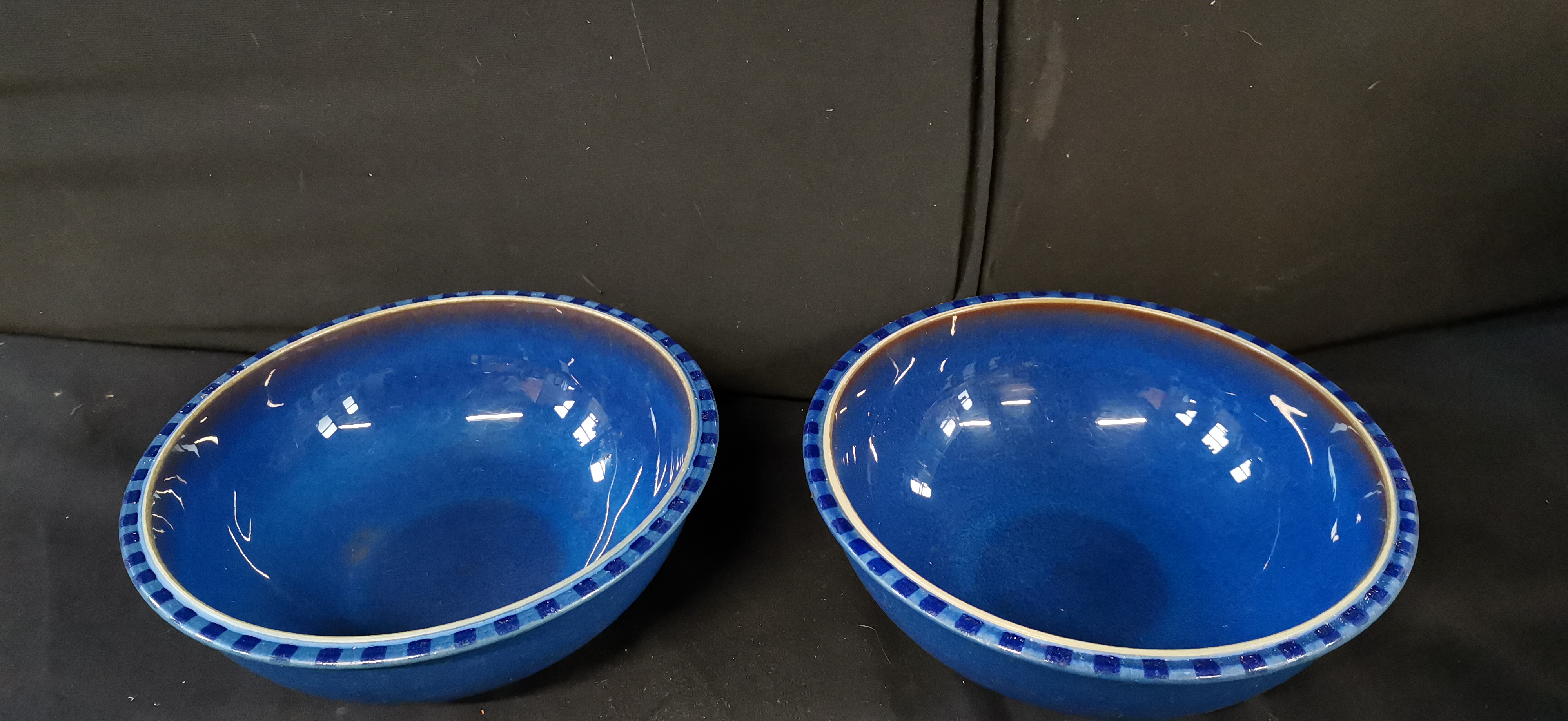A pair of blue glazed stoneware bowls with chequered rims, marked Denby England Reflex to the base, measuring approximately 210mm in diameter.