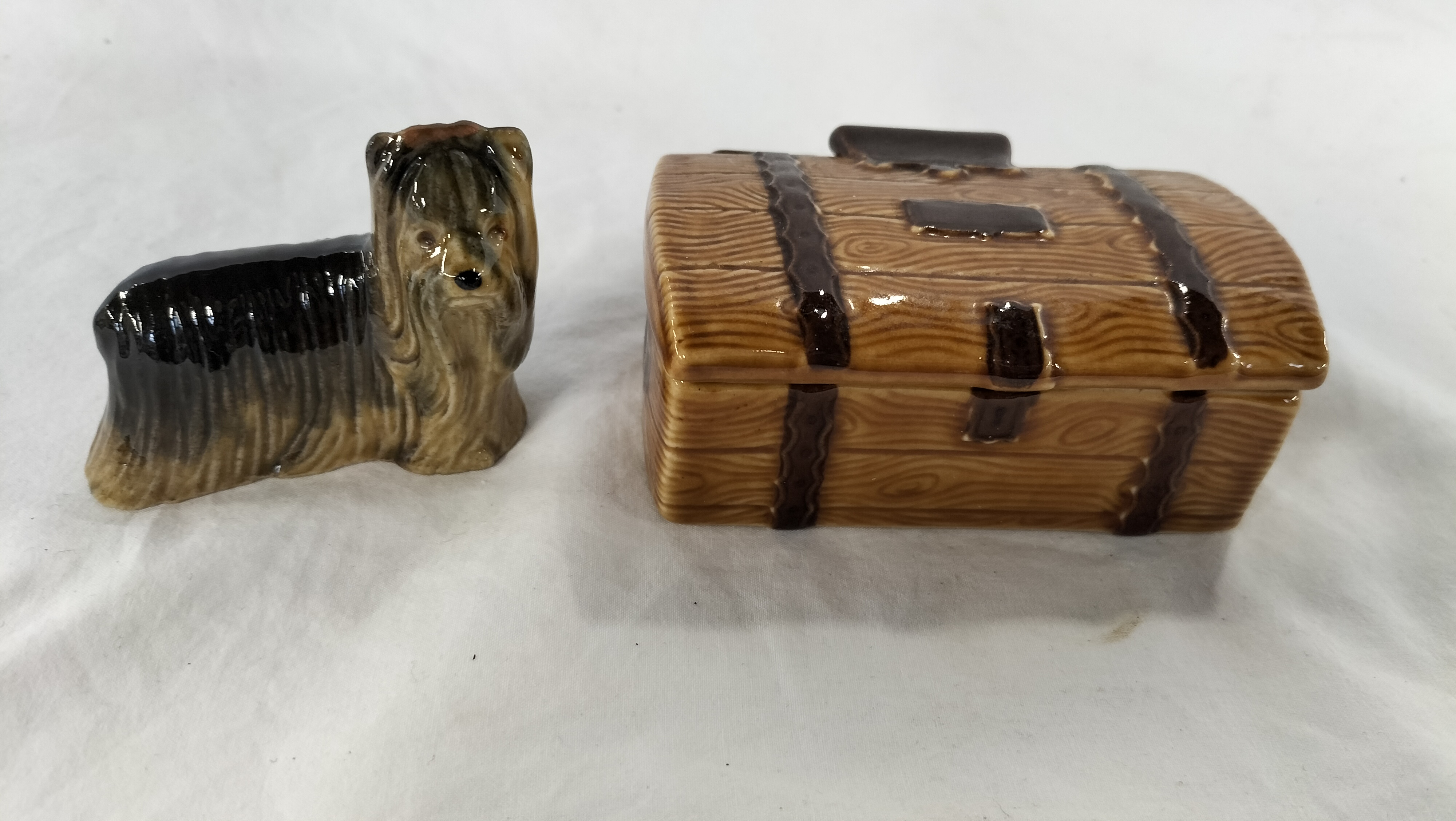 This lot comprises two miniature glazed ceramic items. The first is a figurine of a long-haired dog, resembling a Yorkshire Terrier or Skye Terrier, depicted in a standing position. The piece is finished in a high-gloss glaze with dark brown and tan tones. The lower edge of the base features the embossed mark MADE ENGLAND. The second item is a two-piece porcelain lidded trinket box moulded to resemble a wood-grain steamer trunk or suitcase. The design includes dark brown textured straps and a central handle. The underside of the base is embossed with the marks WADE, PORCELAIN, and MADE IN ENGLAND.
