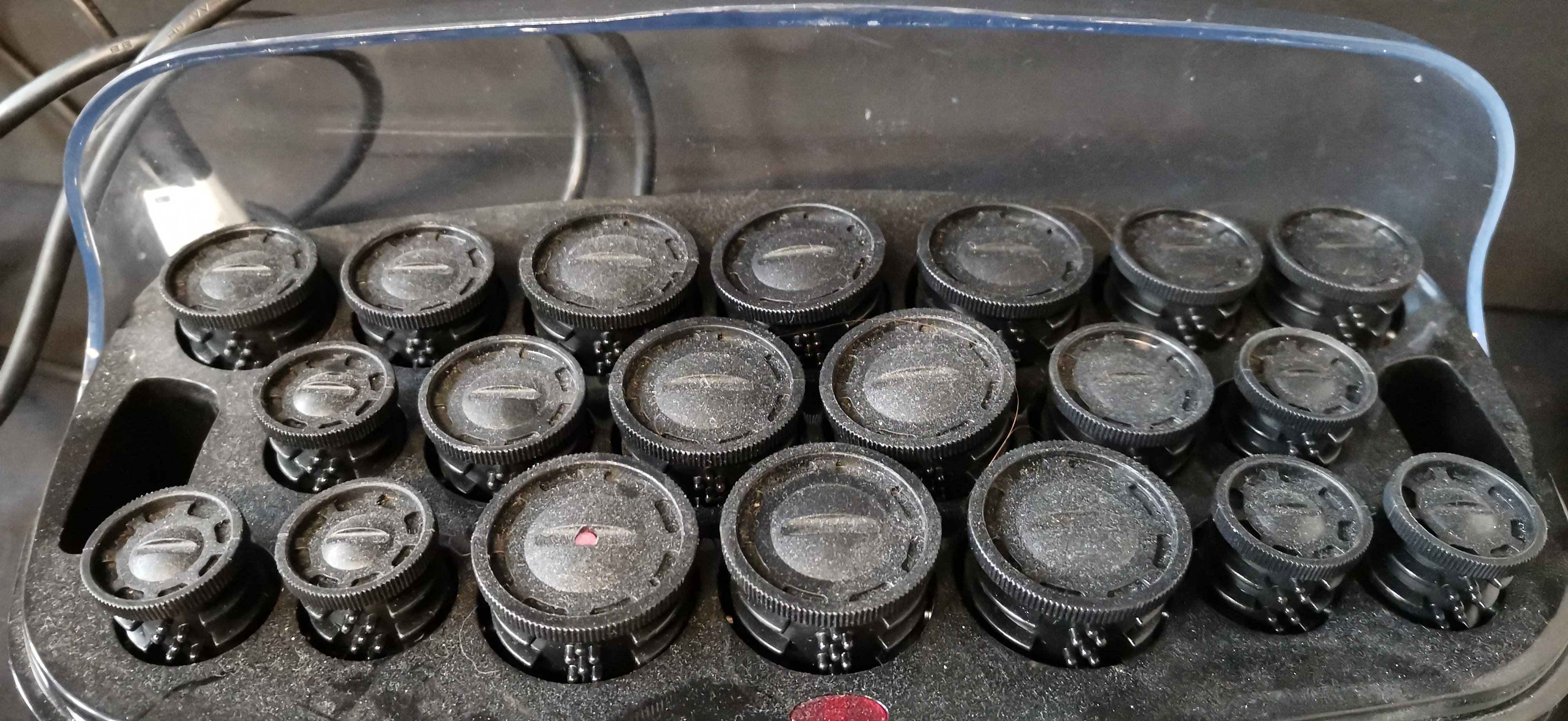A collection of black BaByliss thermo-ceramic heated hair rollers housed in a black base with a clear lid, marked Type R16b and Ref 3045U.