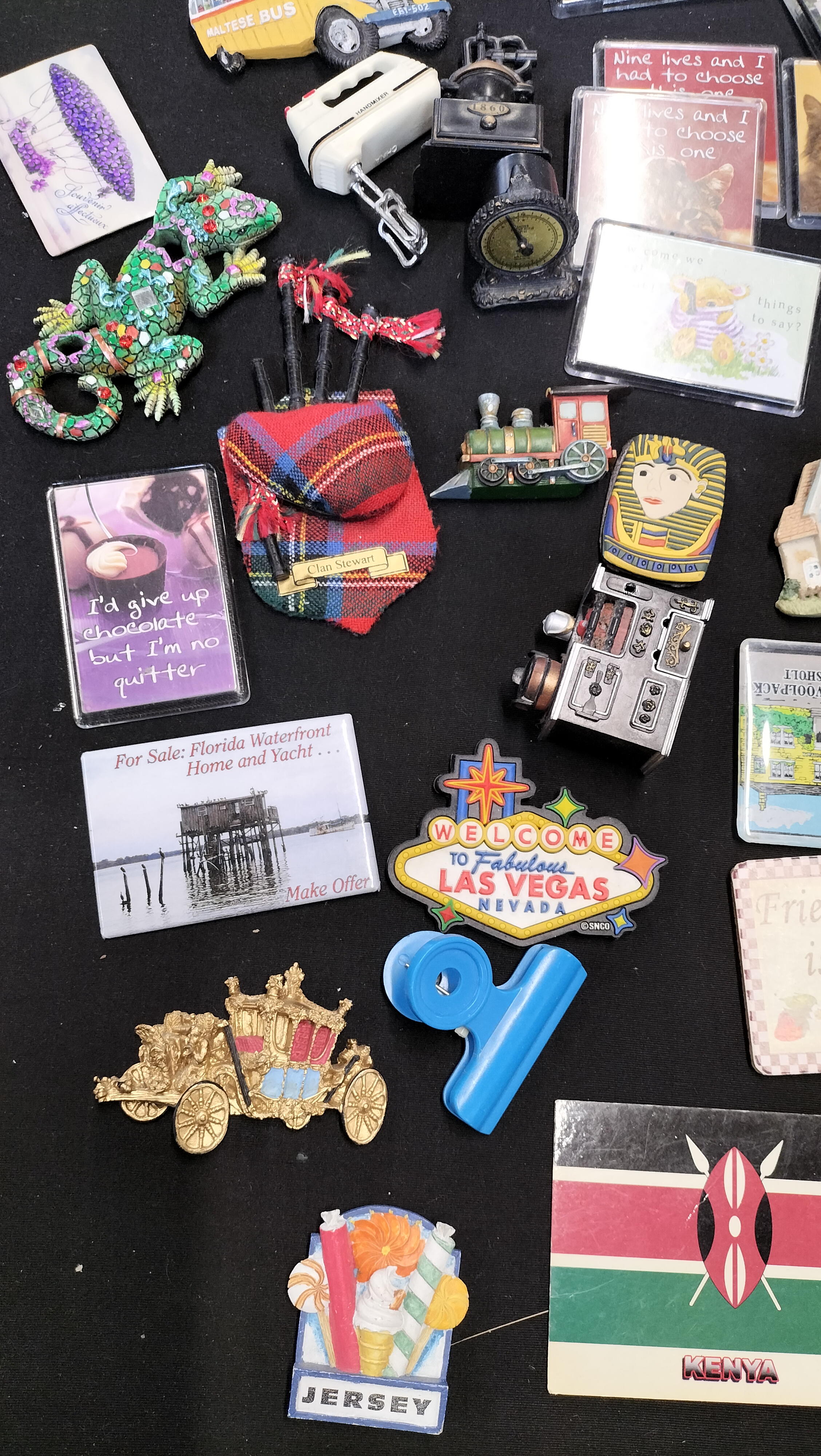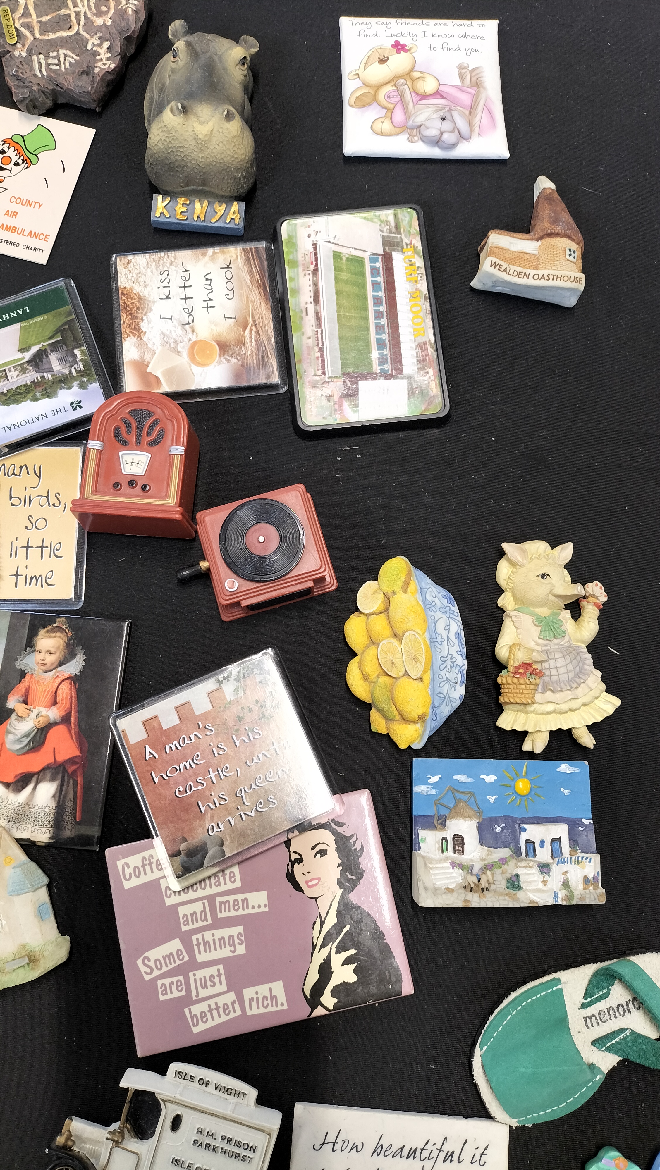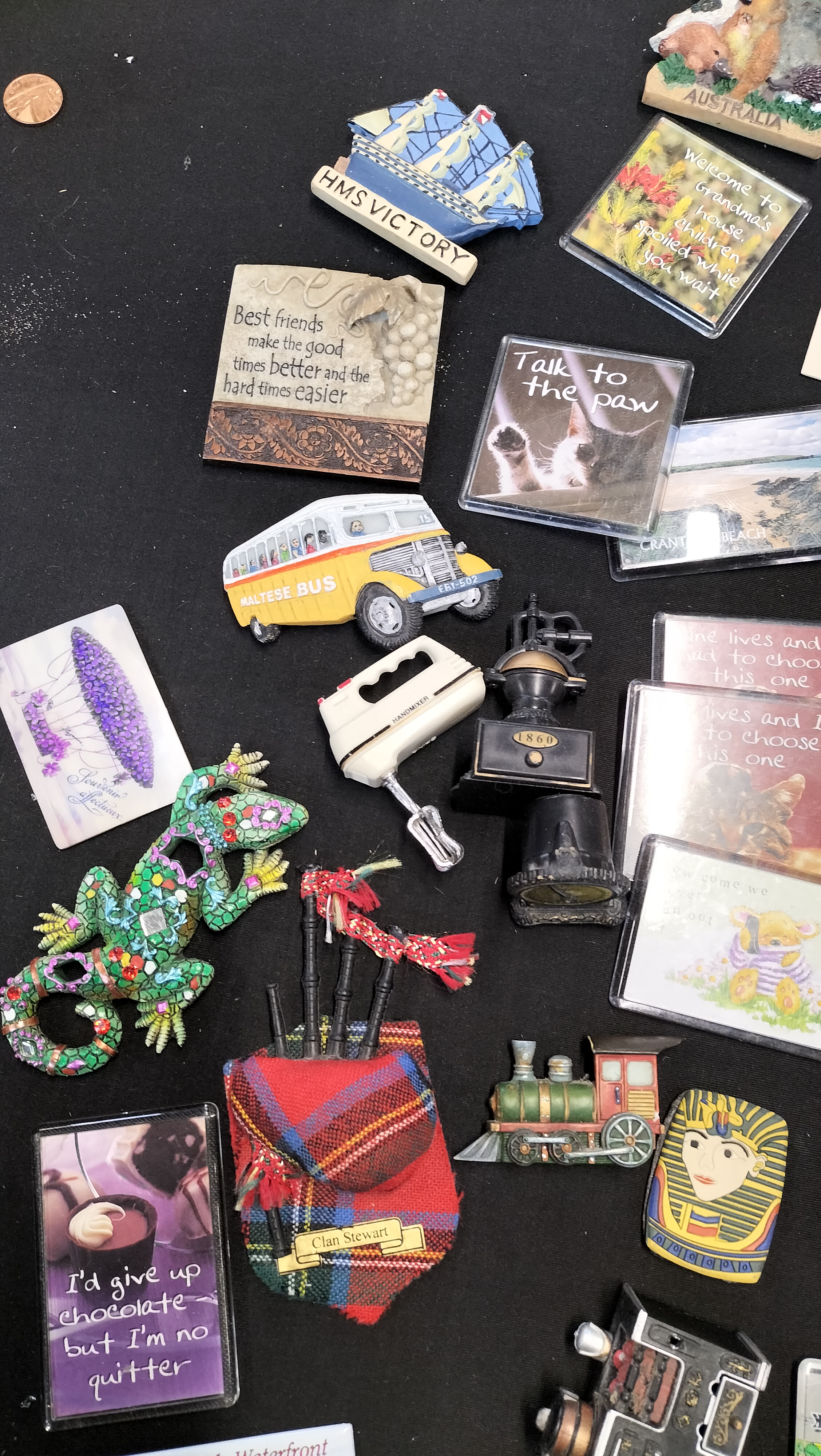 A collection of multi-coloured fridge magnets featuring various travel, animal, and humorous themes including locations such as Australia, Kenya, and Las Vegas.