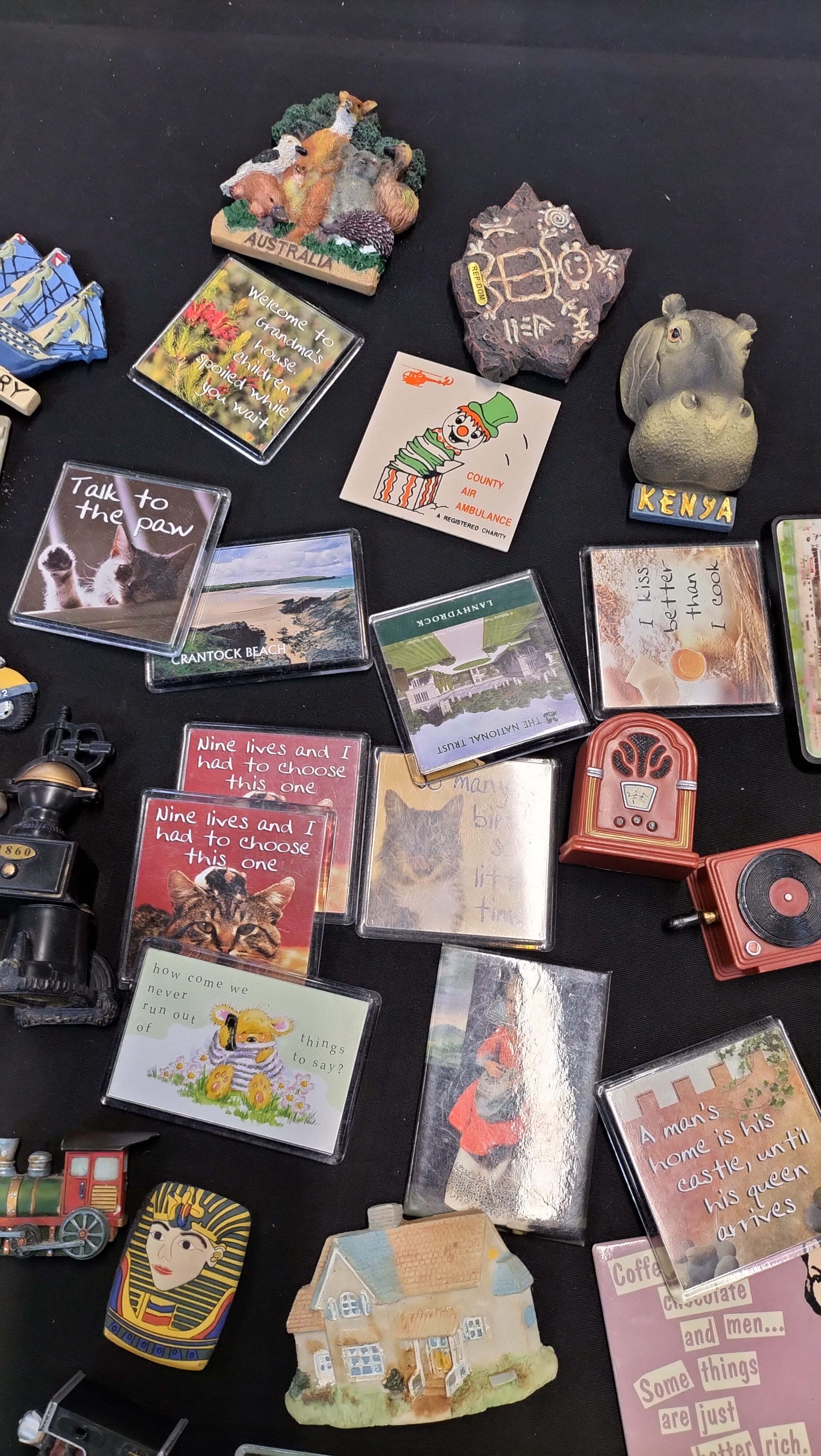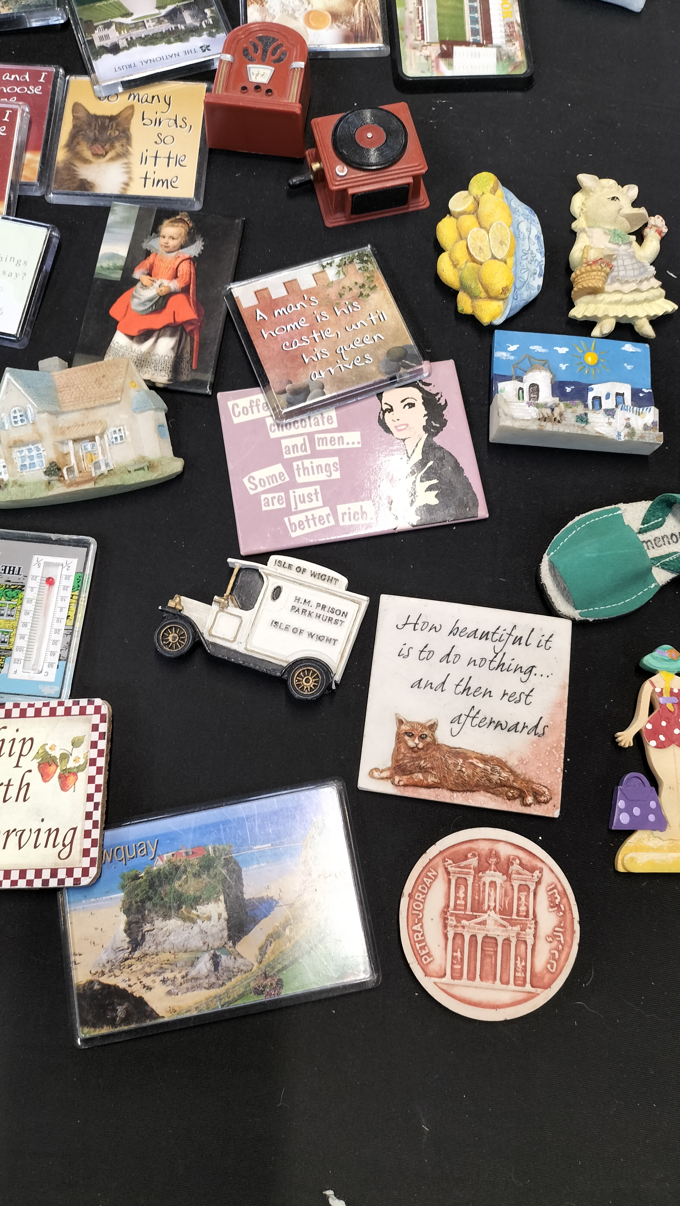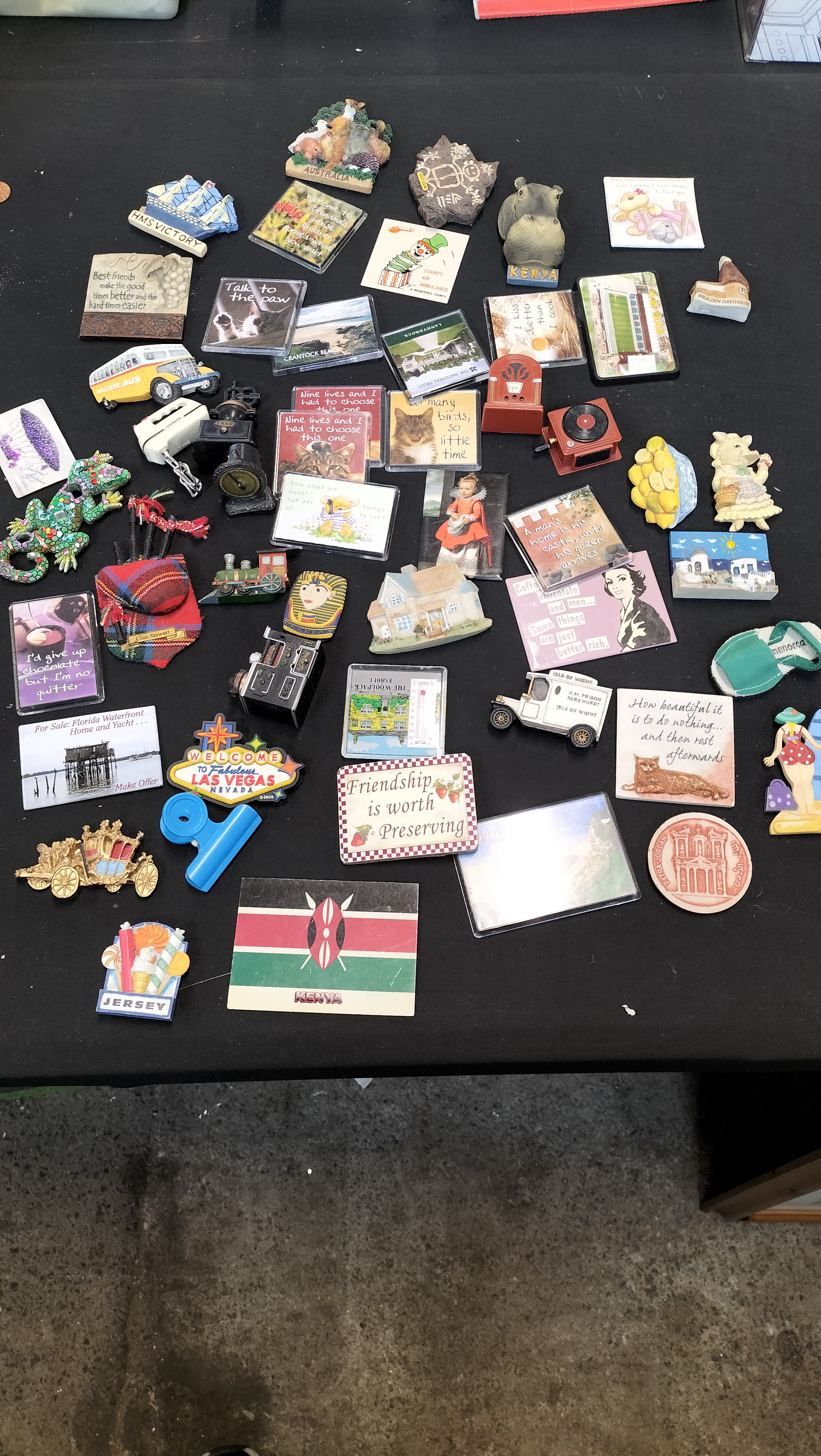 A collection of multi-coloured fridge magnets featuring various travel, animal, and humorous themes including locations such as Australia, Kenya, and Las Vegas.