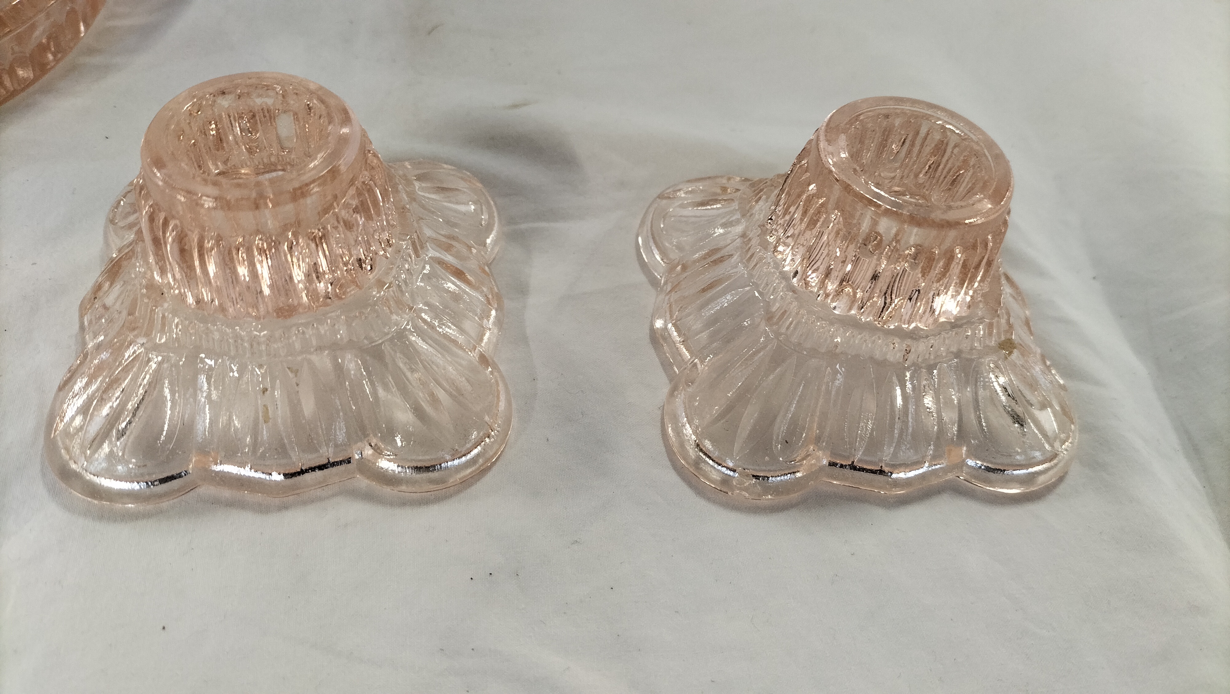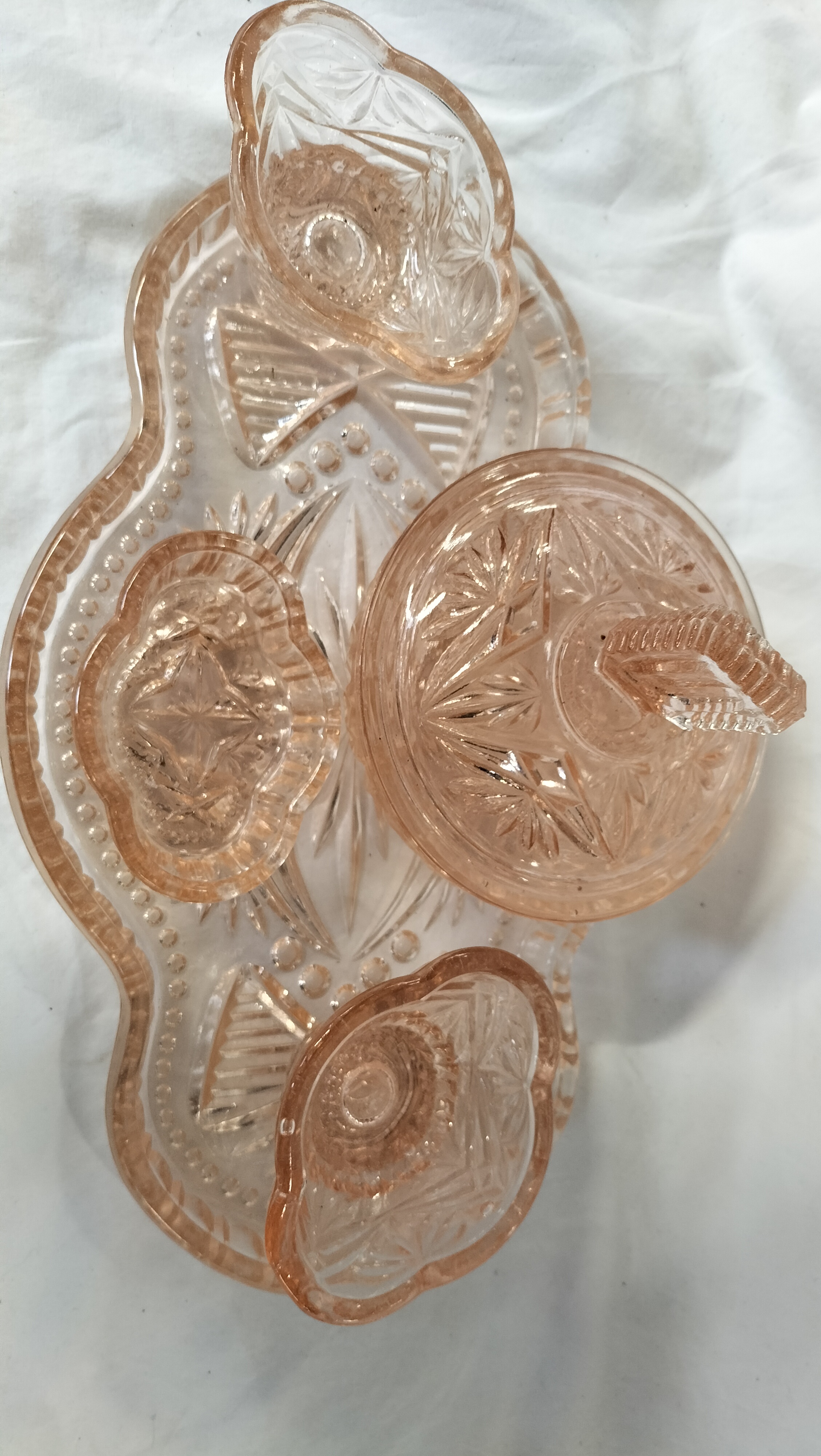 A set of pink pressed glass dressing table items featuring Art Deco inspired geometric and starburst patterns. The collection is crafted from translucent rose-tinted glass and includes a shaped tray with a beaded rim and central sunburst motif, a lidded trinket jar with a raised finial handle, footed dishes, an oval trinket dish, and square-based candlestick holders with fluted sides. The pieces exhibit uniform colouration throughout. No maker’s marks or signatures are present.
