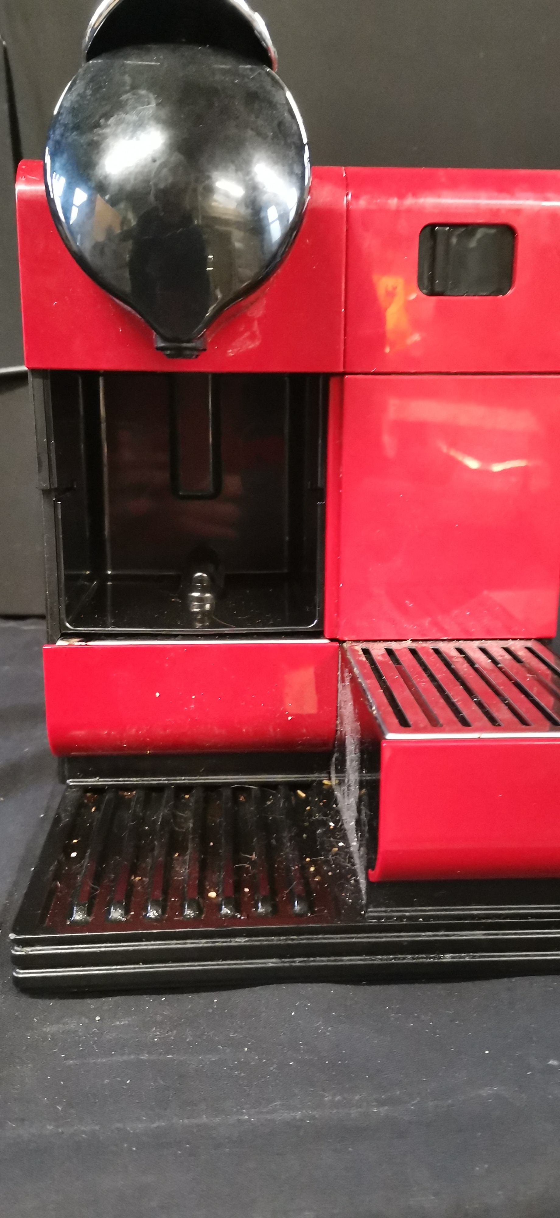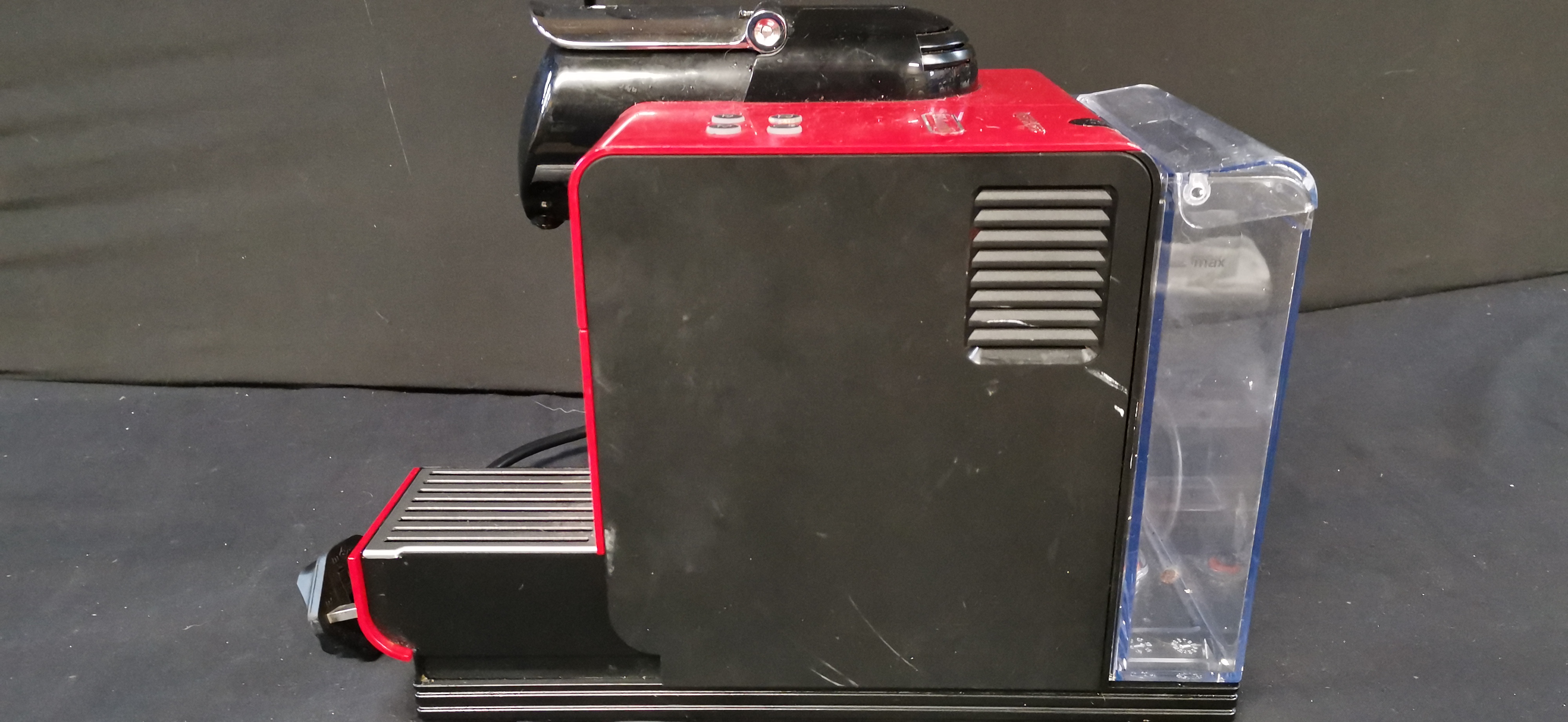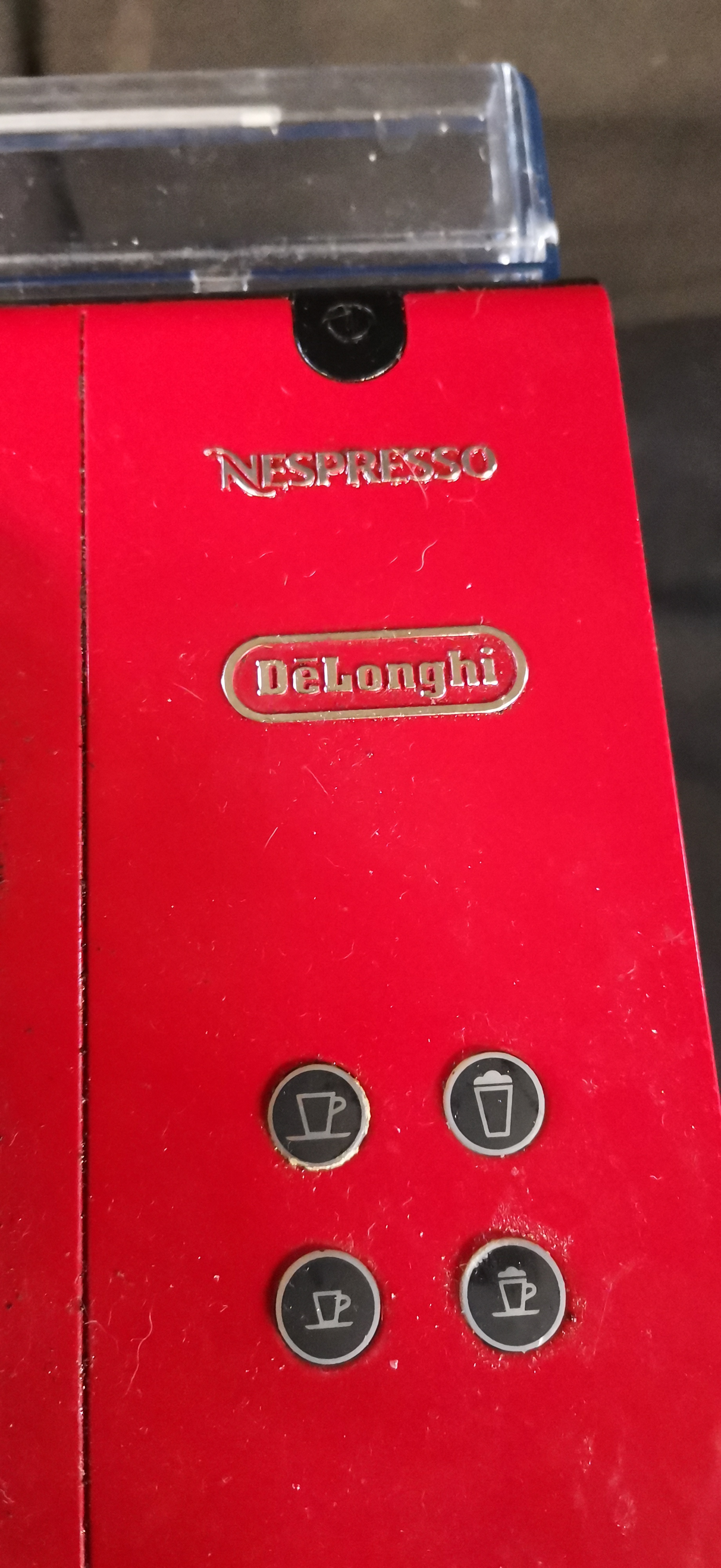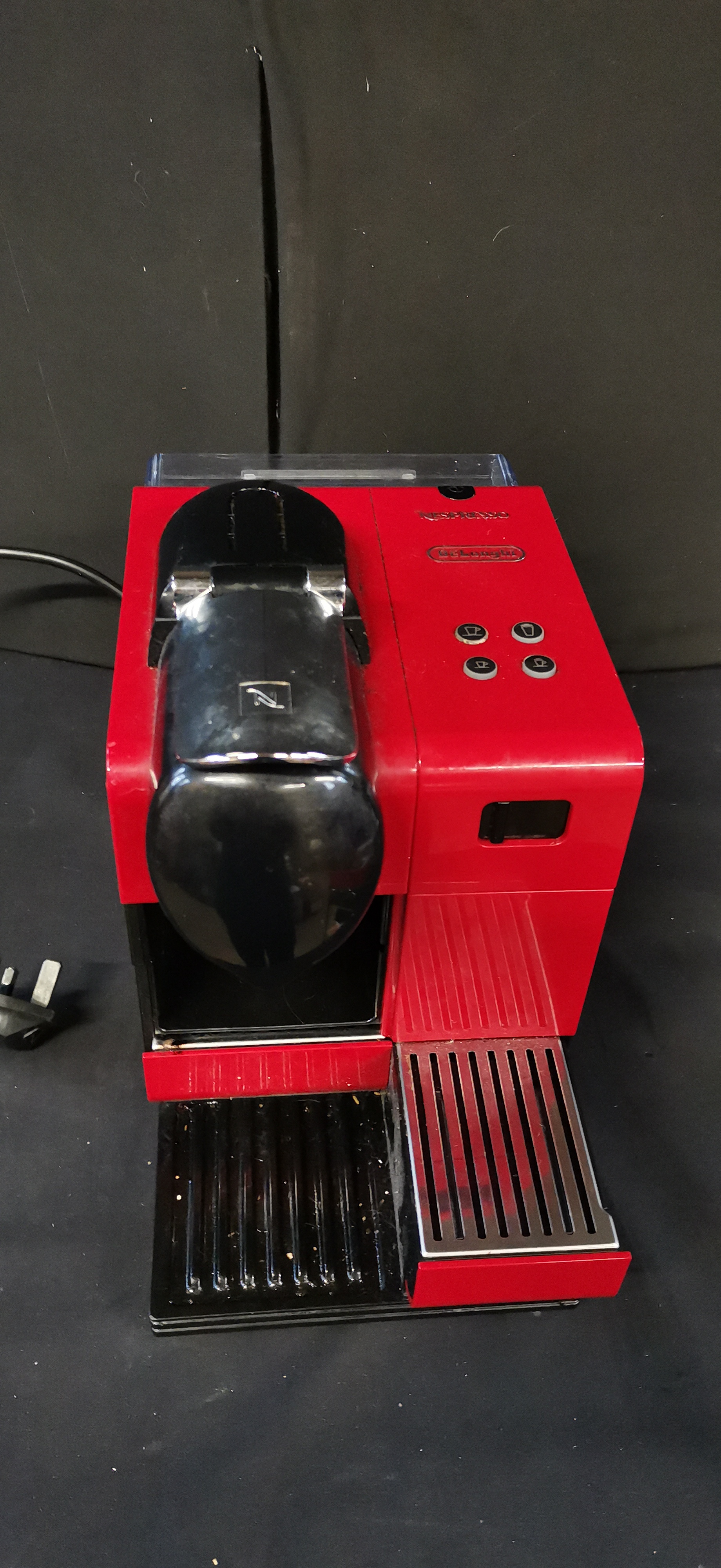 A red and black DeLonghi Nespresso Lattissima Plus espresso machine, type EN520.R, manufactured in Italy with a removable water tank.
