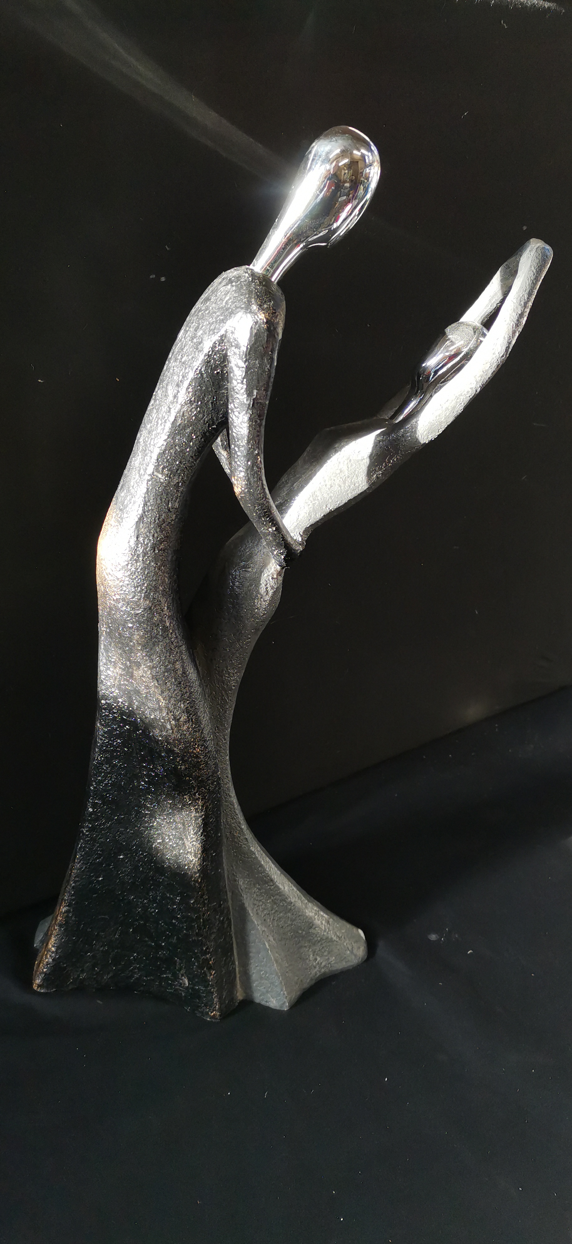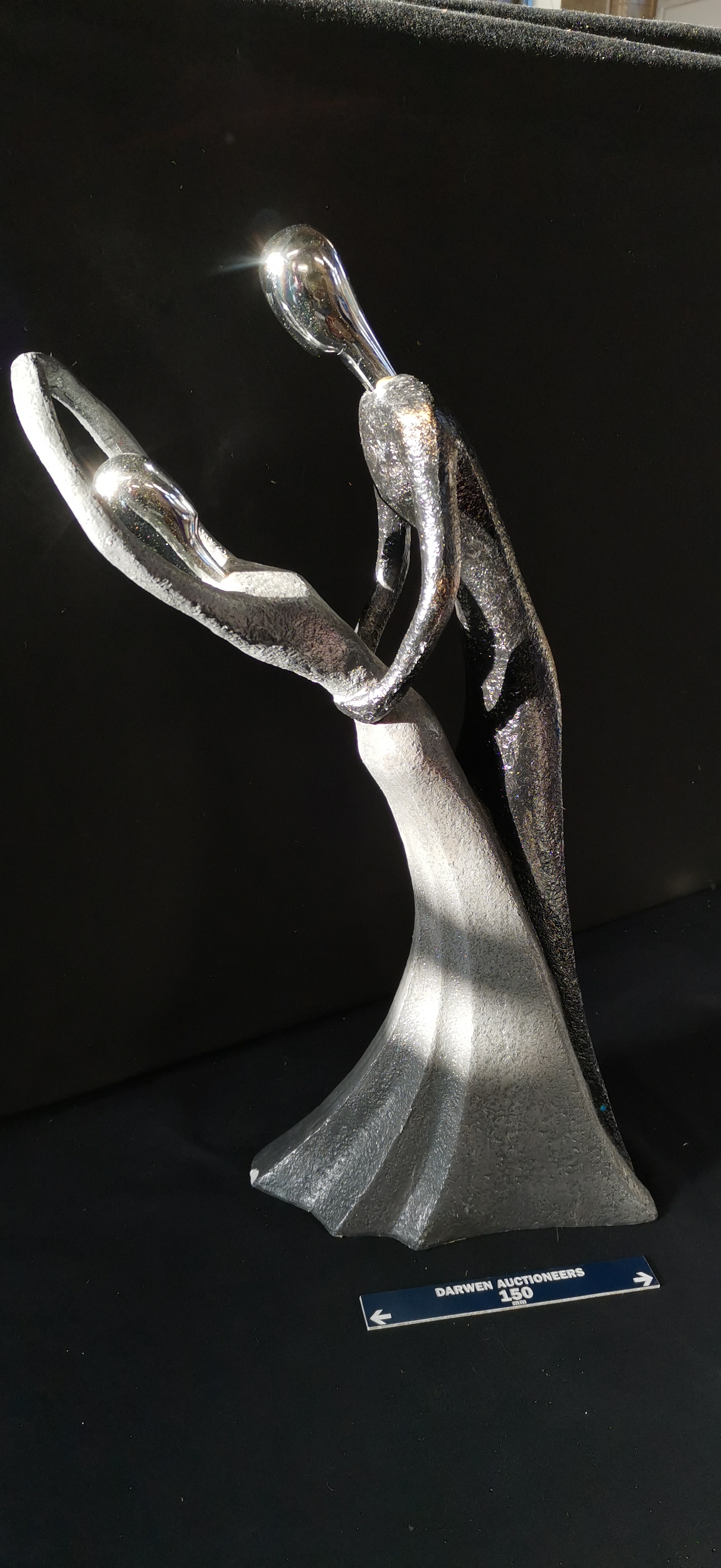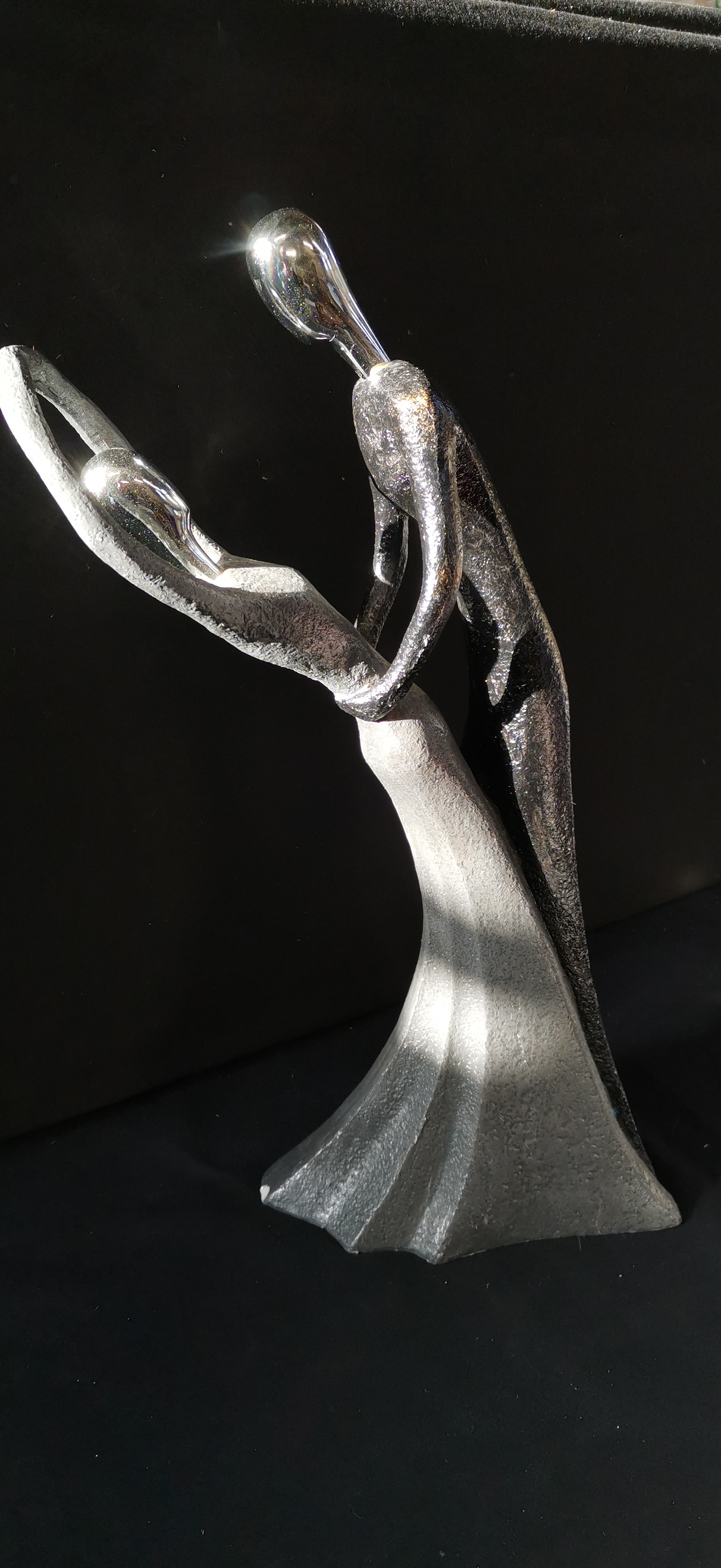 A modern figurative sculpture featuring two stylised figures with textured silver, black, and bronze finishes and polished chrome heads, measuring approximately 450 mm in height.
