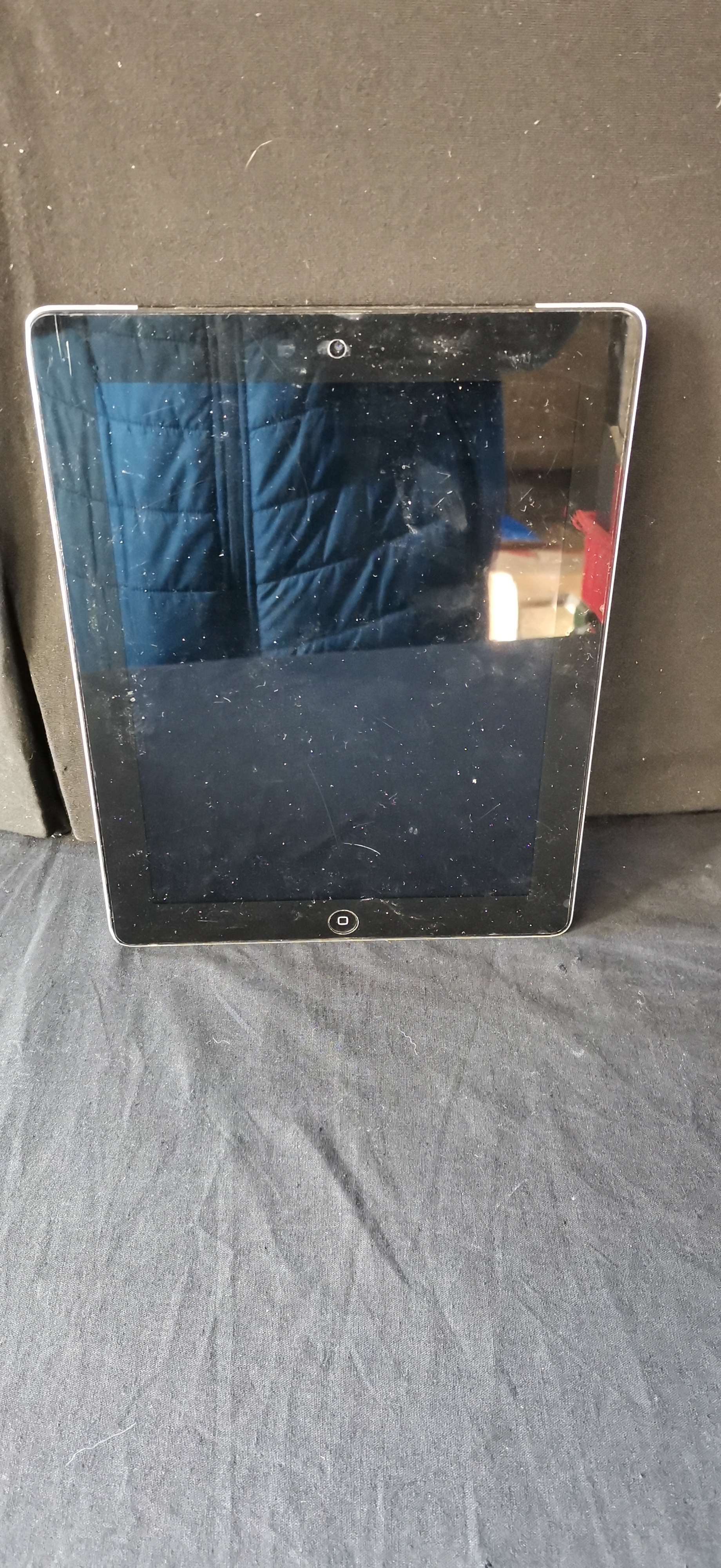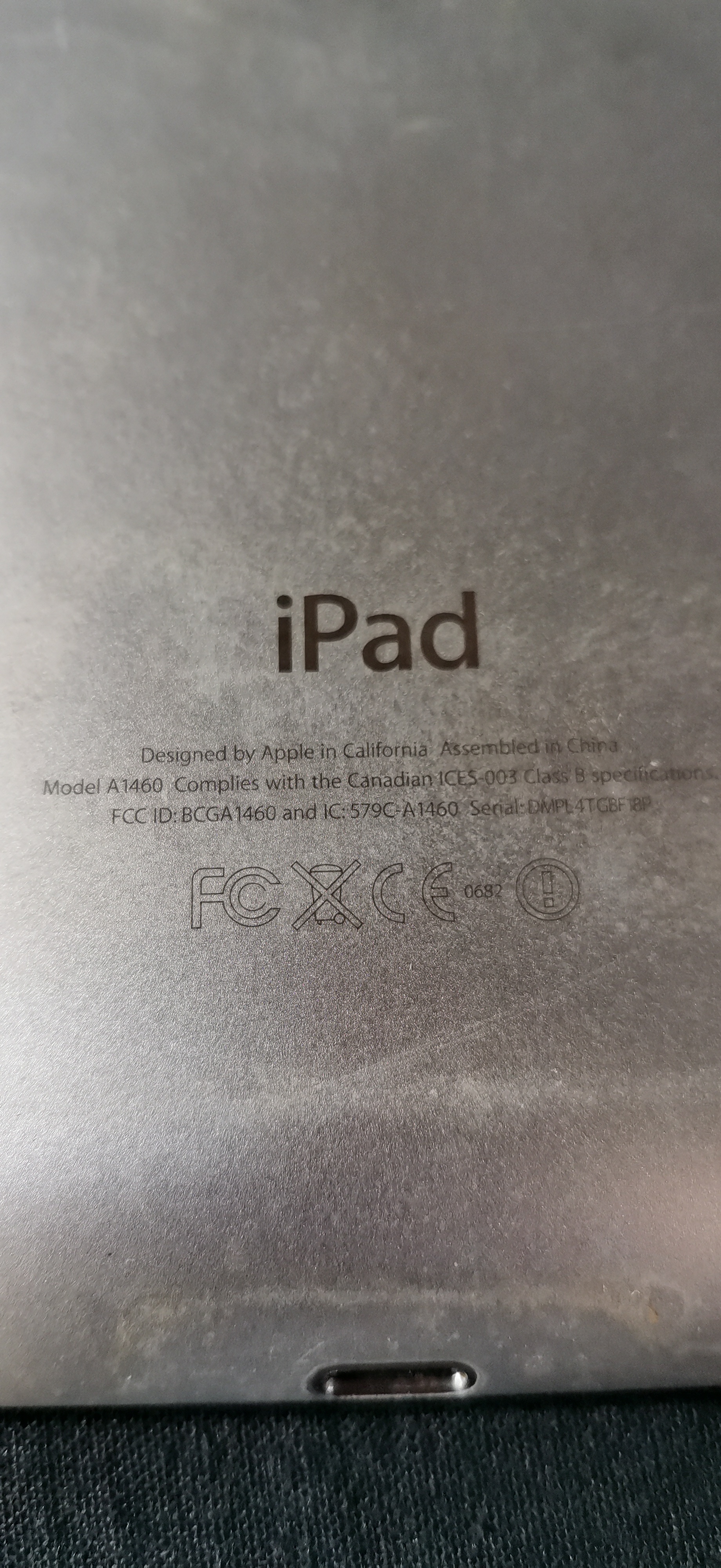 A silver and black Apple iPad tablet, model A1460, featuring a black bezel and silver-tone casing with serial number DMPL4TGBF18P.