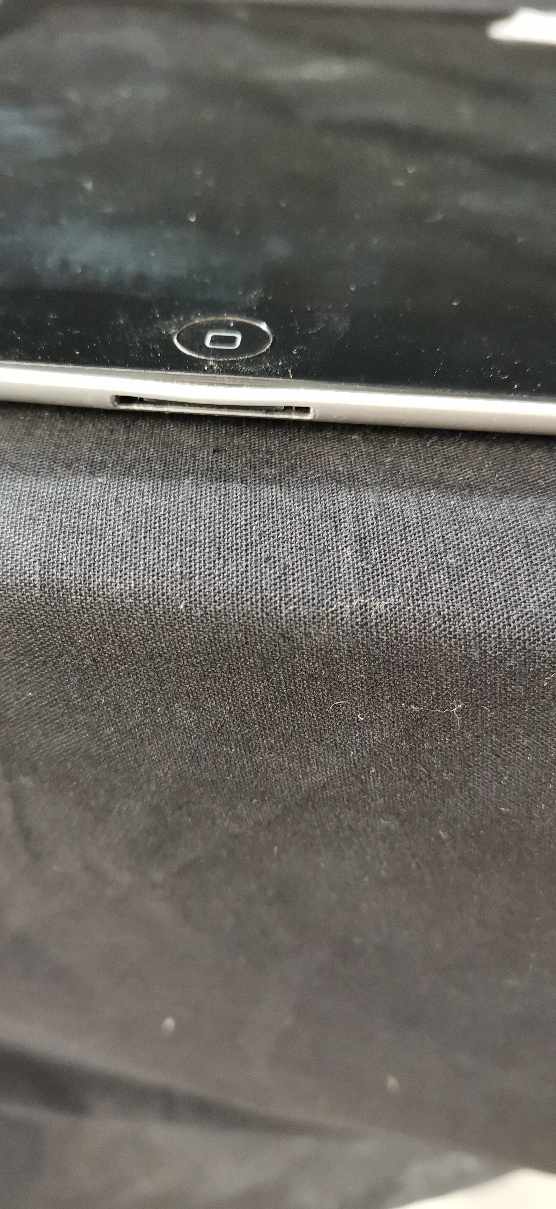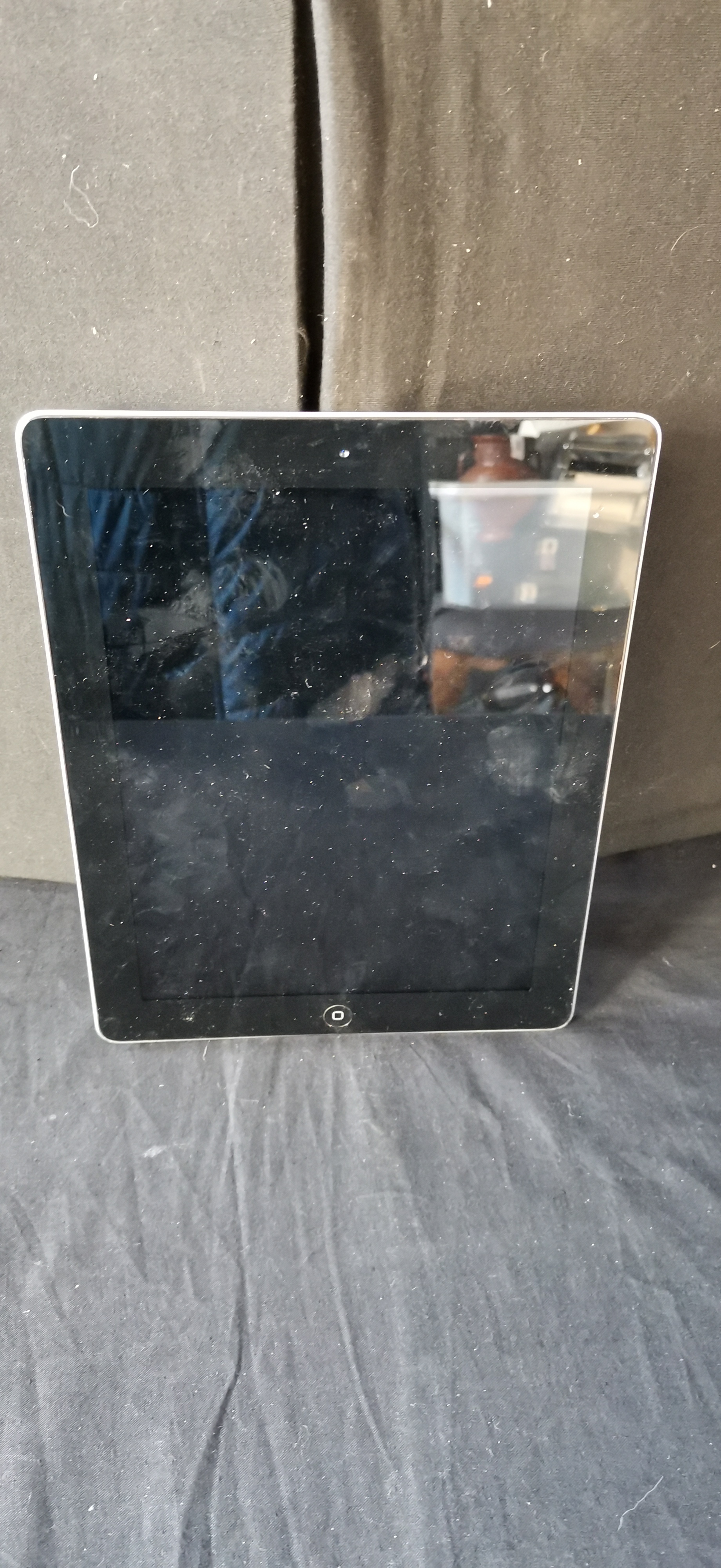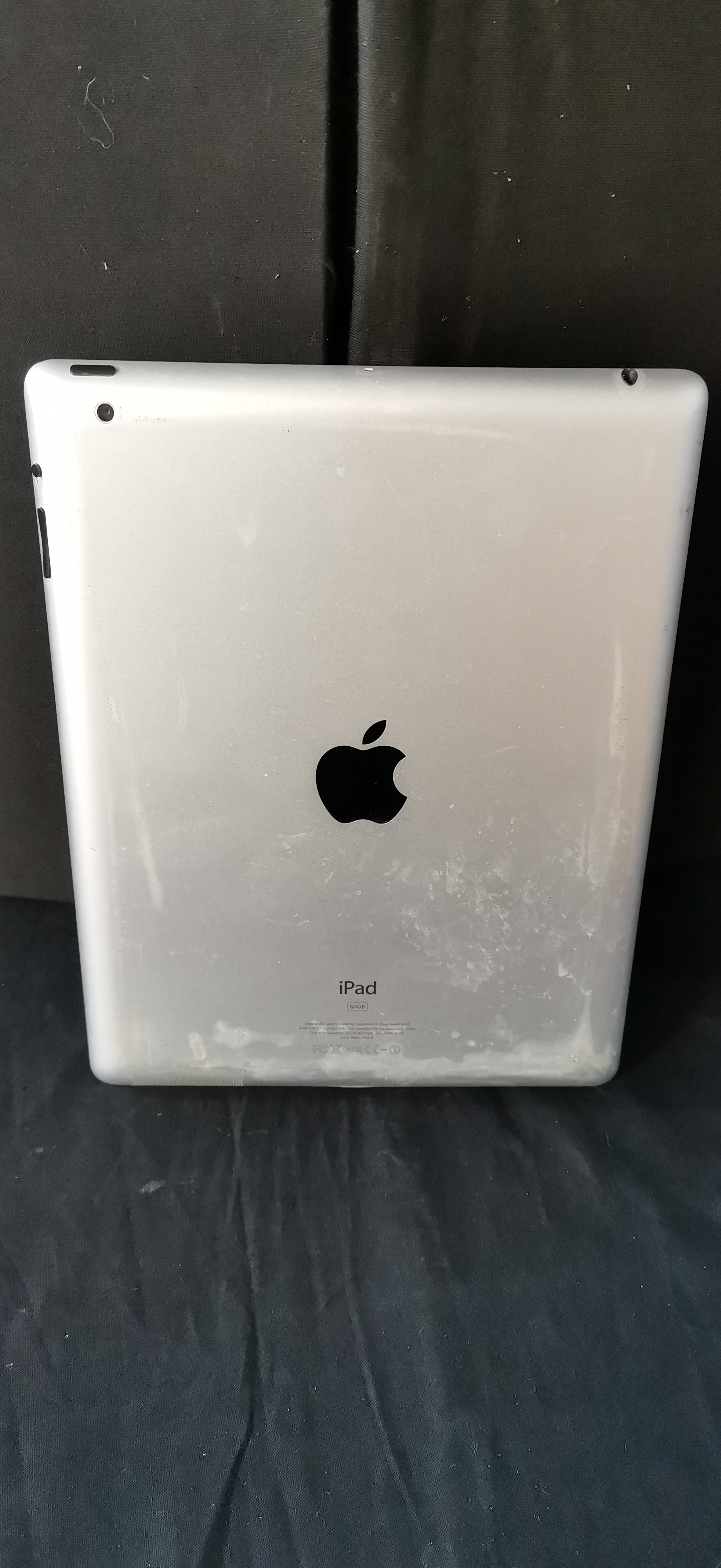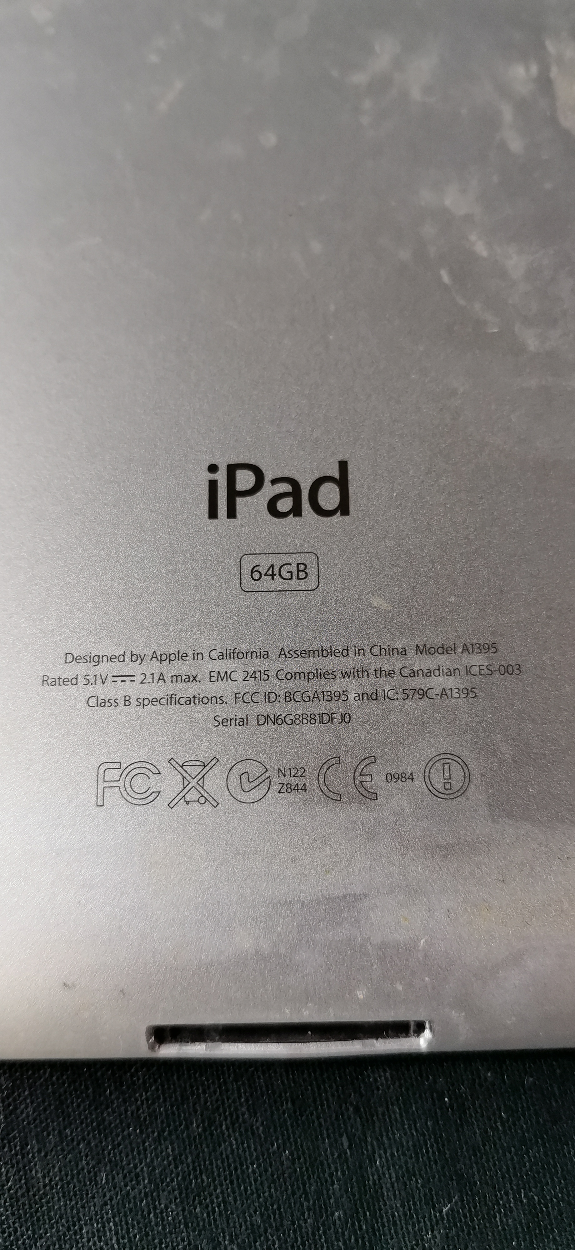A silver-coloured Apple iPad tablet featuring a black front face, 64GB of storage, model number A1395, and serial number DN6G8B81DFJ0.