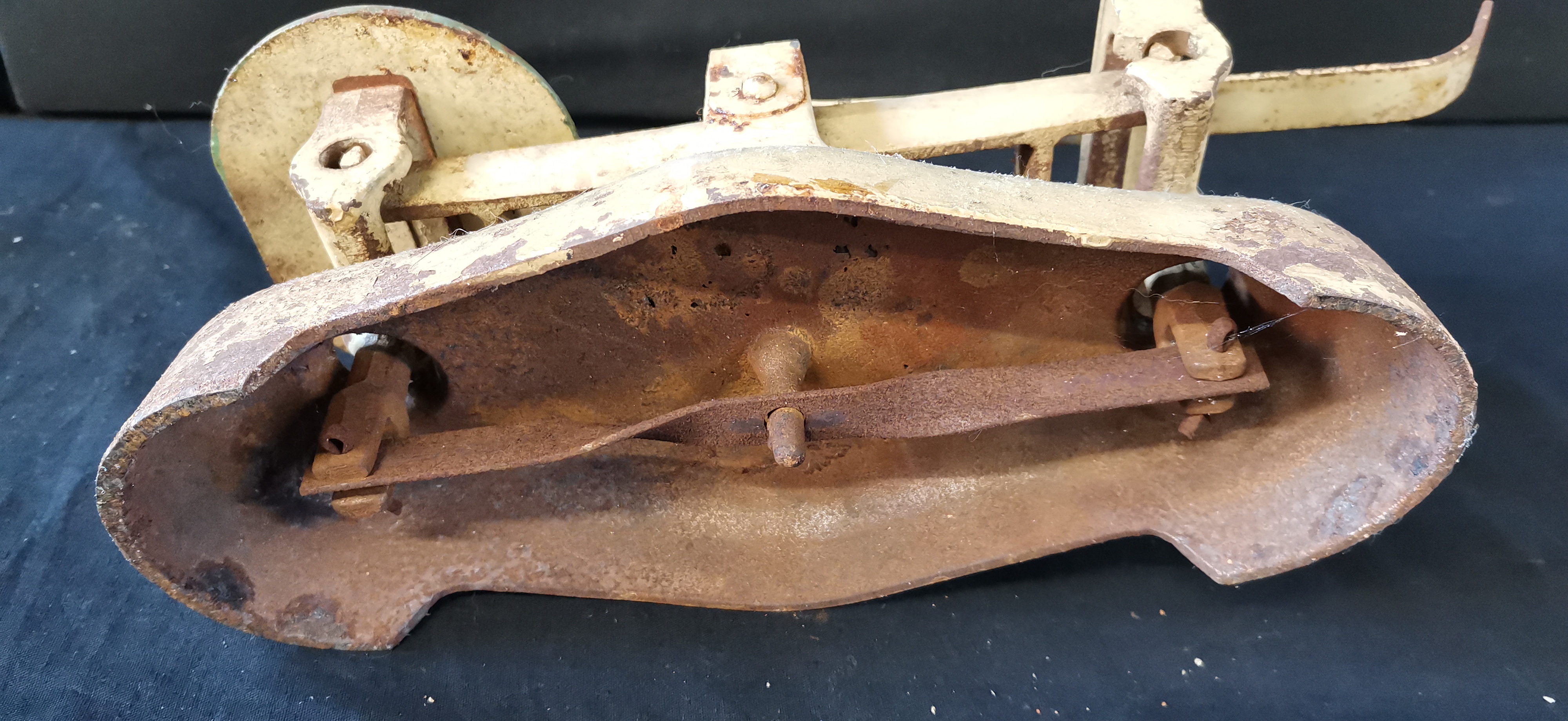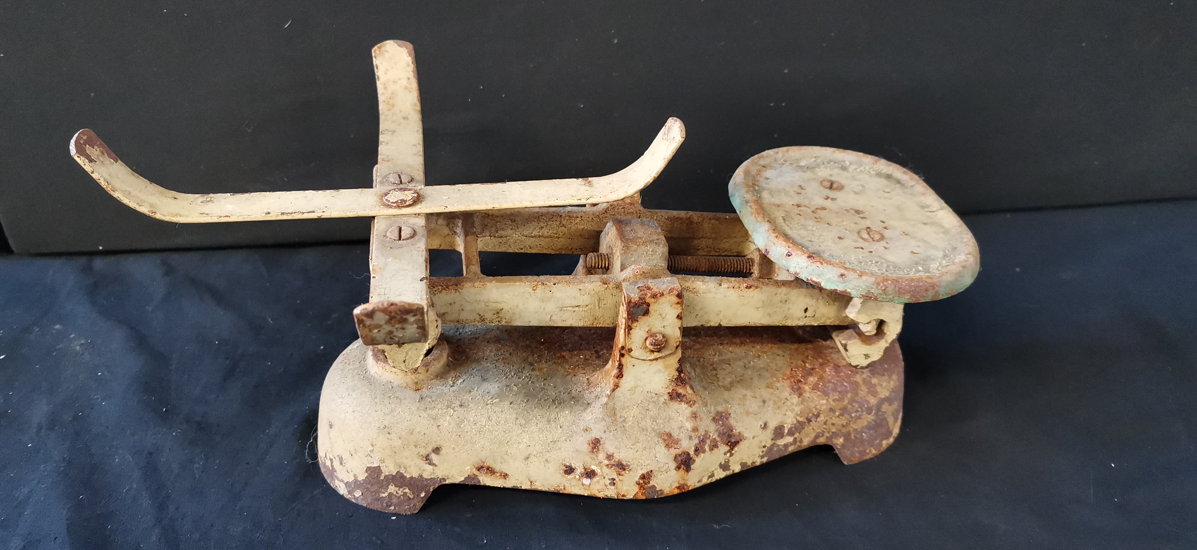 A vintage cream-colored mechanical metal balance scale featuring a cast iron base and platform with heavy overall rust and no visible maker’s marks.