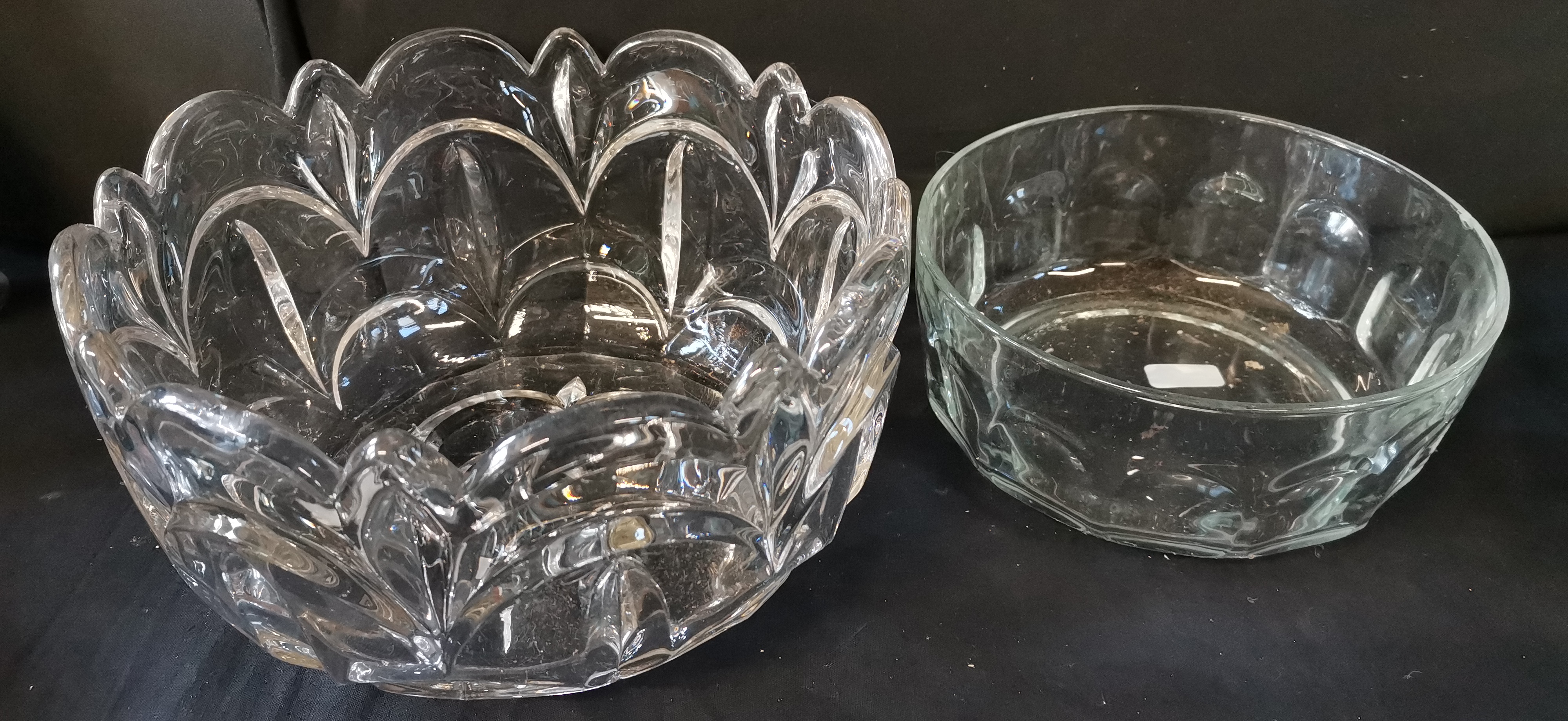 Two clear glass bowls comprising a large Marquis by Waterford Sweet Memories cut-glass bowl with a scalloped edge and a smaller round glass bowl.