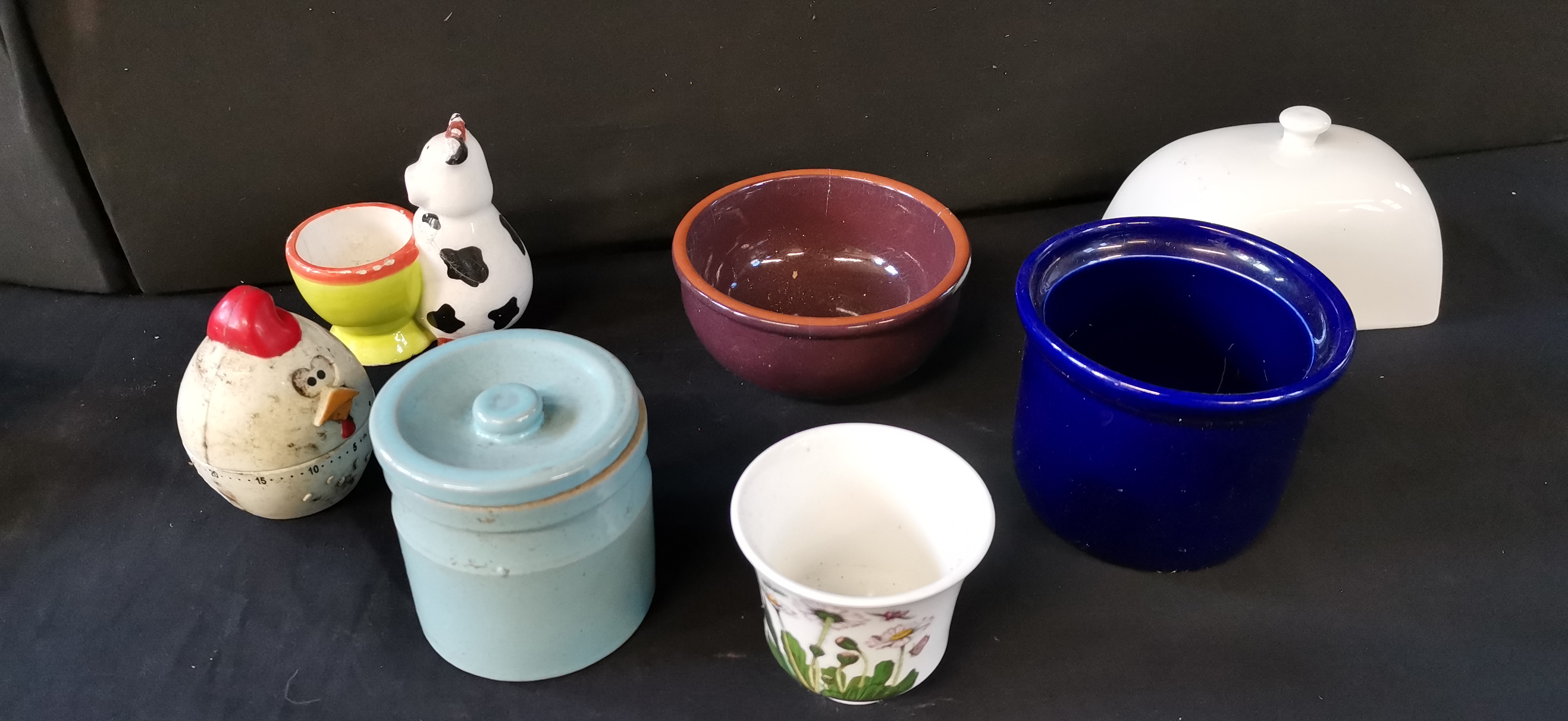 A collection of ceramic items including a chicken-shaped timer, a cow figurine, various bowls, and lidded stoneware butter crocks in various colours.