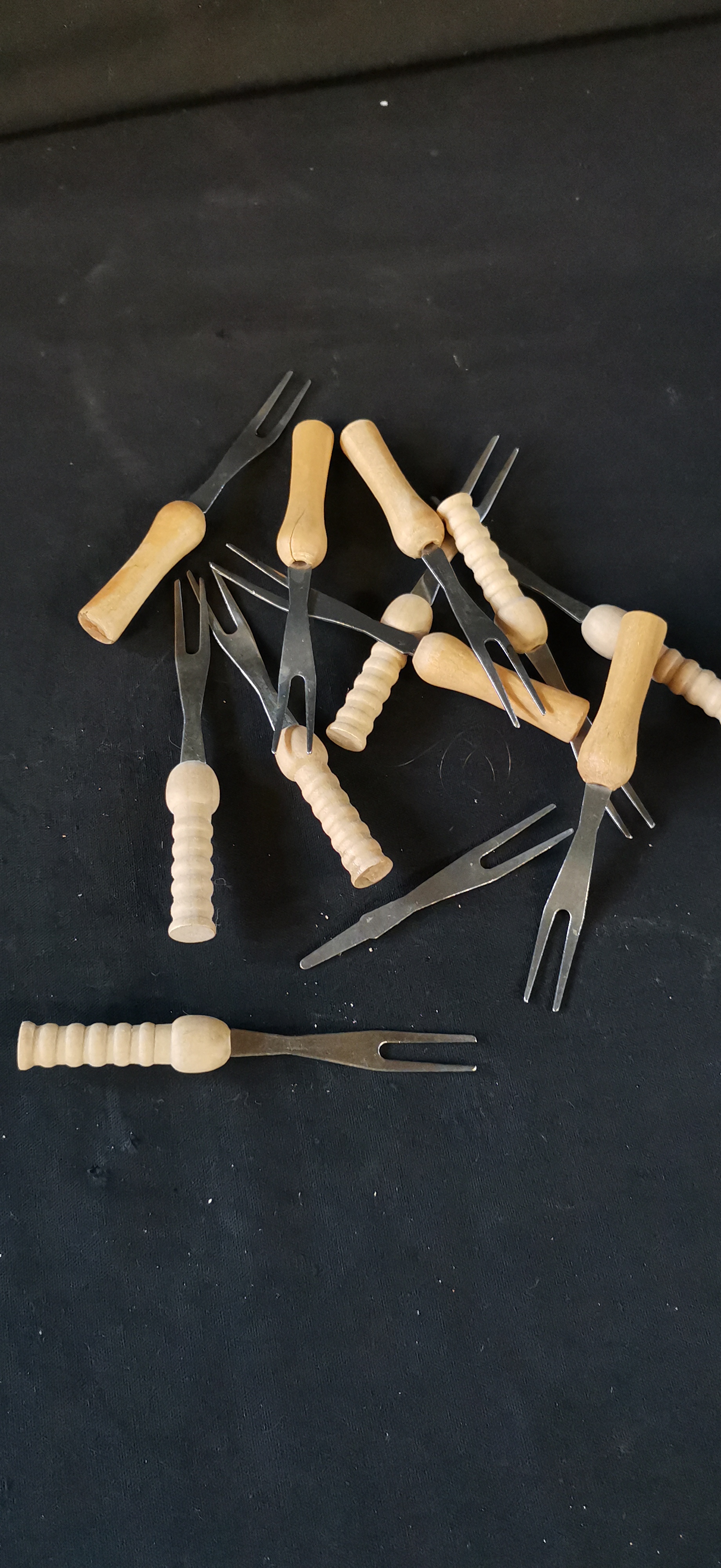 A collection of small two-pronged forks featuring metal heads and light-coloured wooden handles in both smooth and ribbed designs.