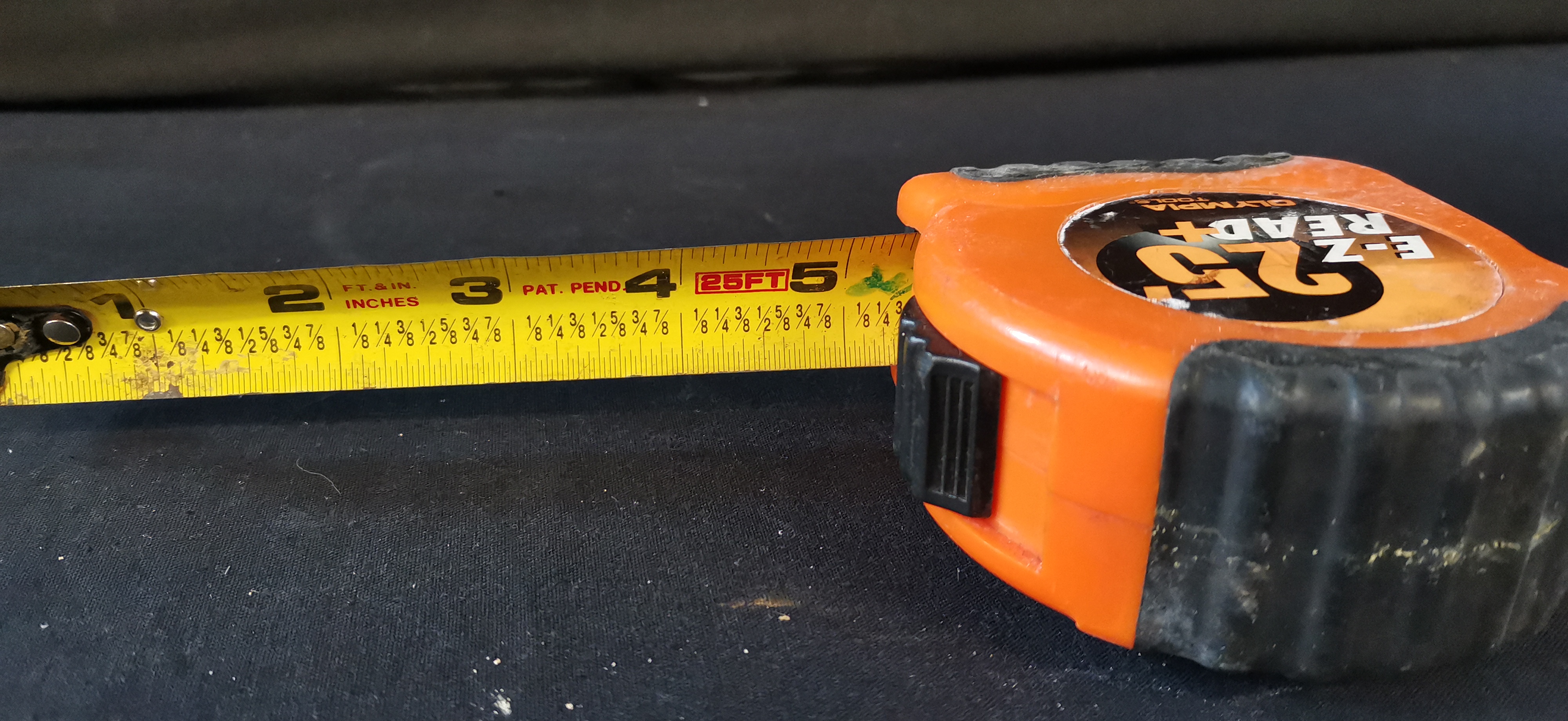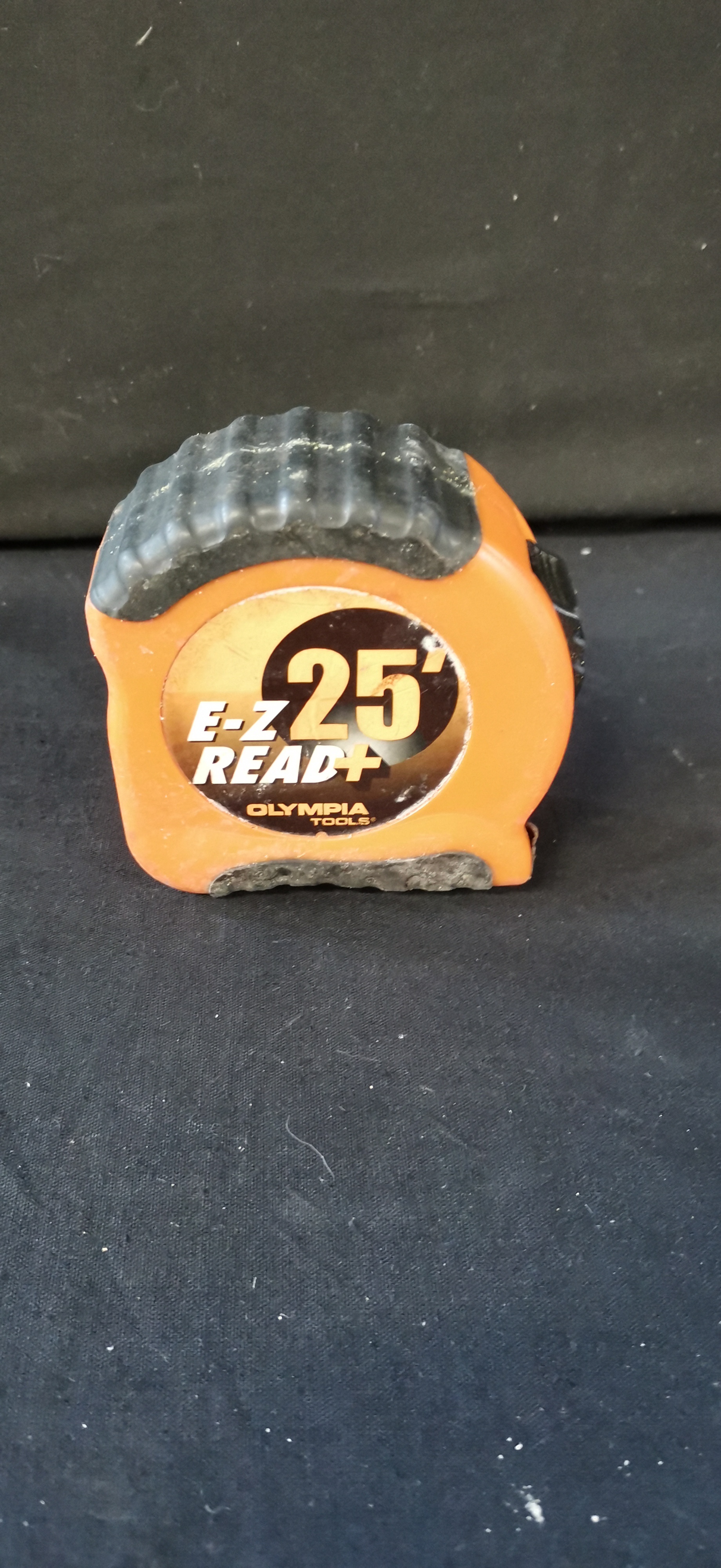 An orange and black Olympia Tools E-Z Read+ 25-foot tape measure featuring a yellow steel blade and a belt clip marked Taiwan.