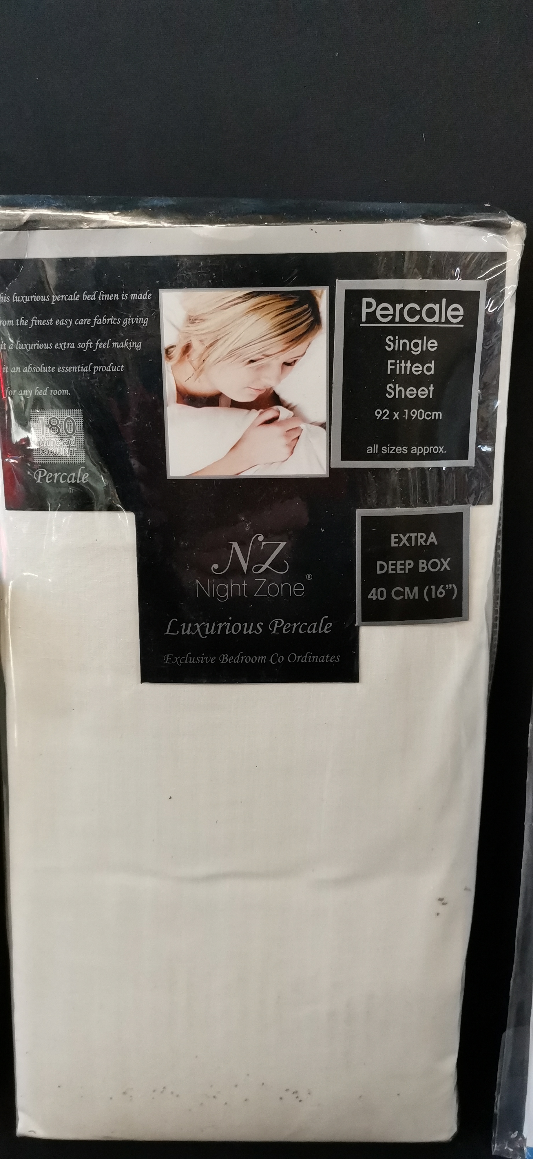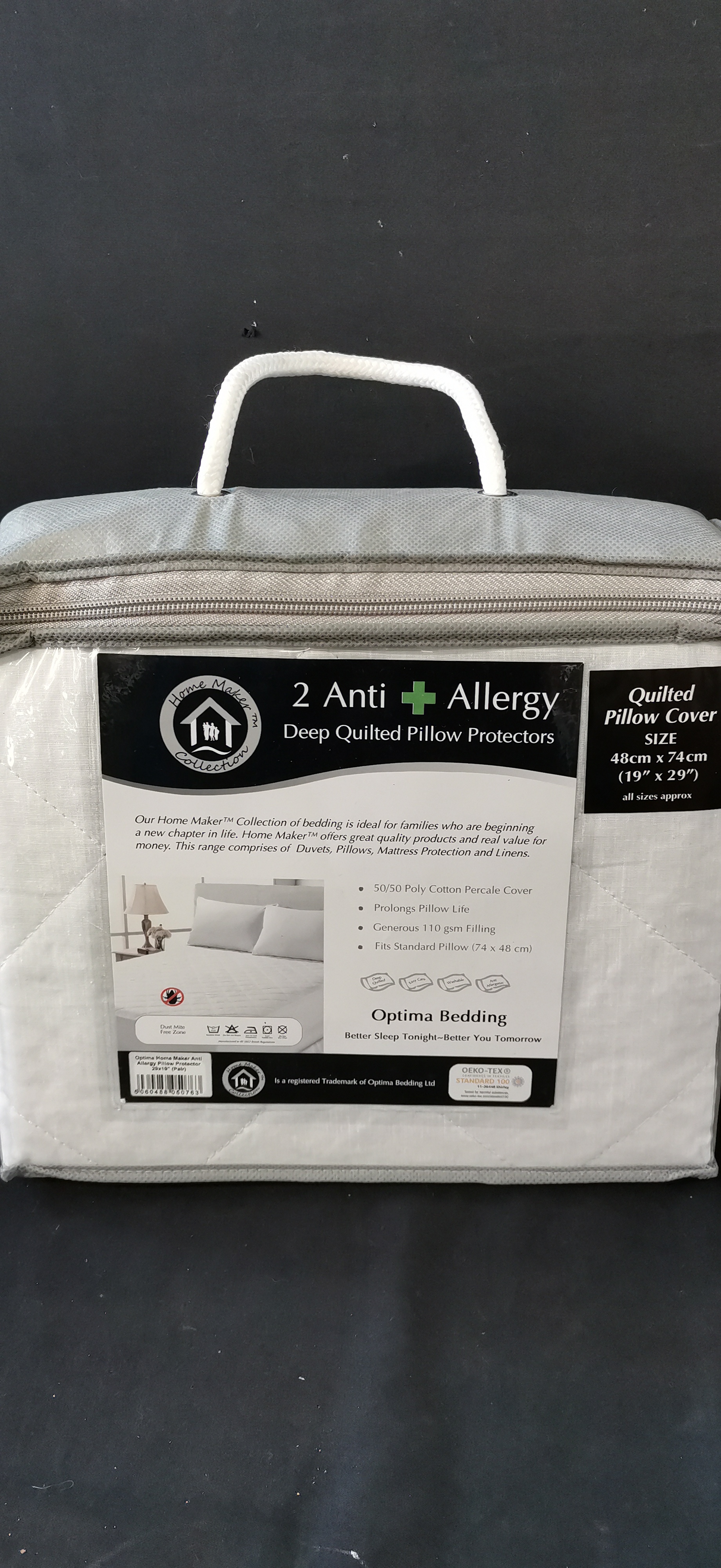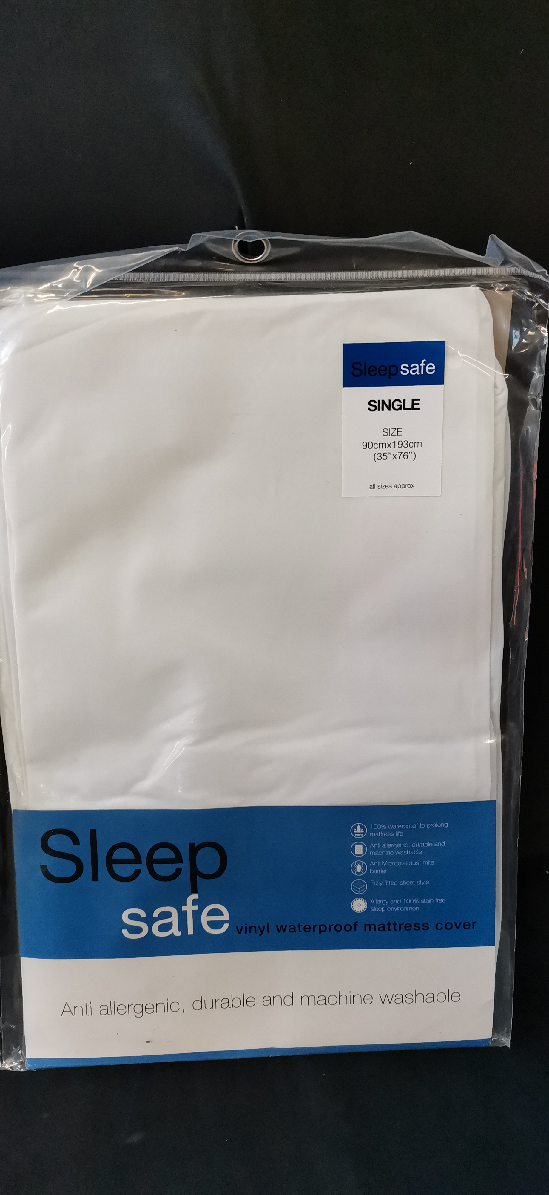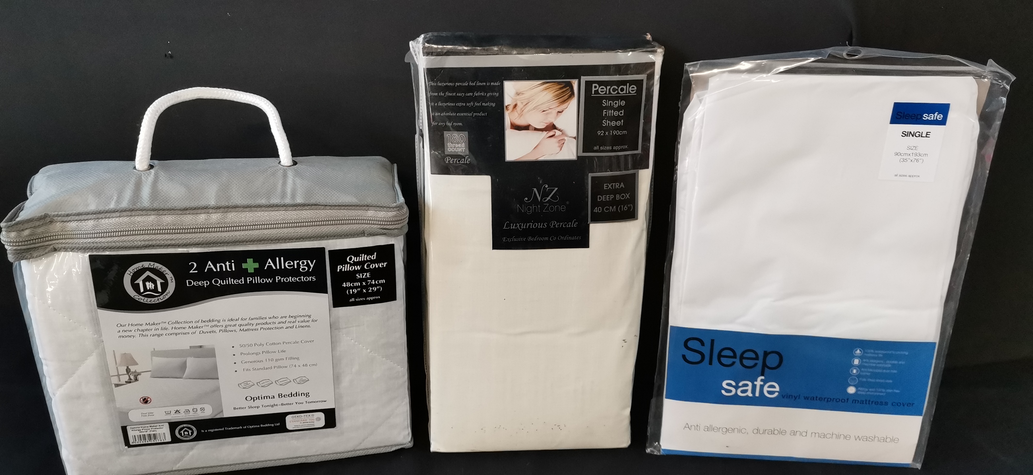 A selection of new bedding including a pair of quilted pillow protectors, a single percale fitted sheet, and a vinyl waterproof mattress cover.