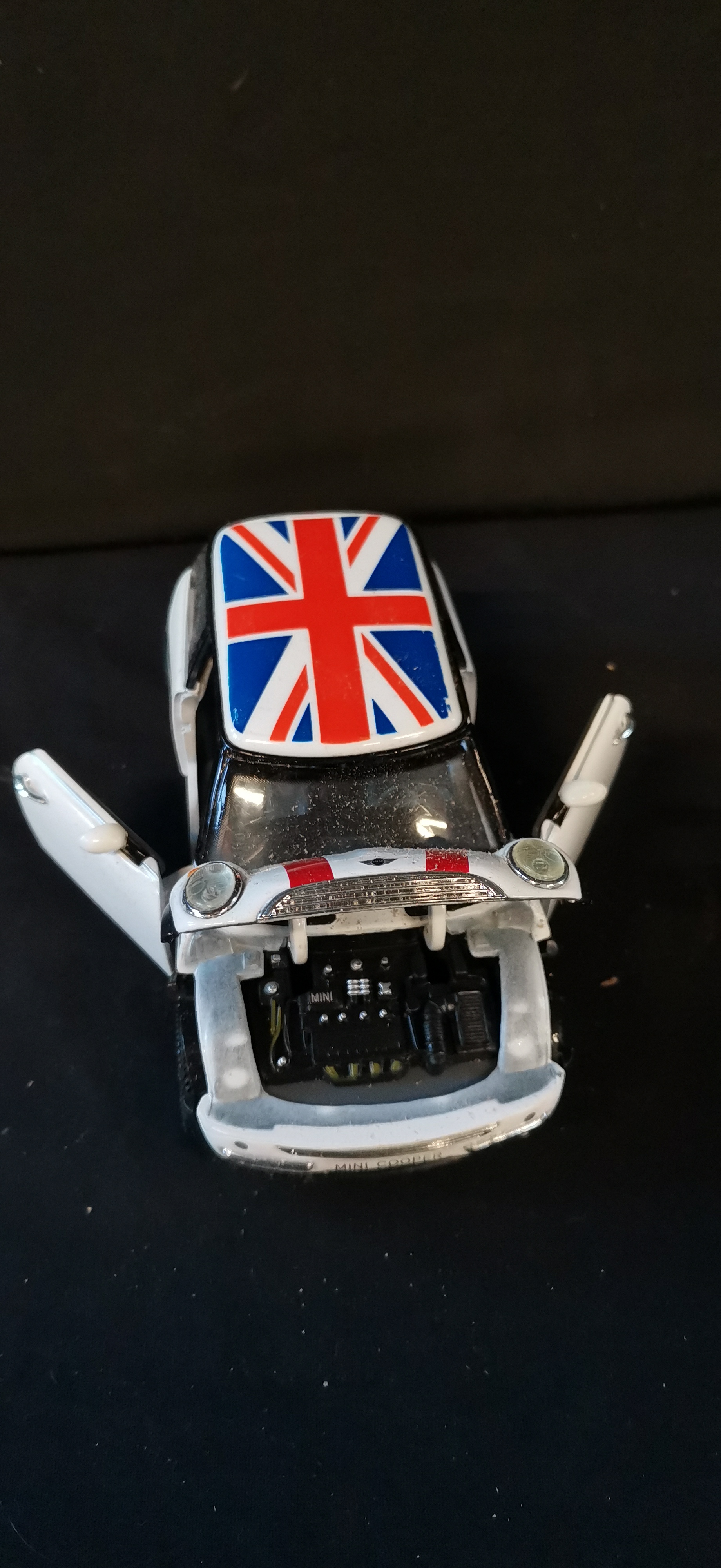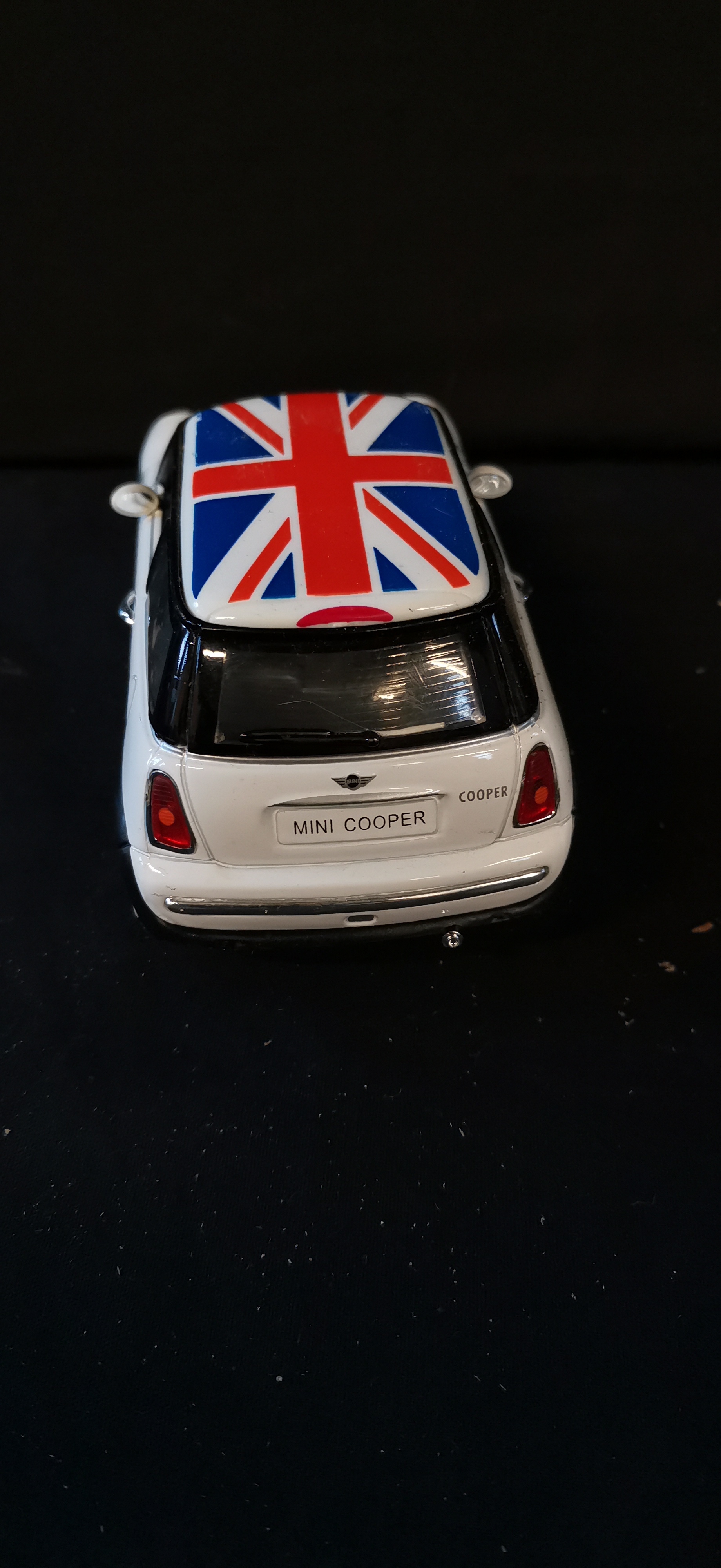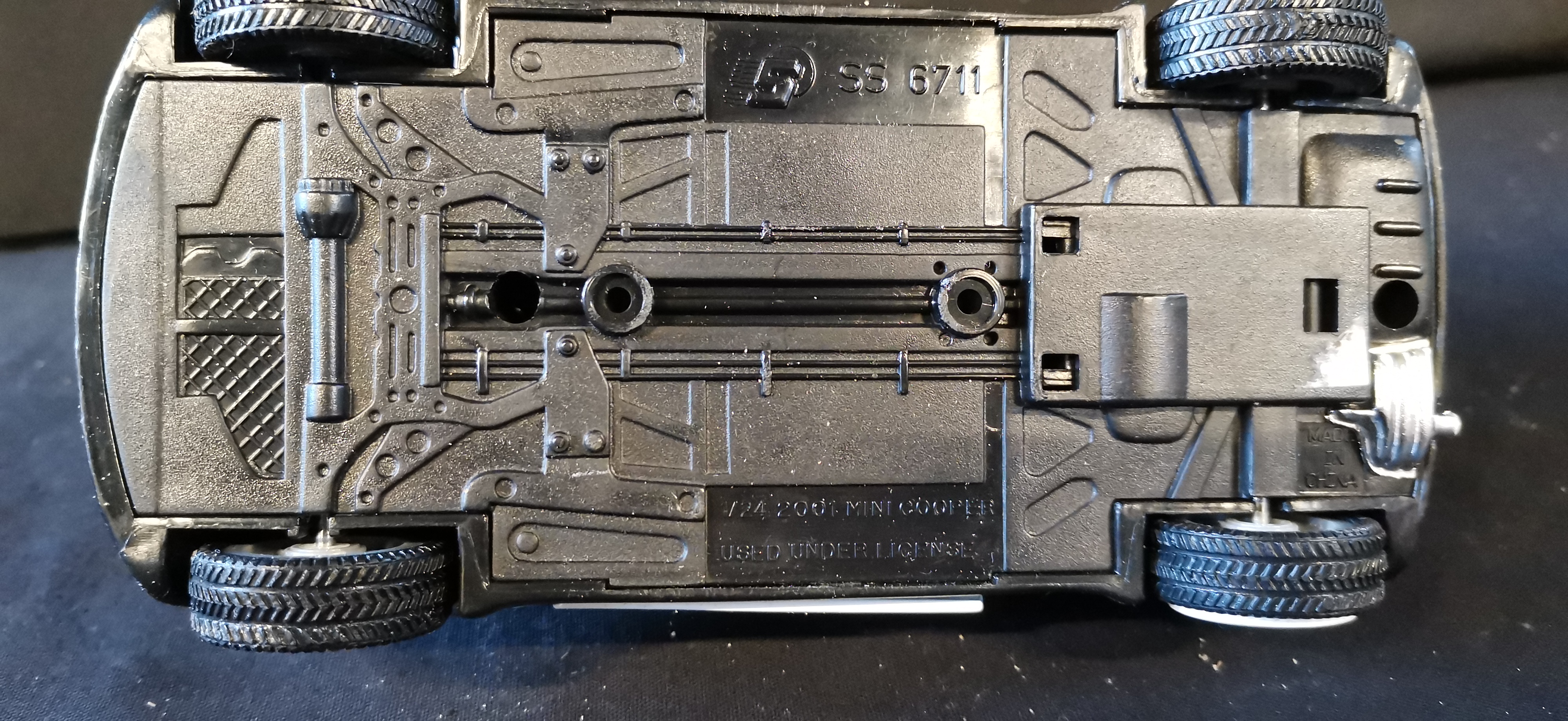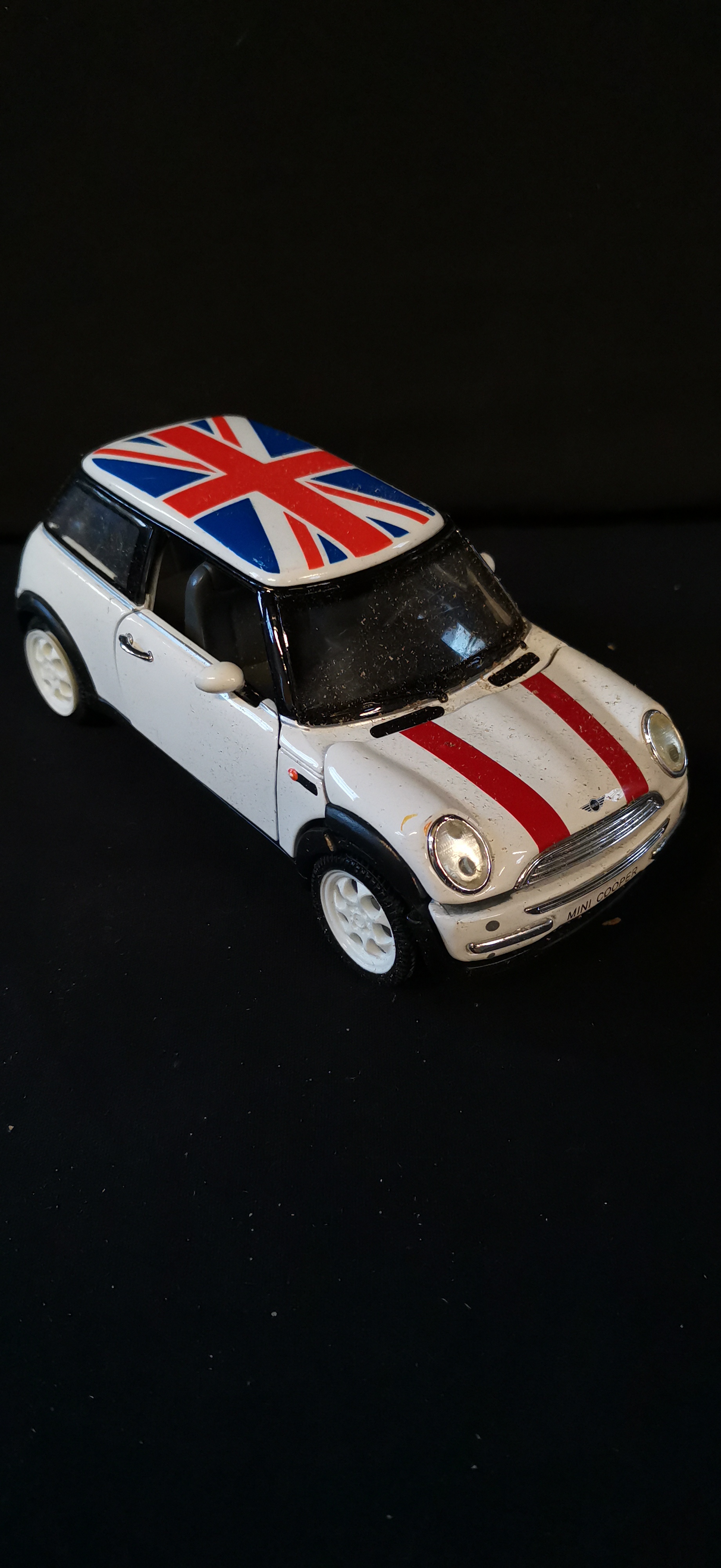 A white 1/24 scale 2001 Mini Cooper die-cast model car featuring a Union Jack roof, red racing stripes, and manufacturer’s code SS 6711.