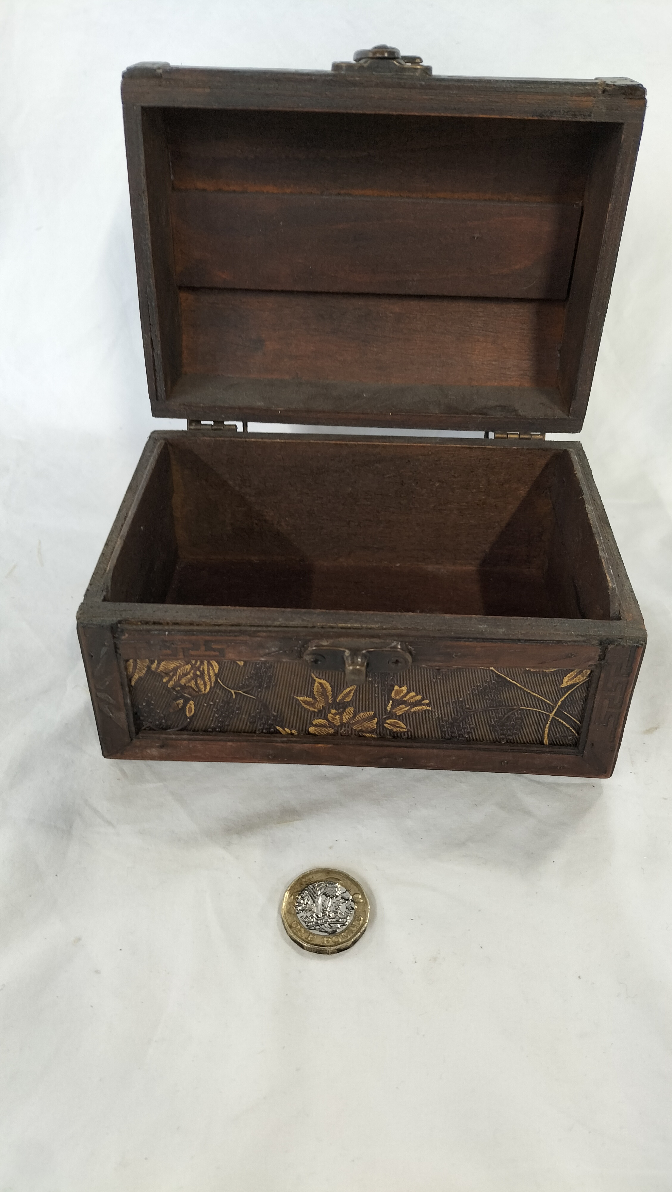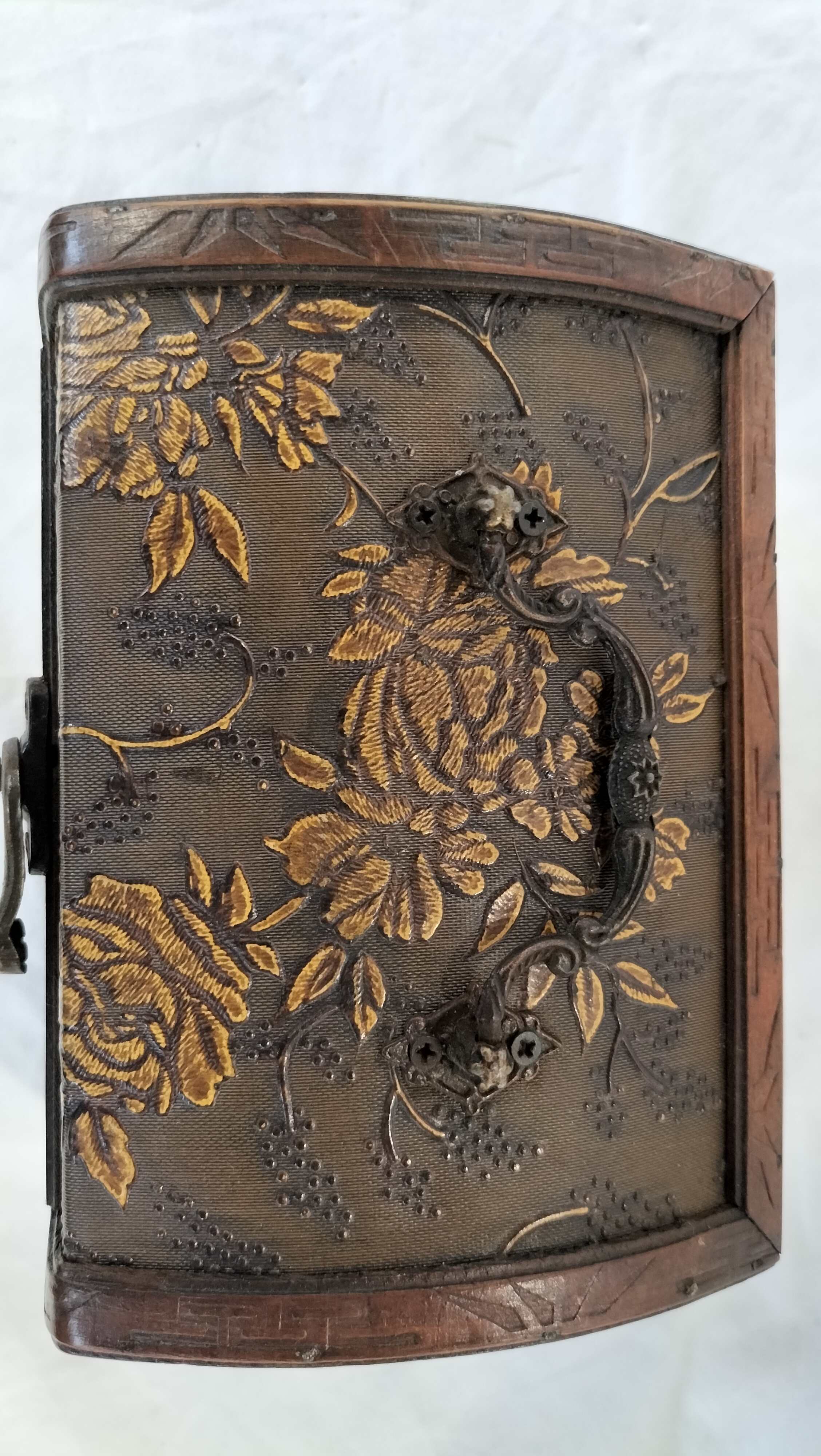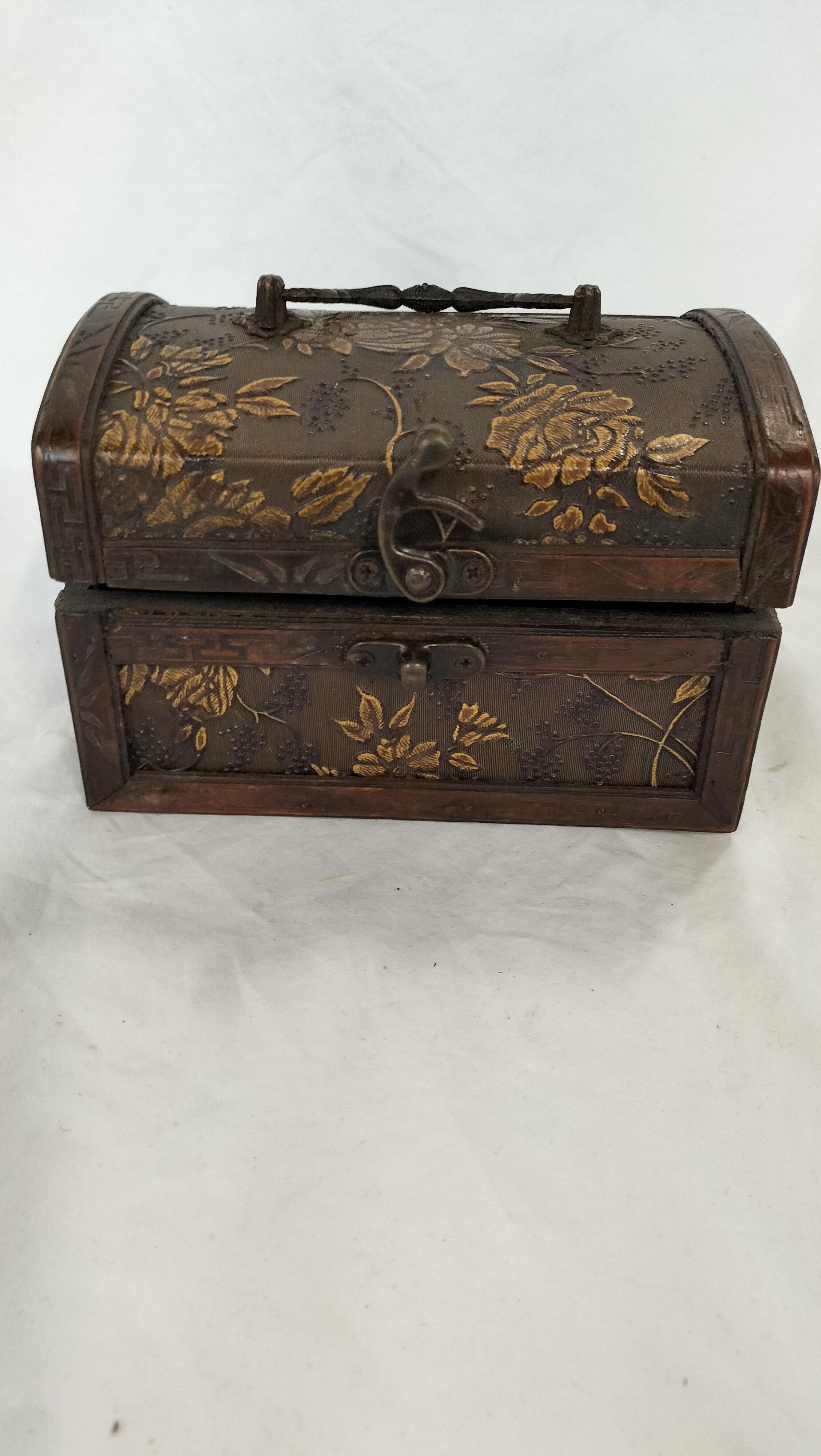 A small decorative wooden chest of trunk-style construction featuring a domed lid and dark-stained wooden framing. The borders are decorated with a carved meander pattern. The top and front faces contain inset textured panels with a raised gold-tone floral motif depicting roses and vines against a dark ground. The piece is fitted with a front-mounted metal swing-arm latch and a top-mounted ornate metal bail handle. The handle is secured to the lid with modern Phillips-head screws. The interior is unlined and shows plain dark wood construction. No maker’s marks or labels are present.