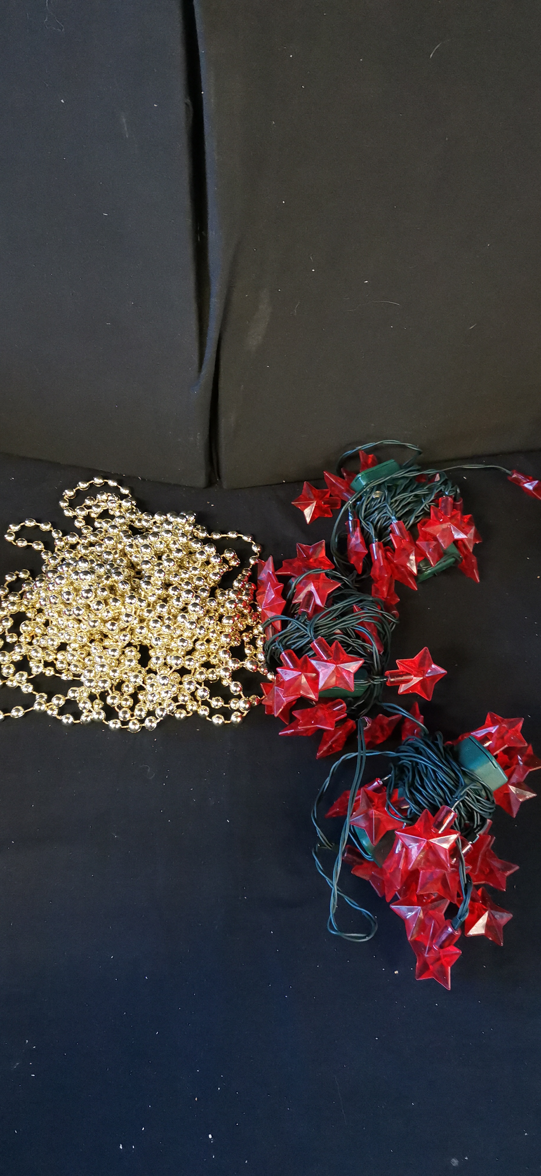 A collection of holiday decorations comprising multiple strands of red star-shaped string lights on green wires and a gold-toned beaded garland.