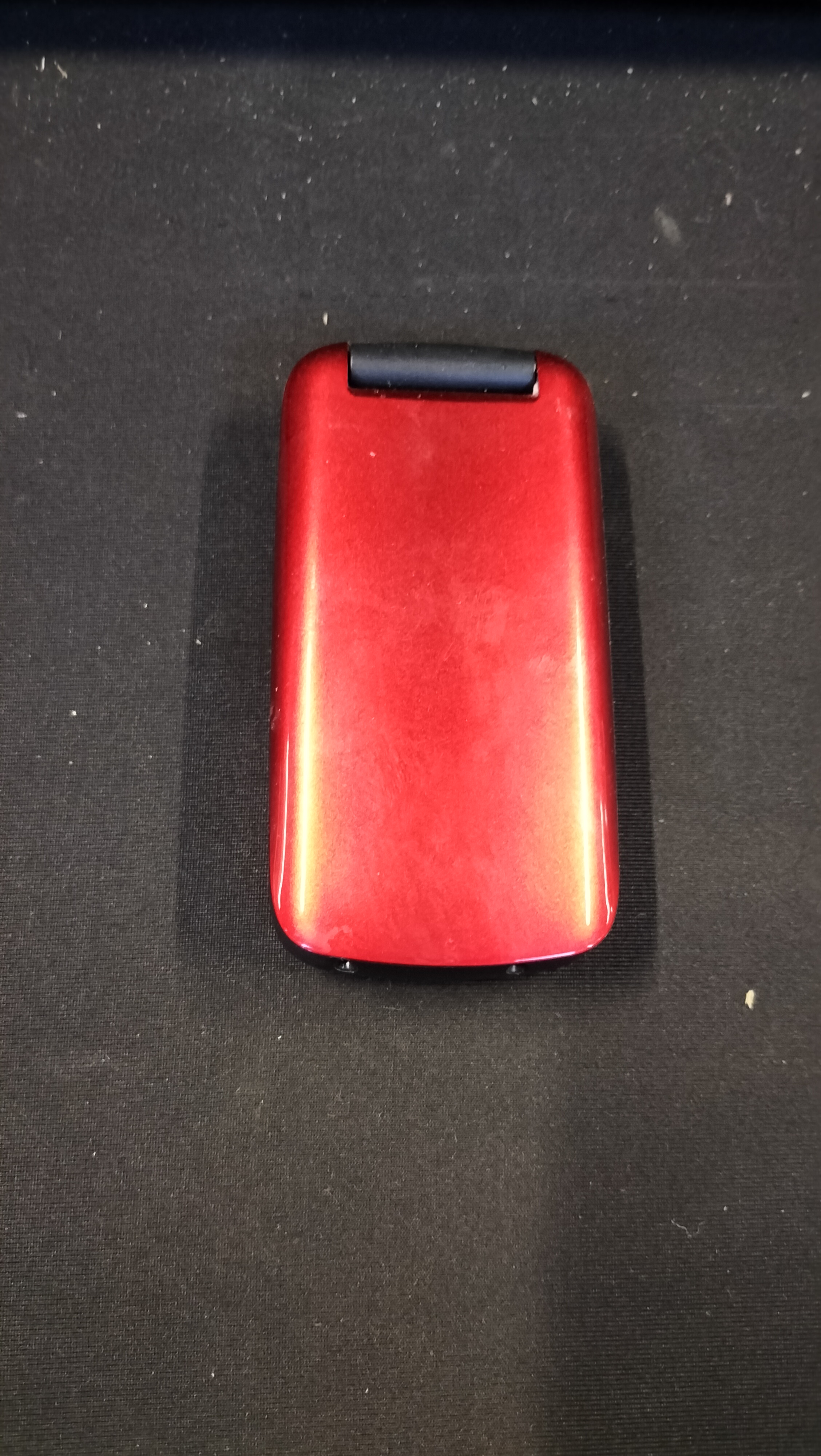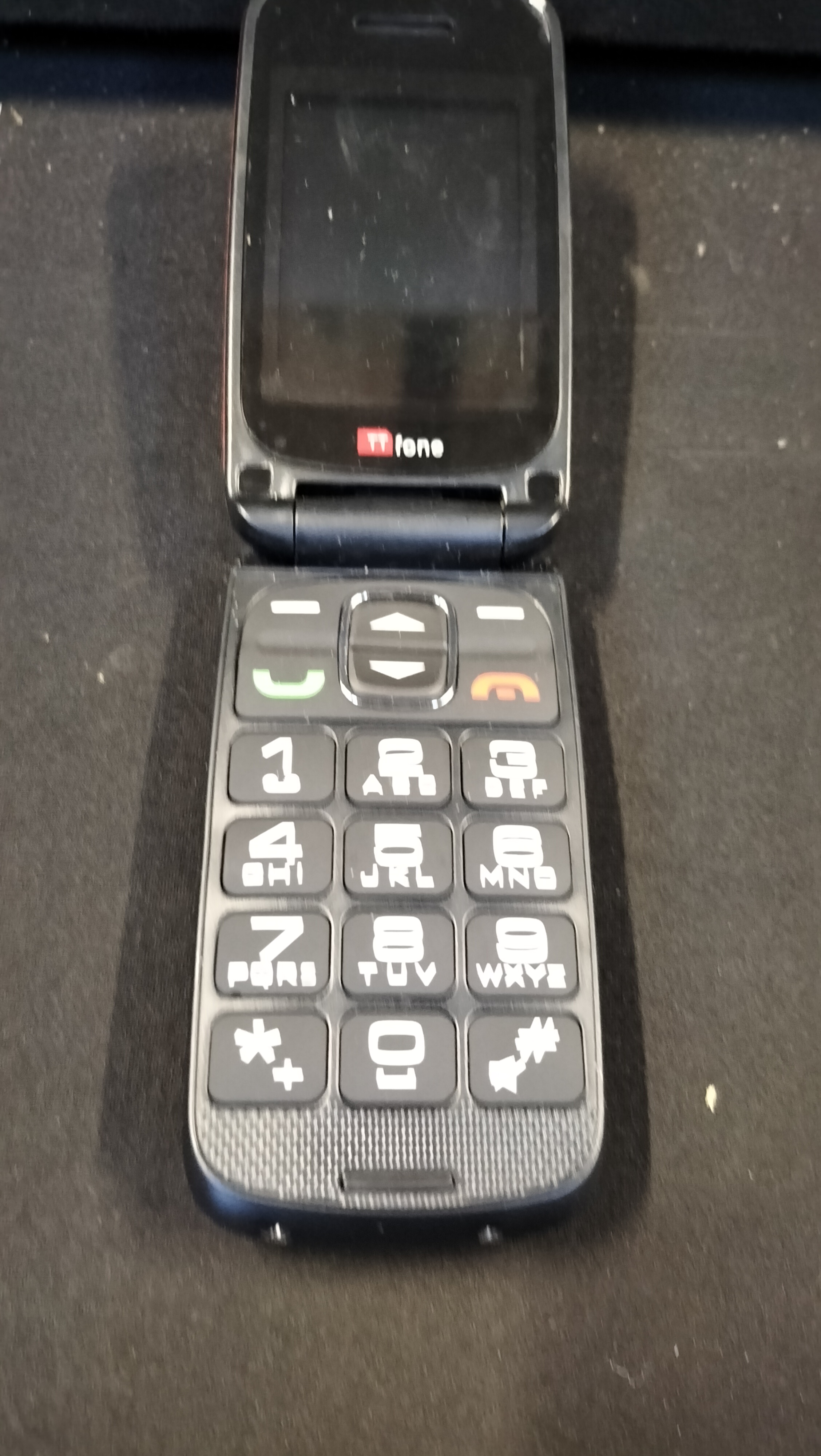 A red and black flip-style mobile phone featuring large high-contrast buttons and the TTfone brand name on the screen bezel.
