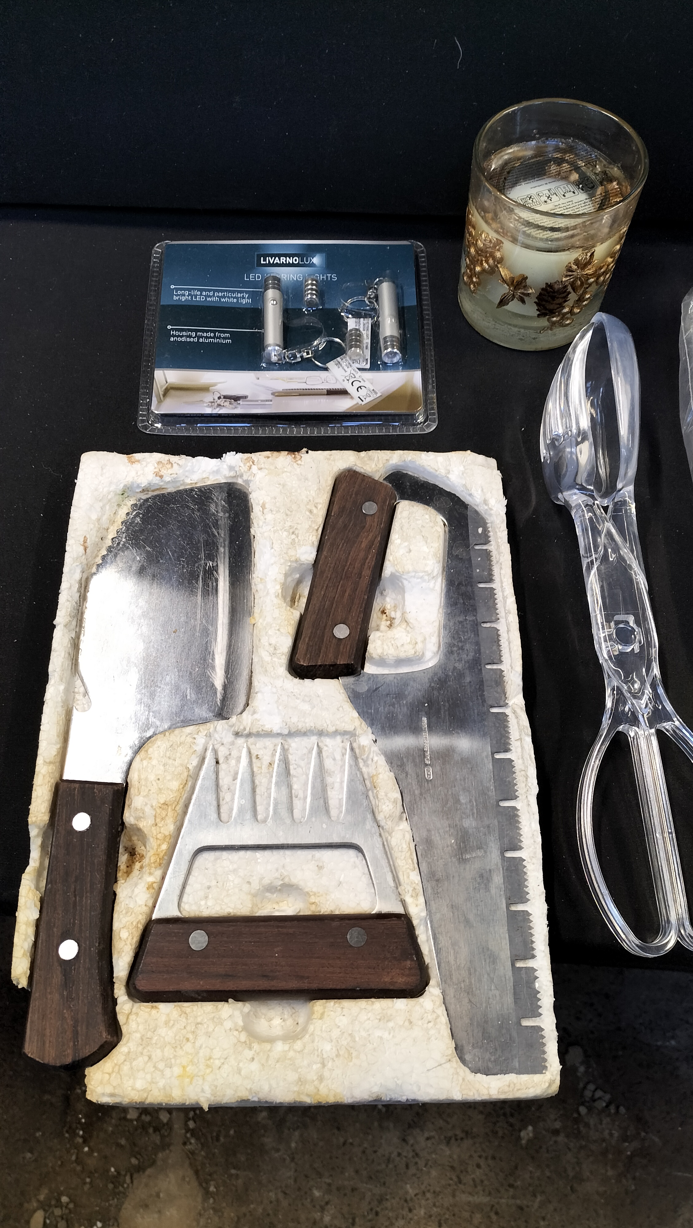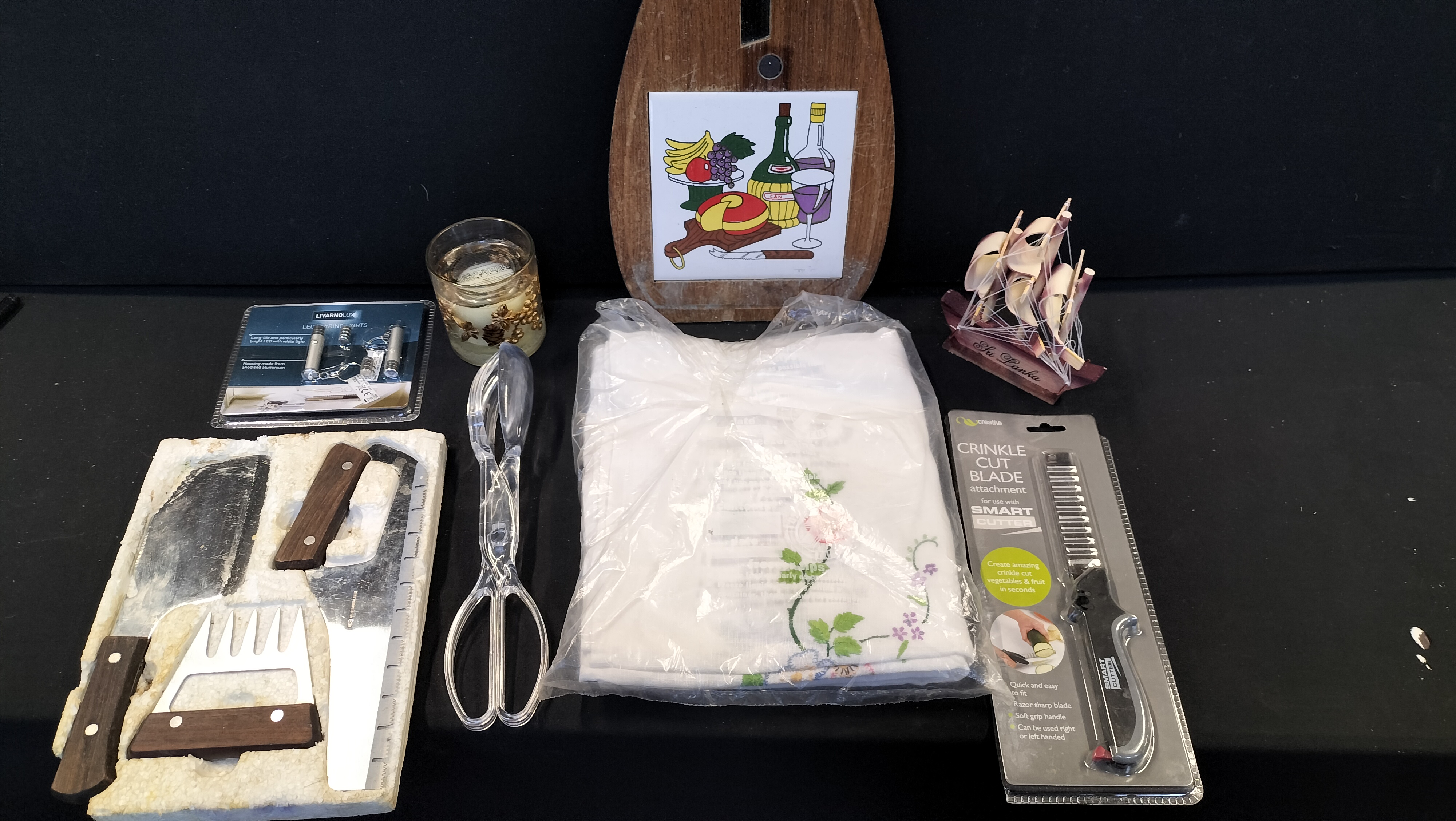 A collection of household items including Livarnolux LED keyring lights, a crinkle cut blade attachment, plastic tongs, a glass candle holder, a wooden cutting board with ceramic tile, a trio of wooden-handled kitchen tools, an embroidered cloth, and a model ship.