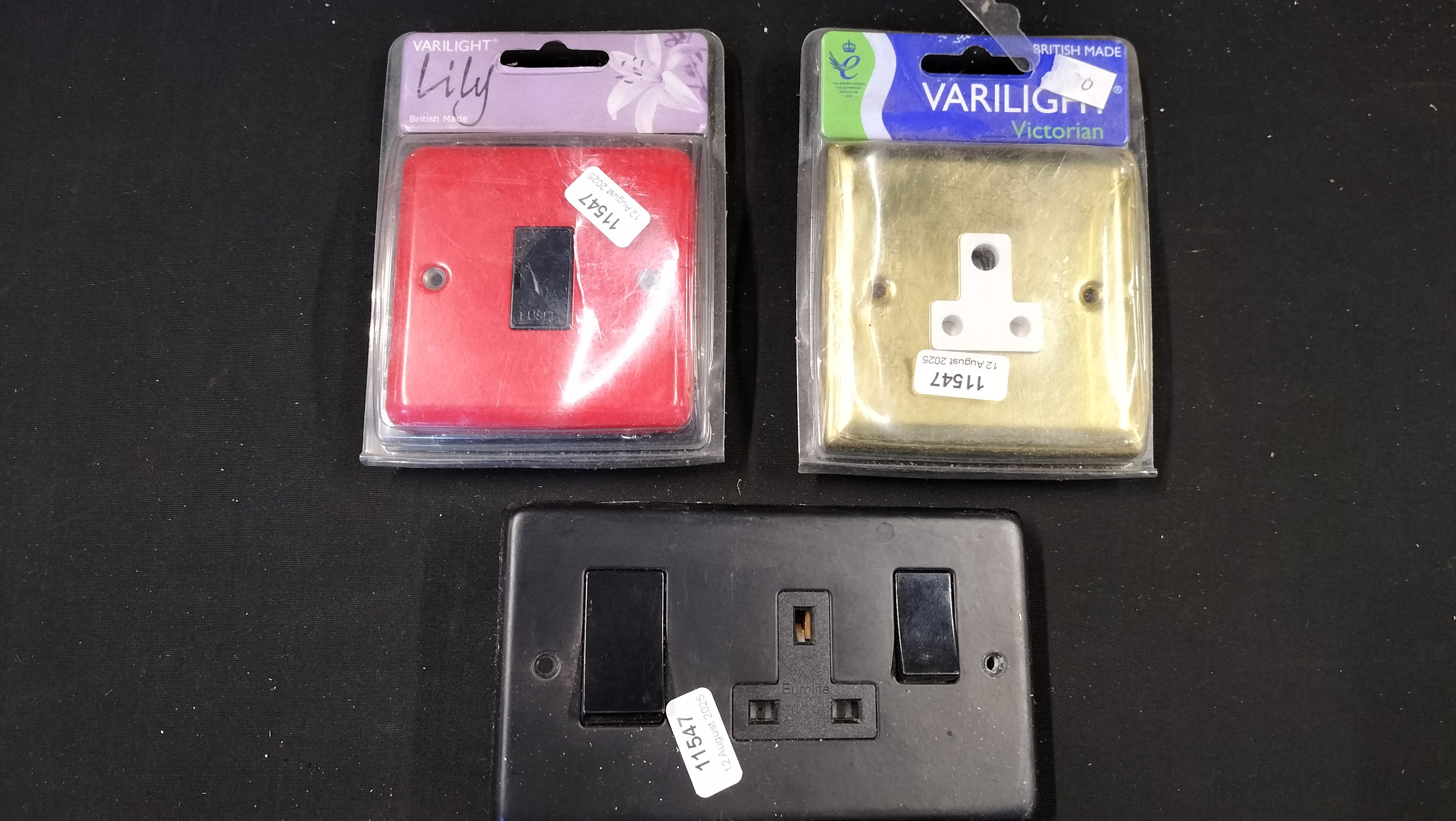 Three electrical socket and switch plates in black, red, and gold tones, including Eurolite and Varilight Lily and Victorian series models.