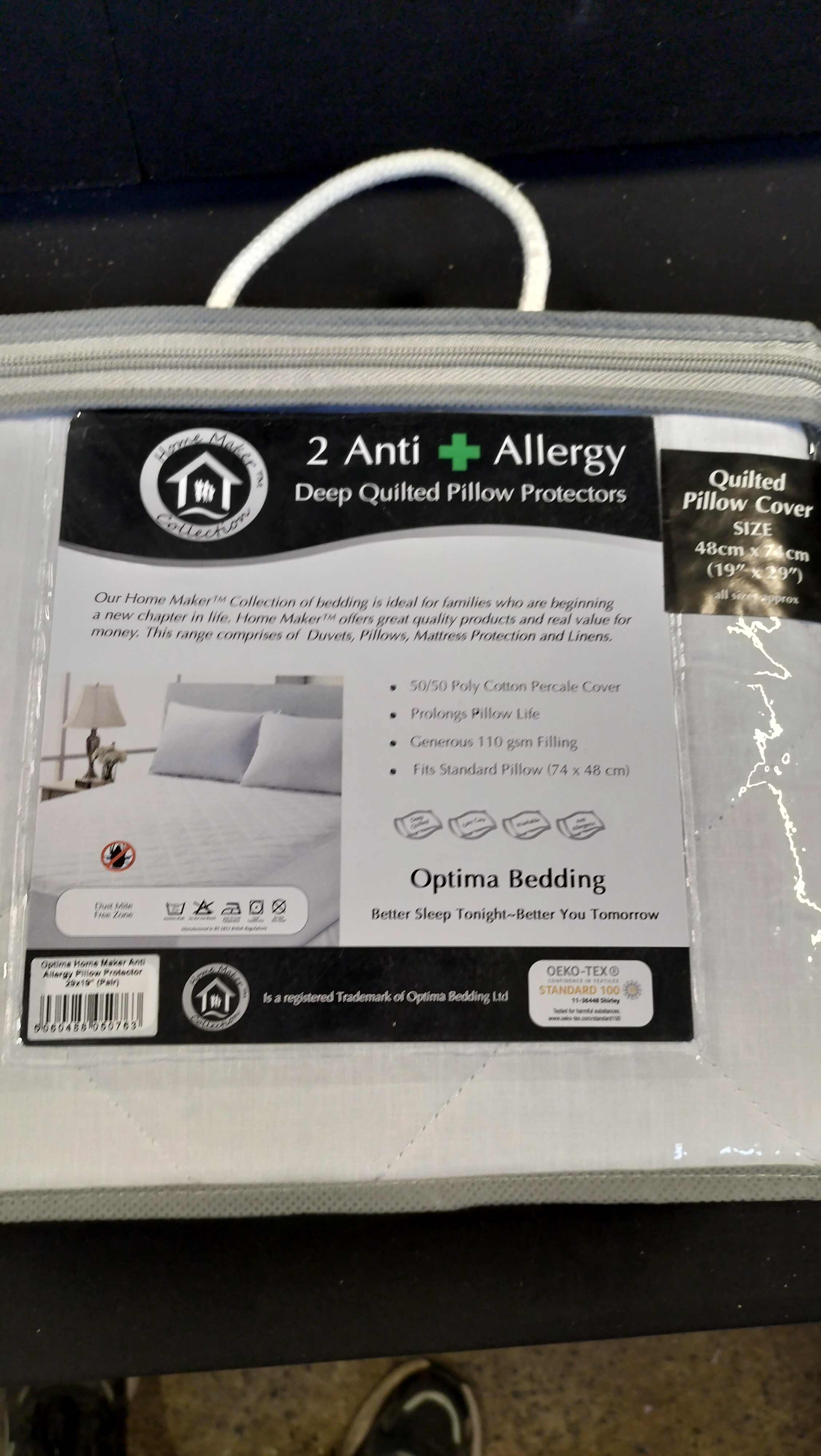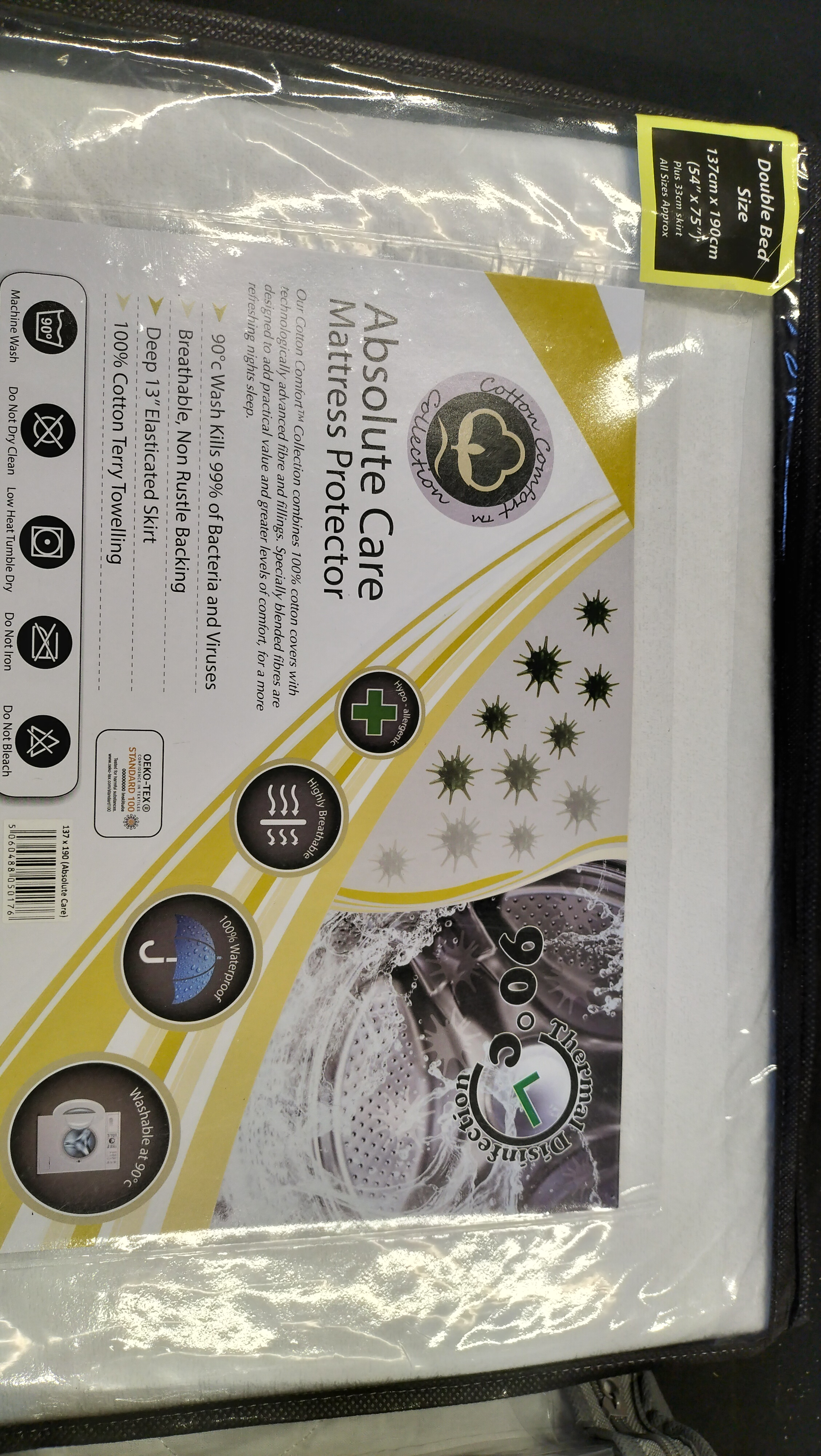 A double bed size Absolute Care mattress protector and a pack of two anti-allergy deep quilted pillow protectors in original packaging.