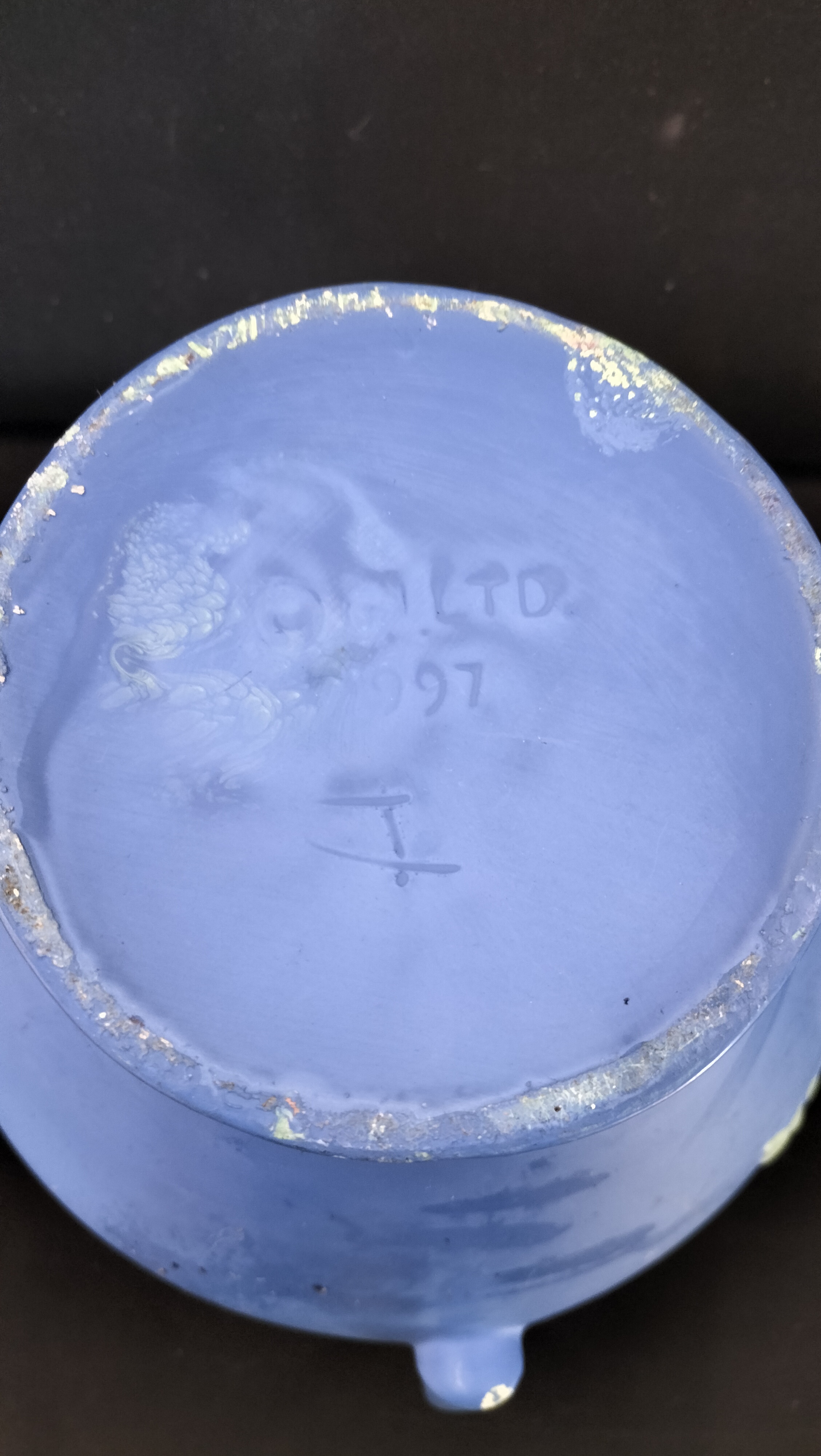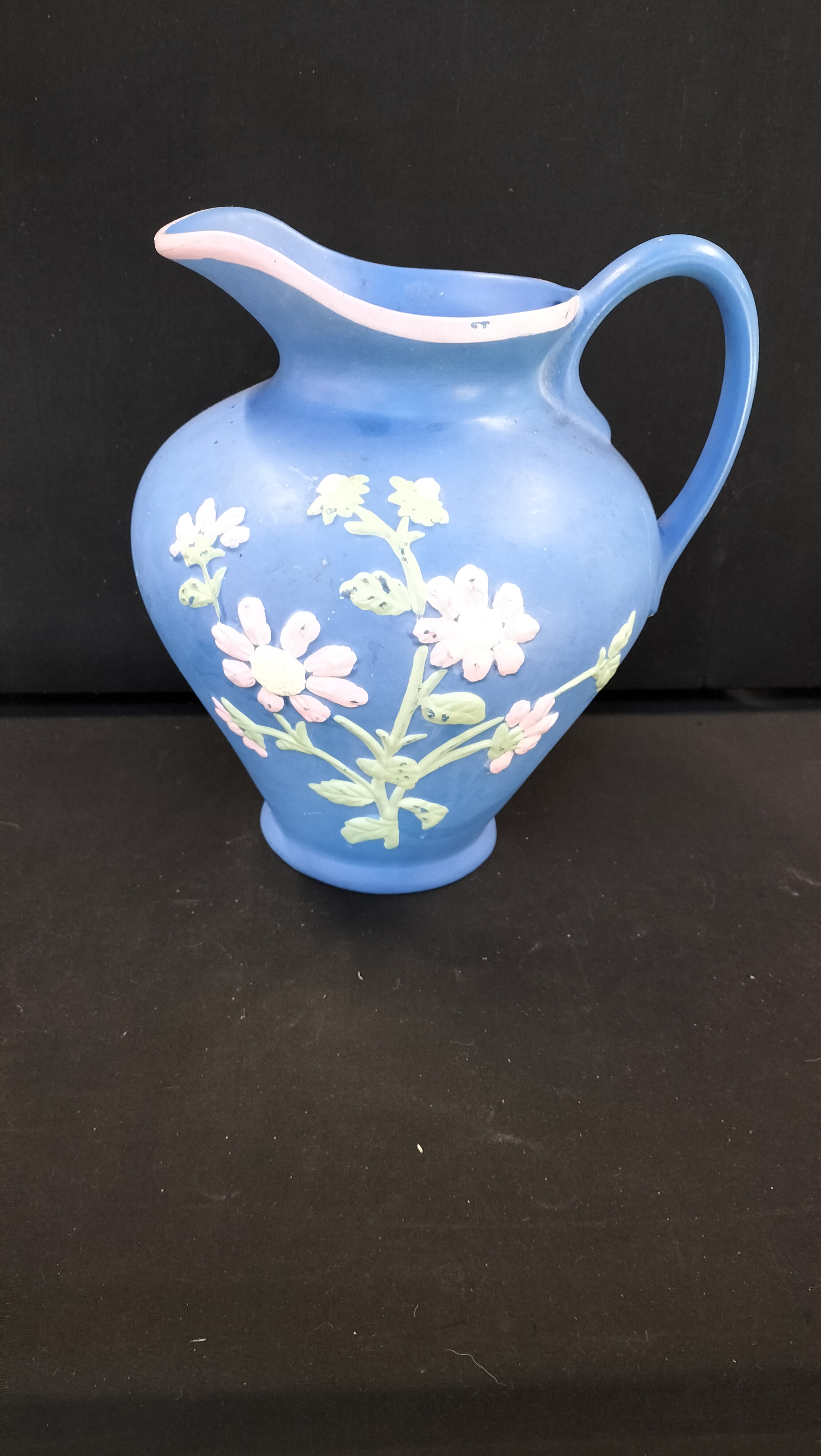 A blue ceramic pitcher featuring raised pink and white floral motifs, impressed with Poole Ltd and the number 997 to the base.