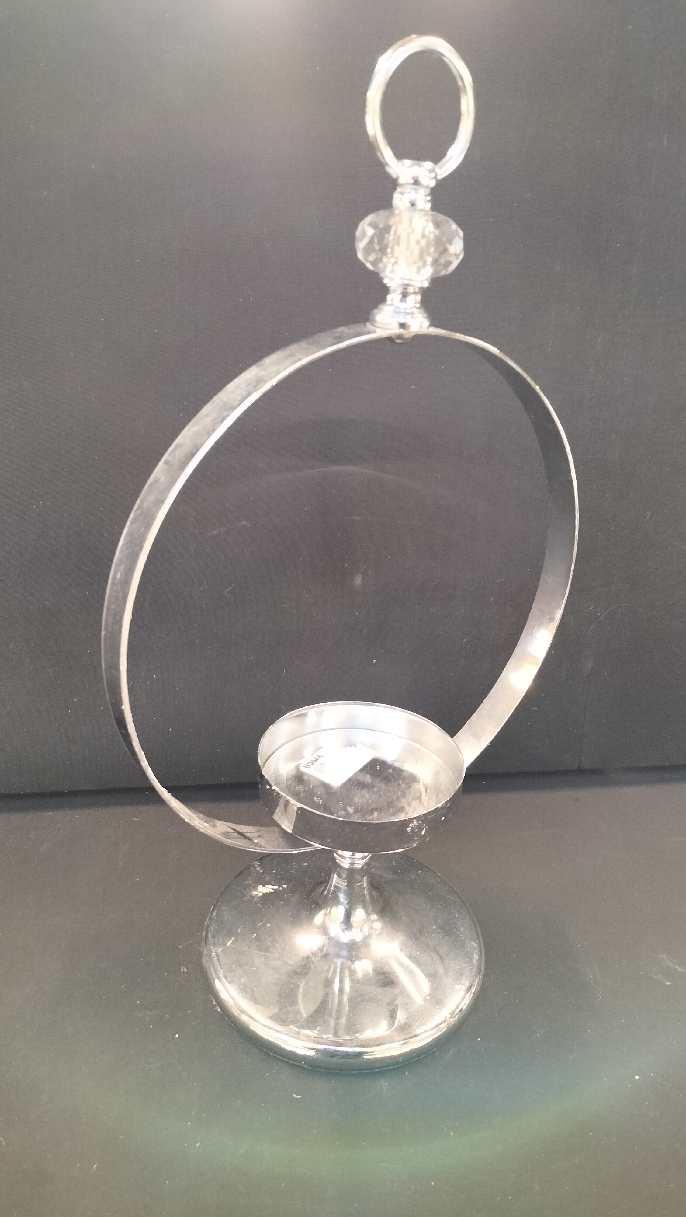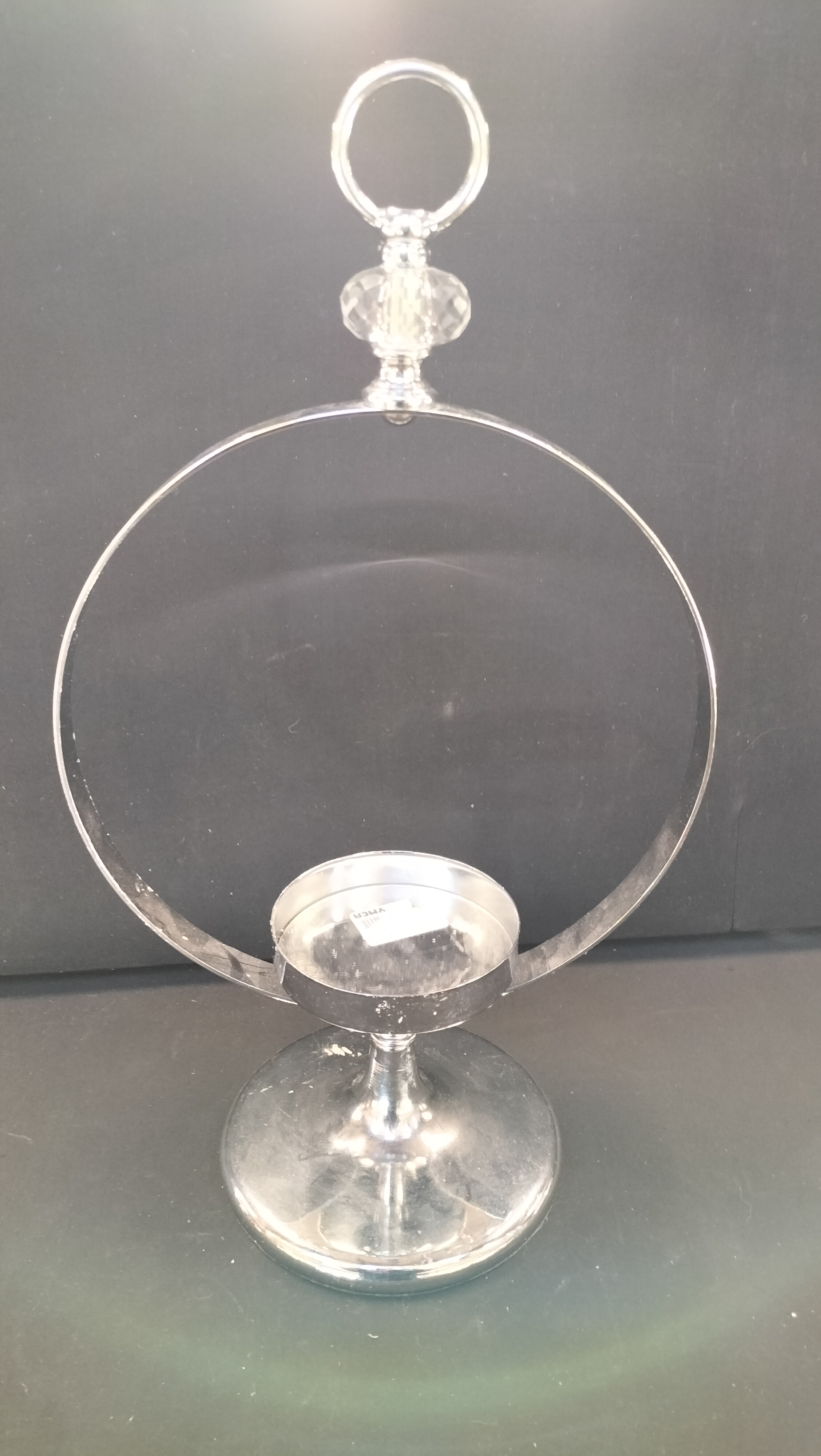 A silver-toned metal candle holder featuring a large circular frame topped with a faceted clear element and a pedestal base.