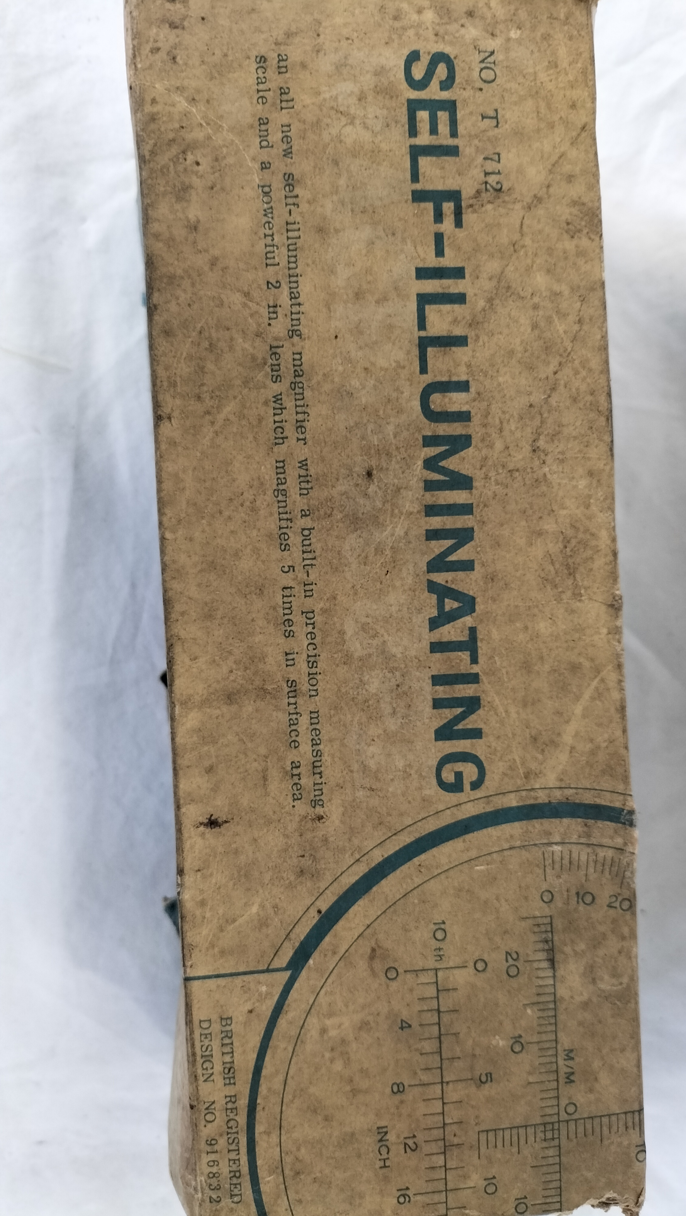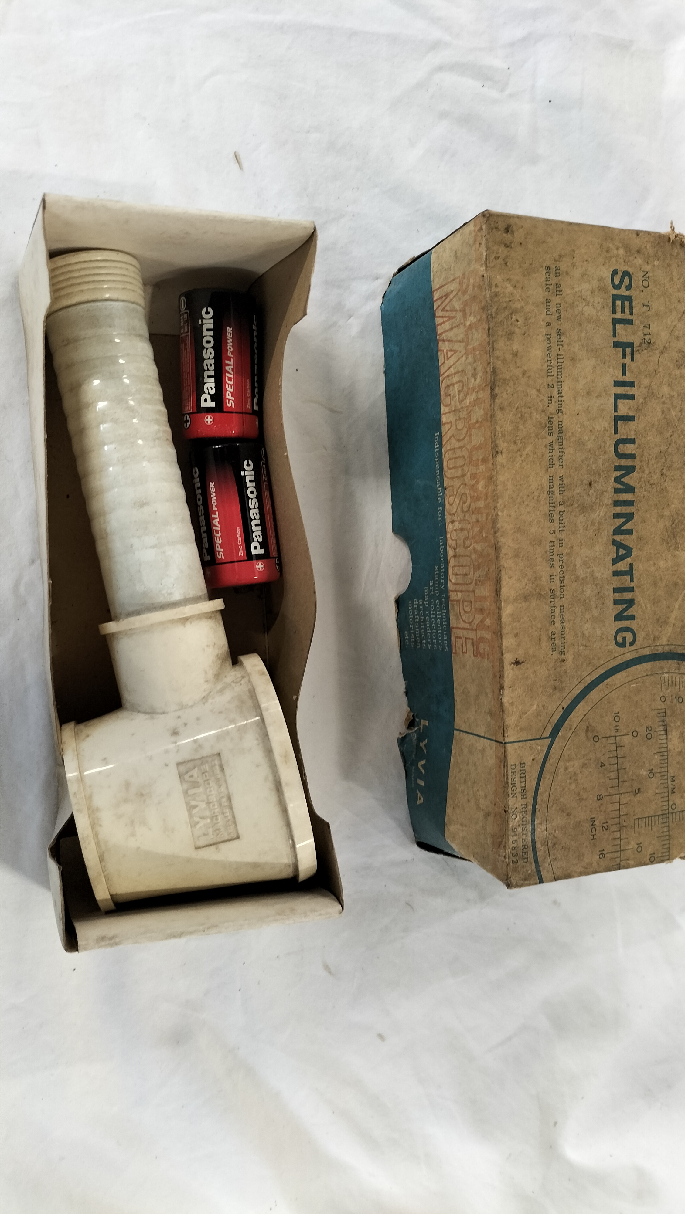 A mid-20th-century Lyvia self-illuminating macroscope, model number T 712. The instrument is constructed from a moulded white plastic body and features an integrated lens providing 5x magnification. It includes a built-in precision measuring scale with both metric and imperial units. The device is designed for battery operation, powered by two D-cell batteries housed within the handle. The body is moulded with the text LYVIA MACROSCOPE REGD. DESIGN NO. 916832. The item is accompanied by its original illustrated cardboard retail box, which details applications for laboratory technicians, collectors, and craftsmen. The box bears the British Registered Design number 916832 and model number T 712.