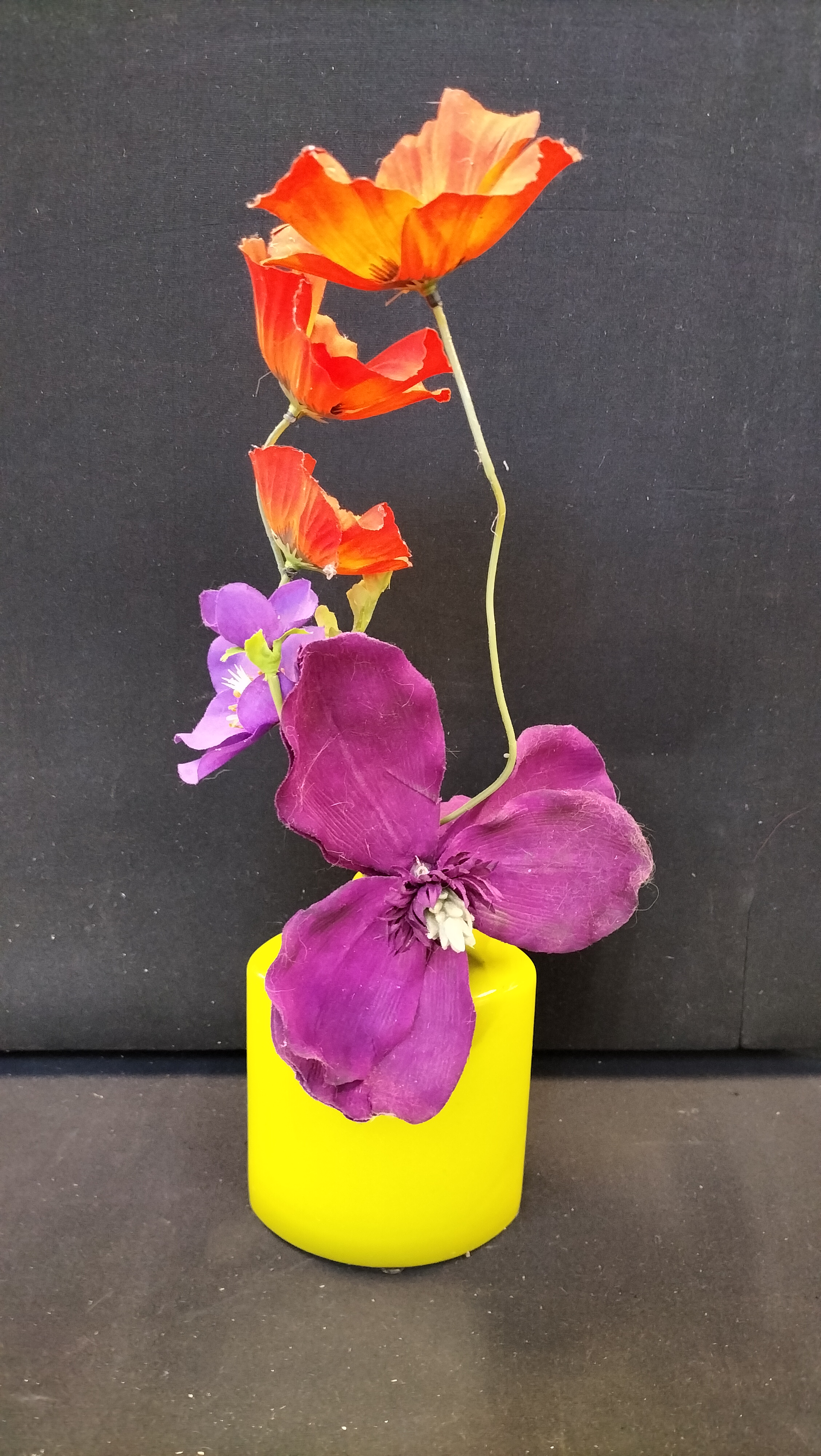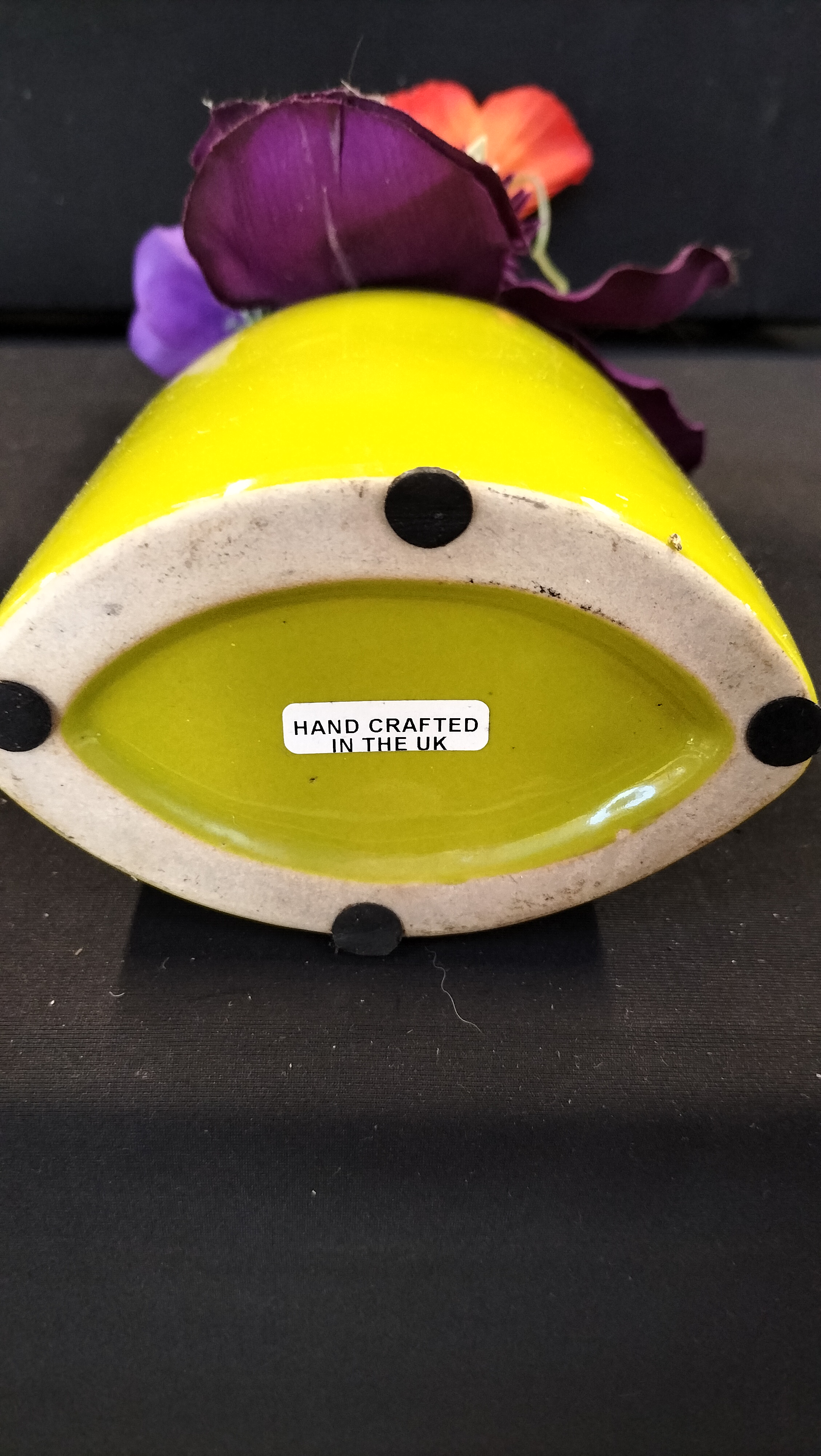 An artificial floral arrangement with orange, red, and purple flowers in a yellow oval vase, handcrafted in the UK.