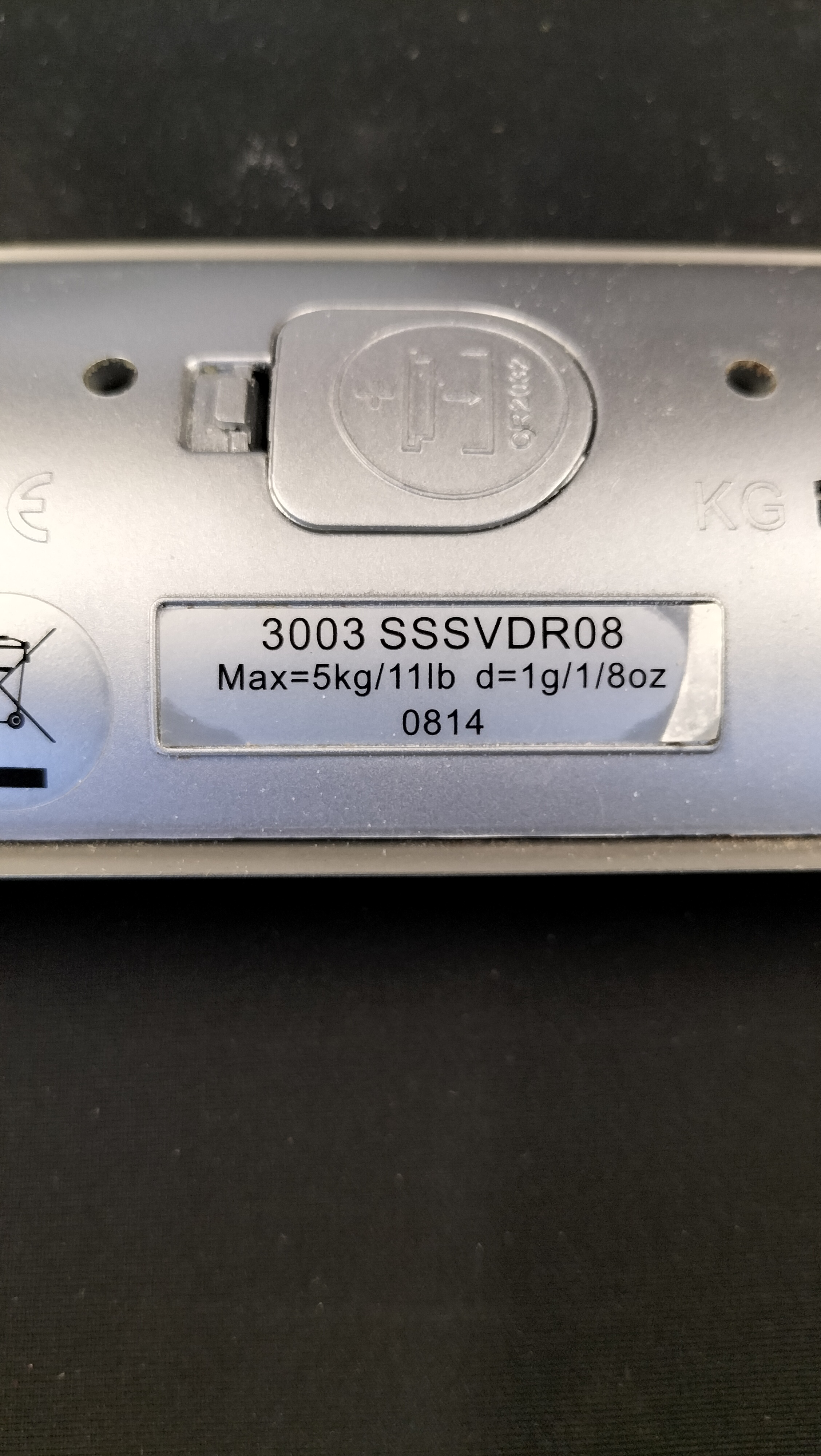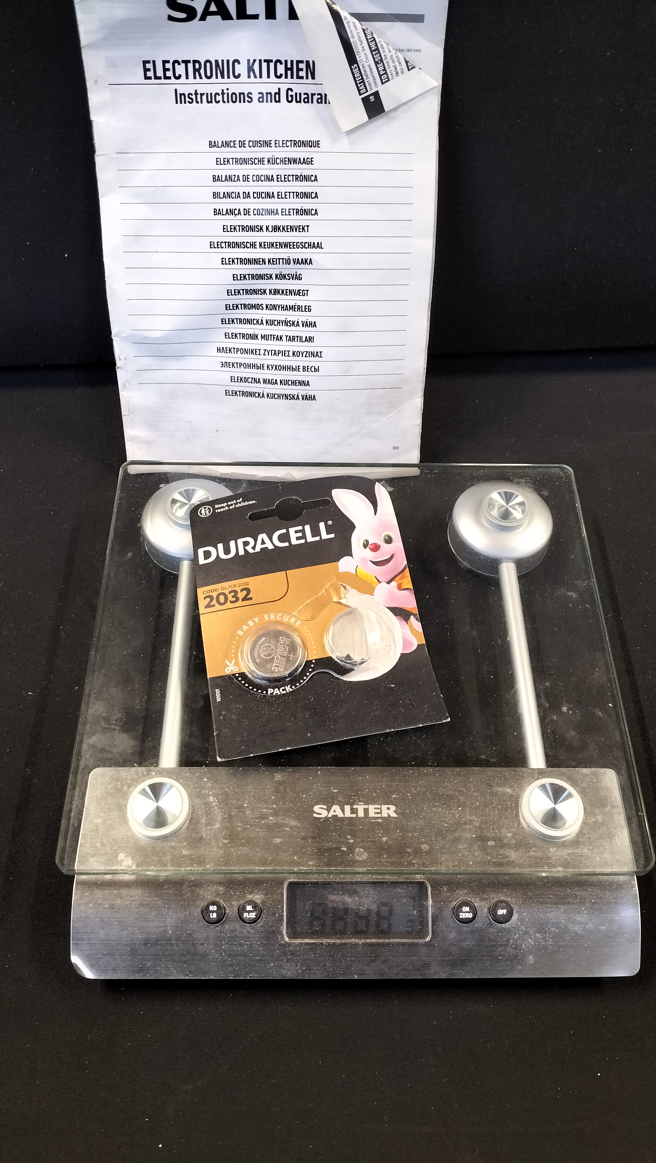 A Salter 3003 SSSVDR08 electronic kitchen scale featuring a silver and clear glass platform with a 5kg capacity, accompanied by an instruction manual and Duracell batteries.