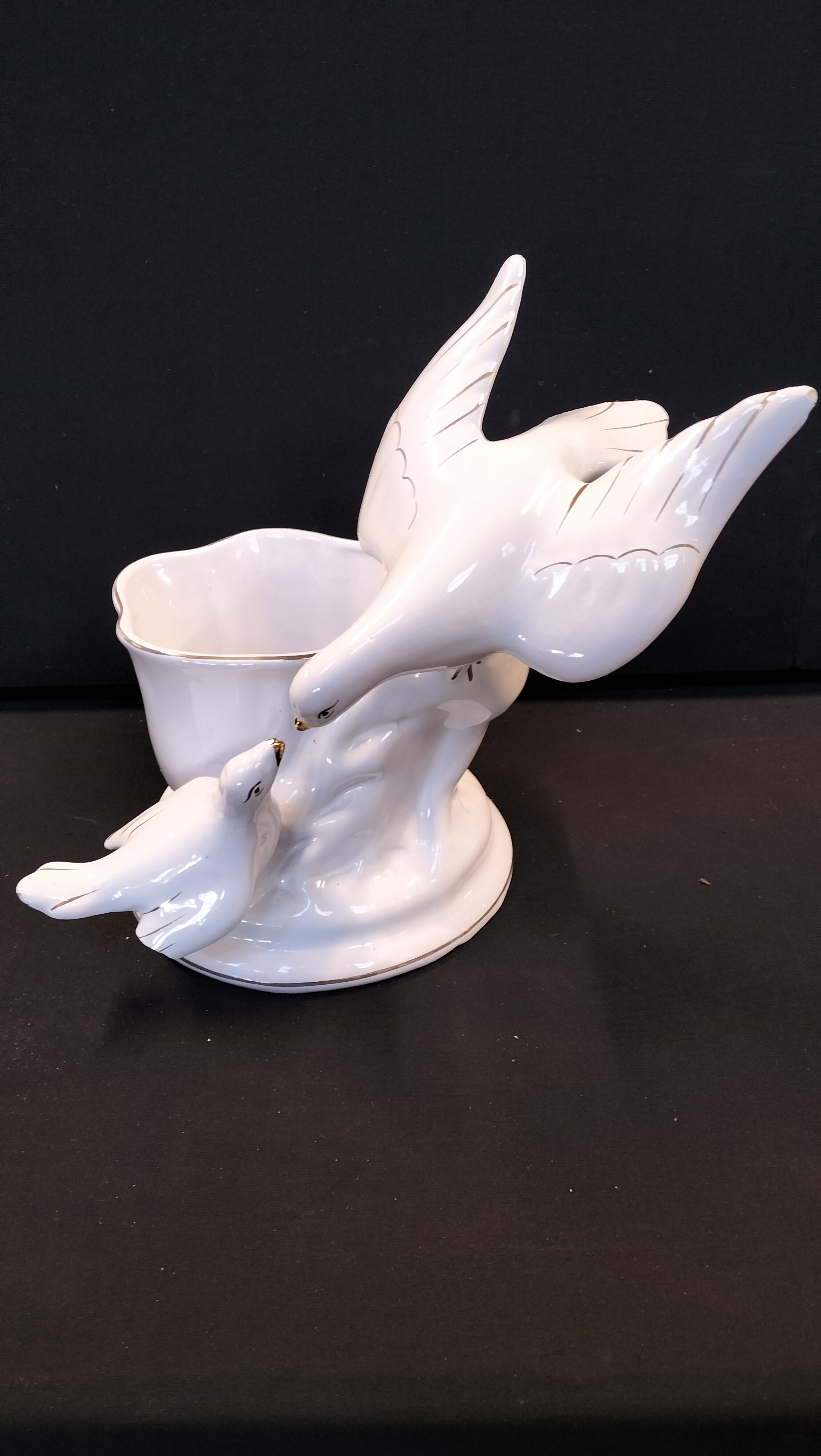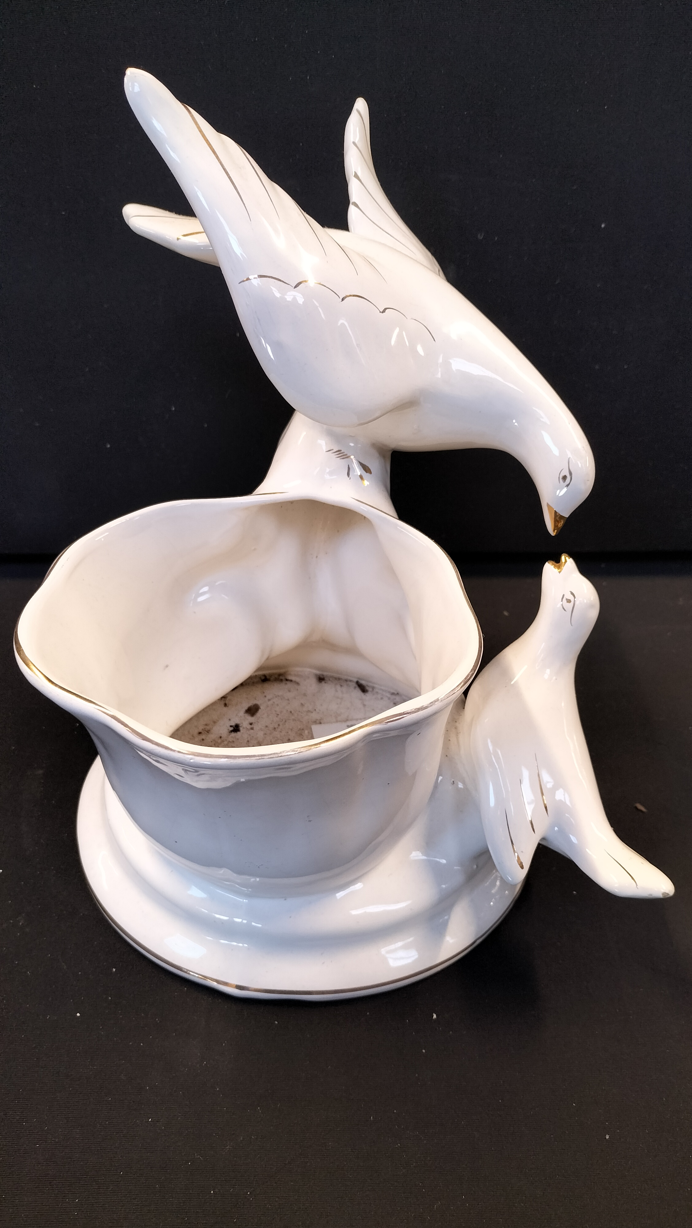 A white porcelain planter featuring two decorative doves with gold-tone accents on the beaks, wings, and rims.