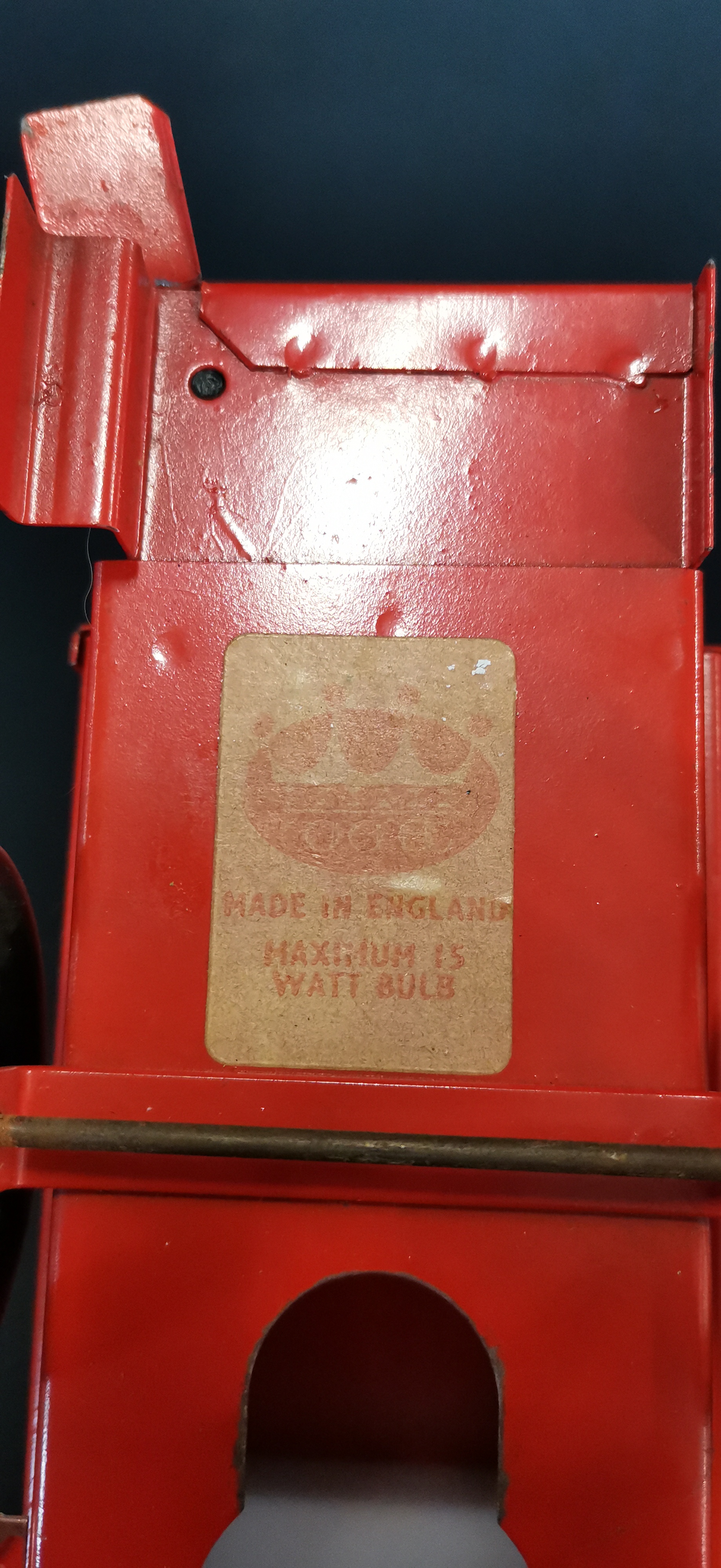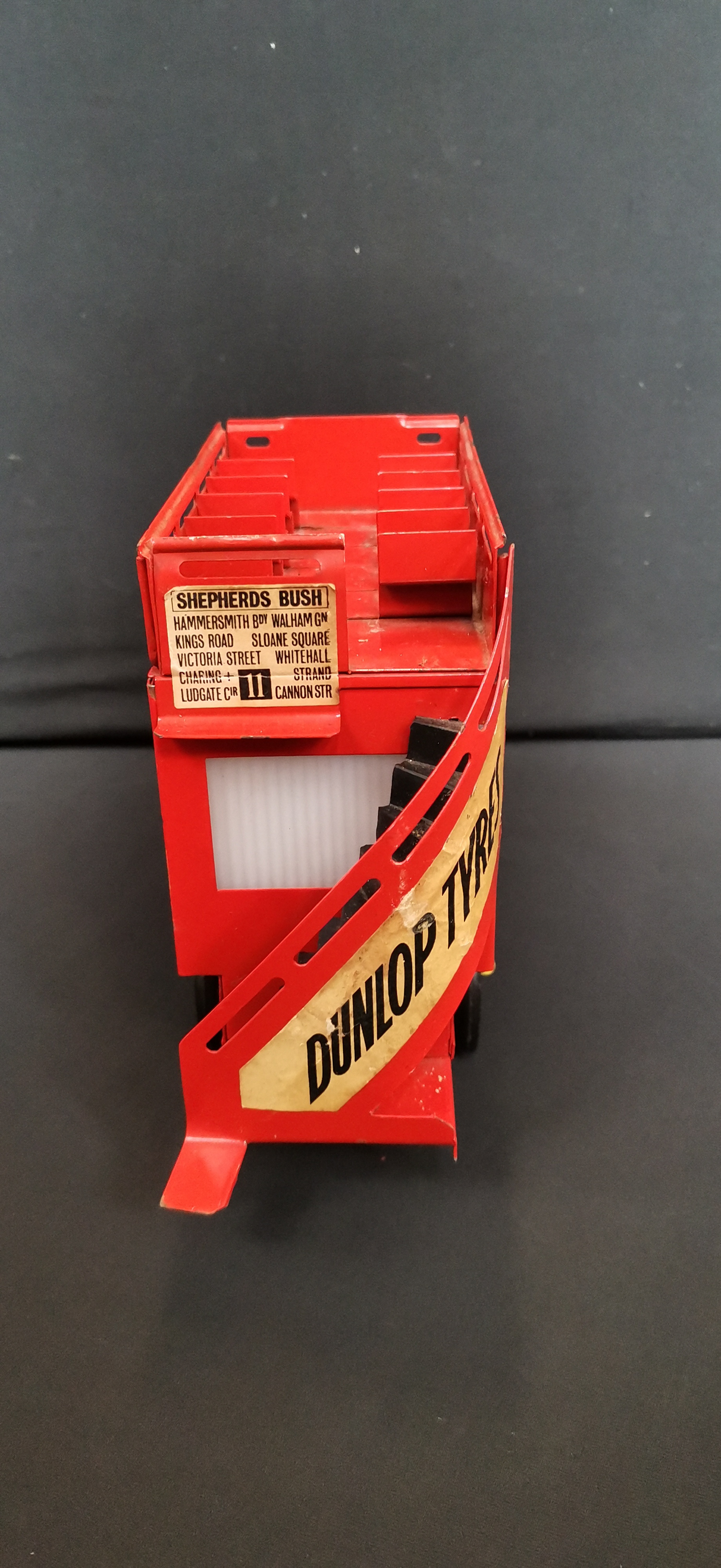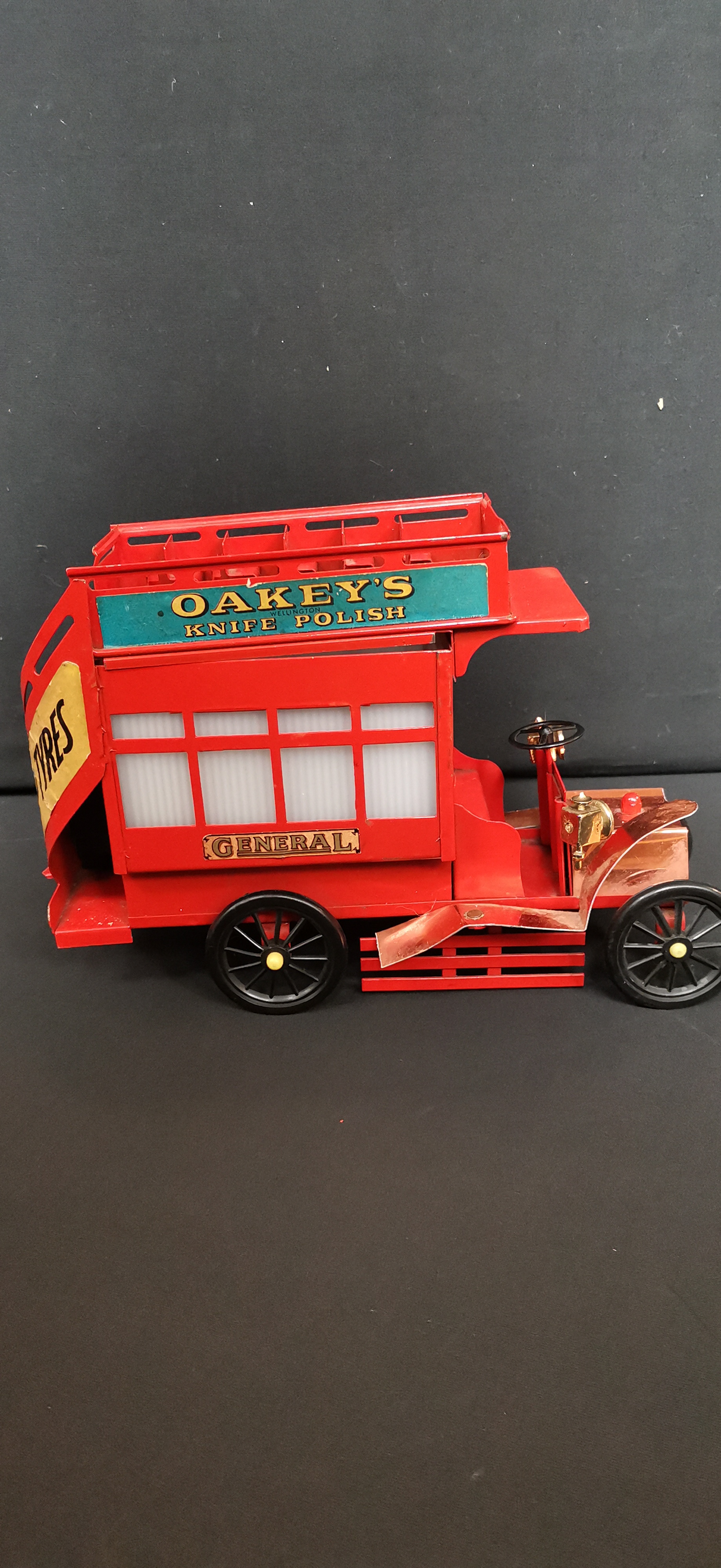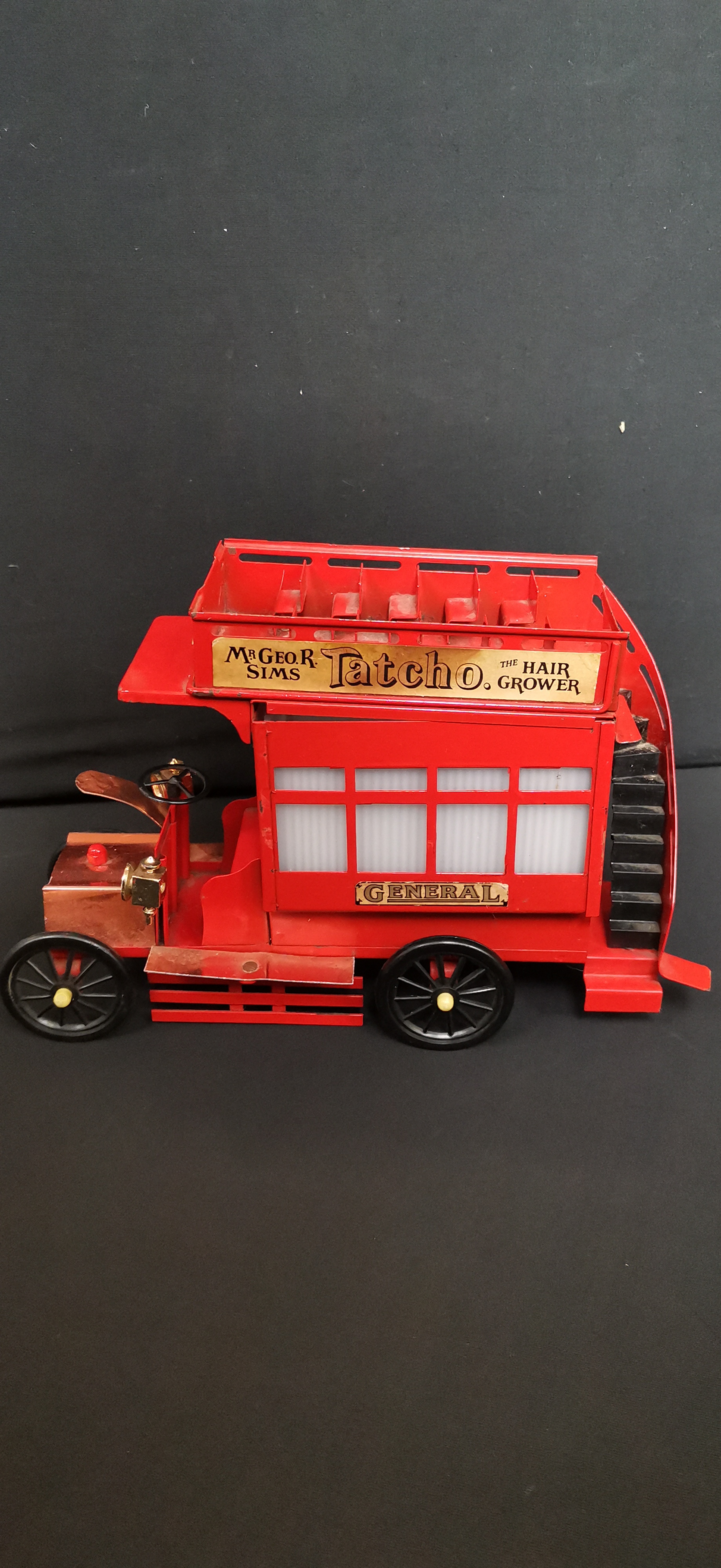A red vintage-style metal double-decker bus lamp featuring gold-tone accents, period advertisements for Tatcho and Hudson’s Soap, and a base label marked Made in England.