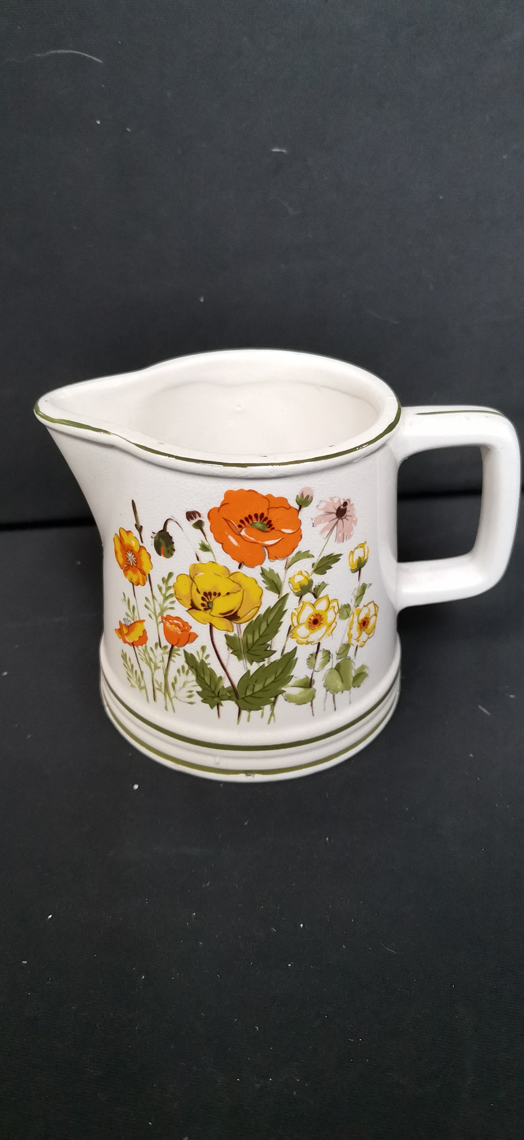 A white ceramic creamer featuring a vibrant floral pattern of orange, yellow, and pink blossoms with green accents and trim.