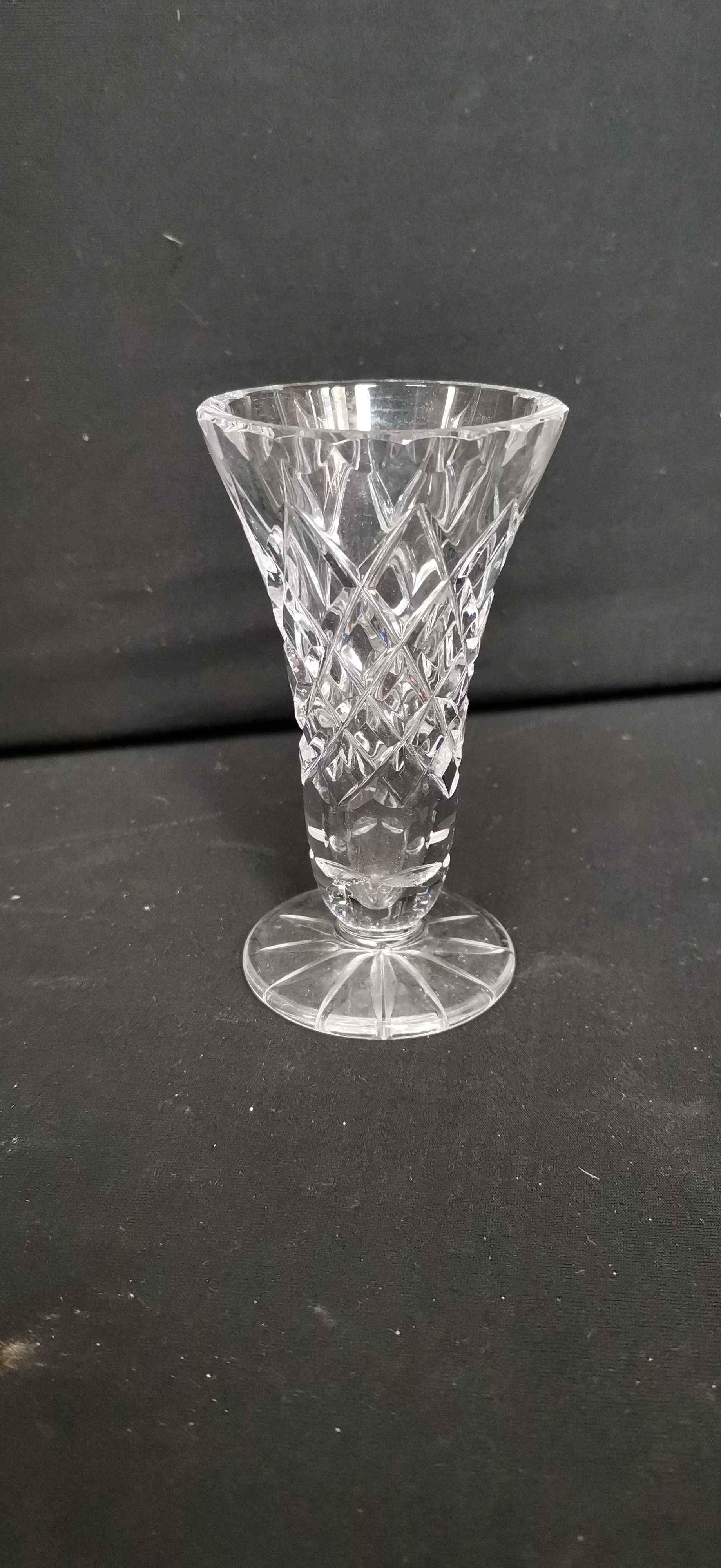 A clear cut-glass bud vase featuring a flared rim, a diamond-cut pattern to the body, and a star-cut circular base.