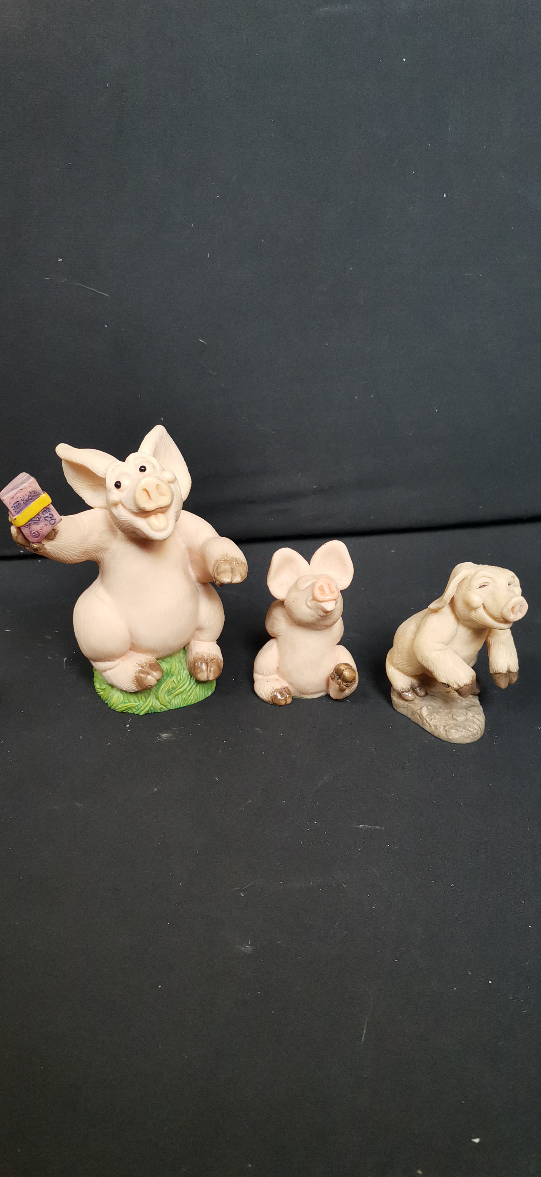 A trio of pink pig figurines including one holding a purple bundle marked £20.