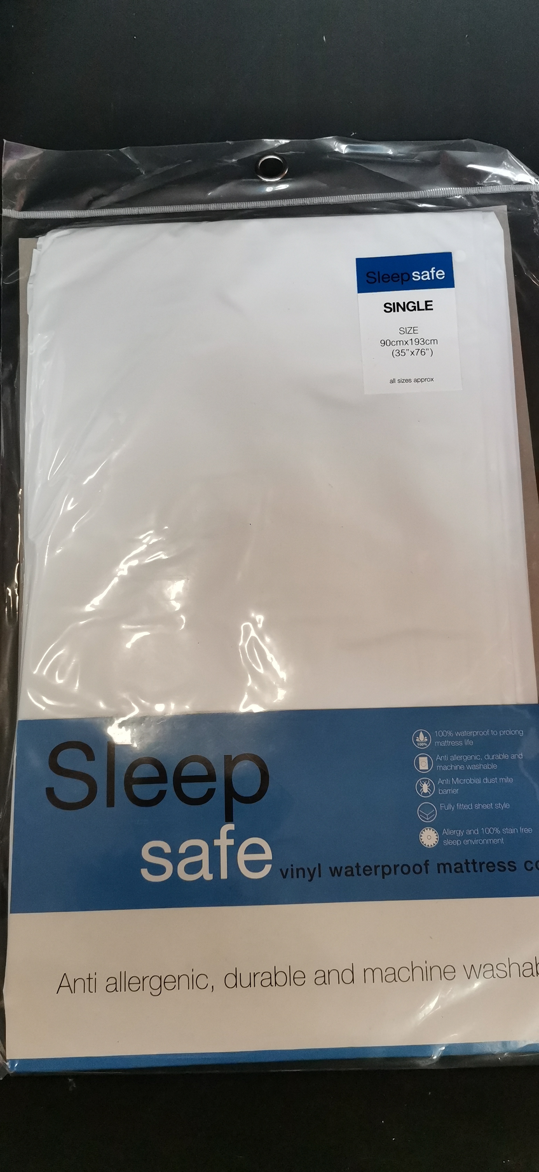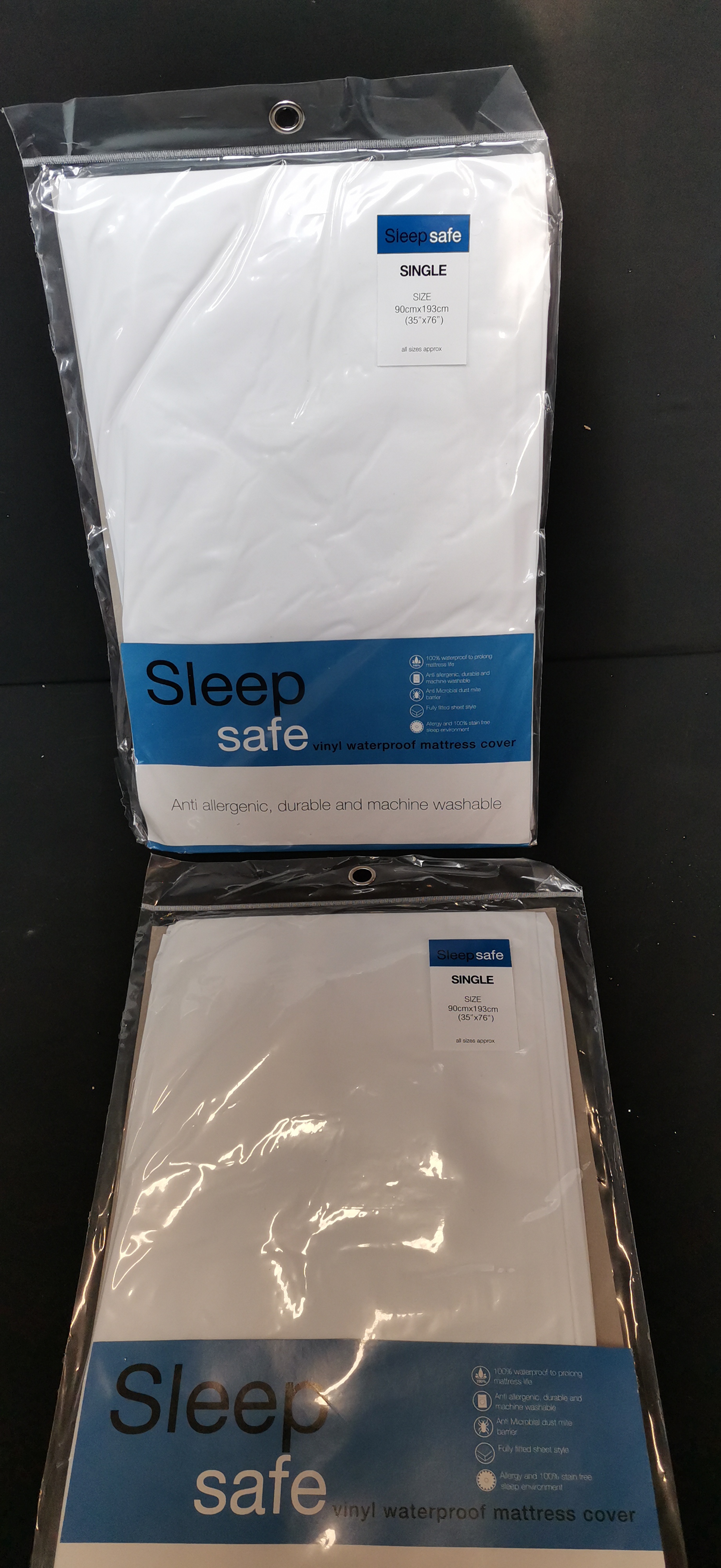 Multiple white vinyl waterproof mattress covers for single beds, each measuring 90cm by 193cm and presented in original packaging.
