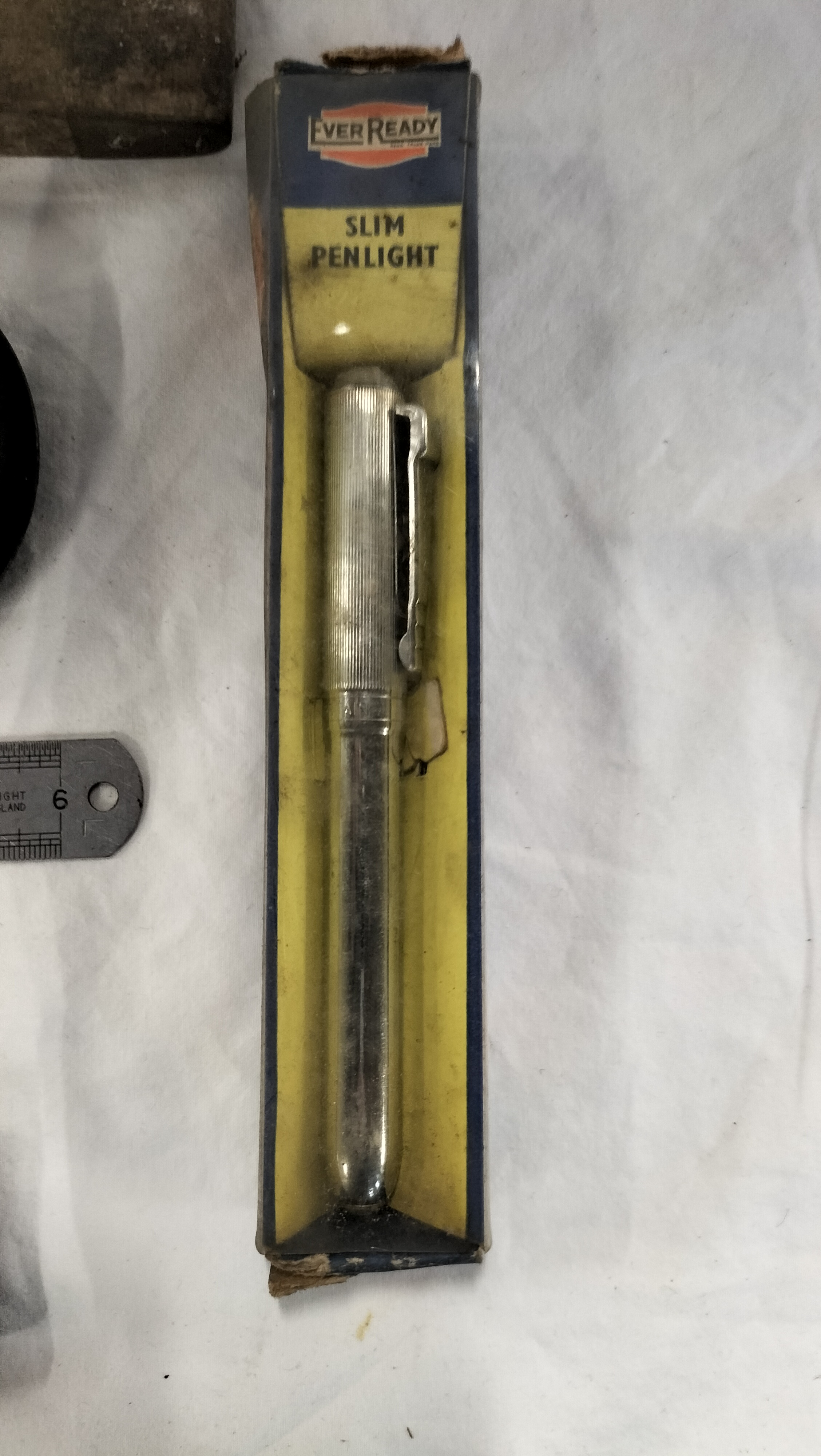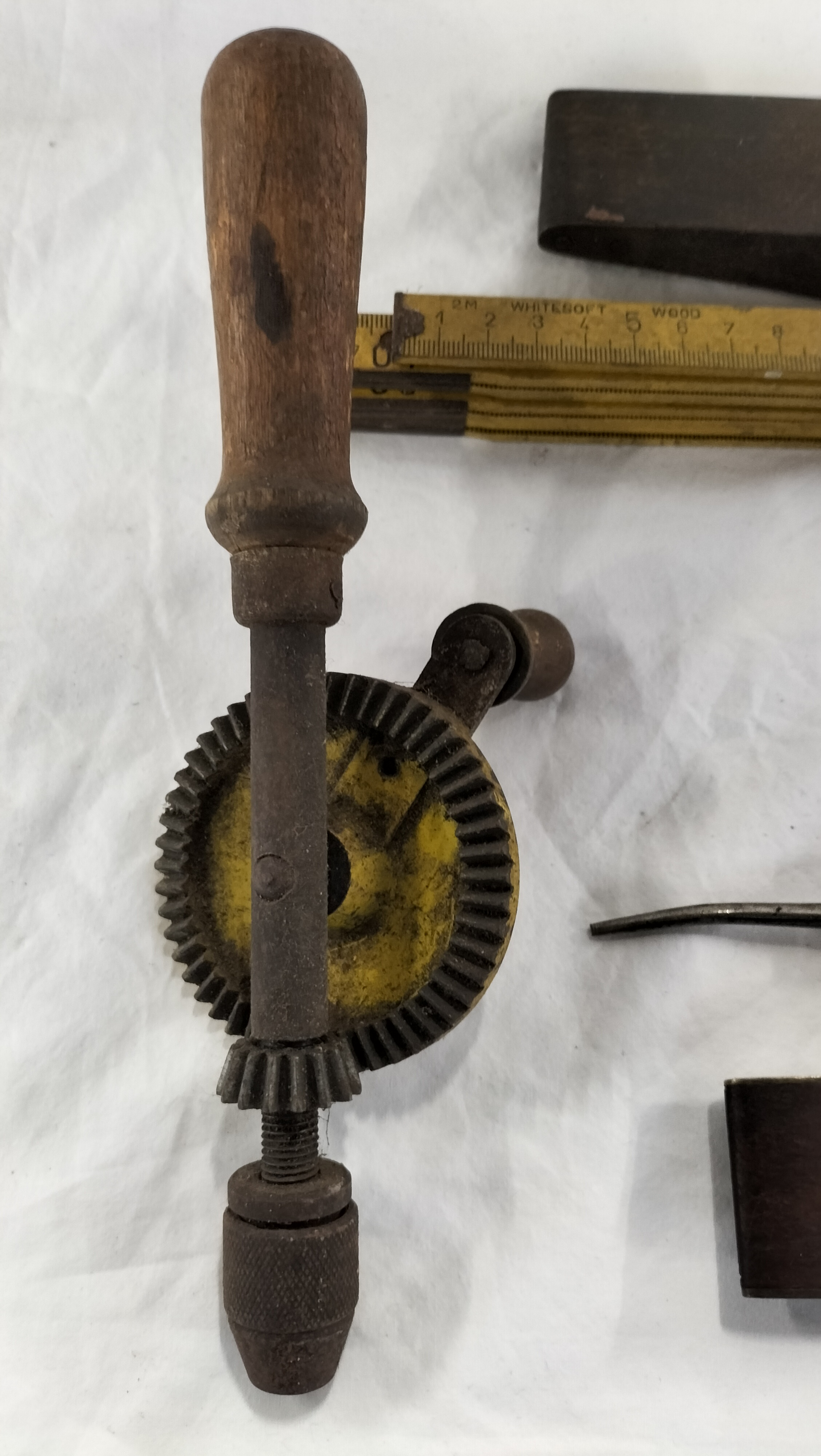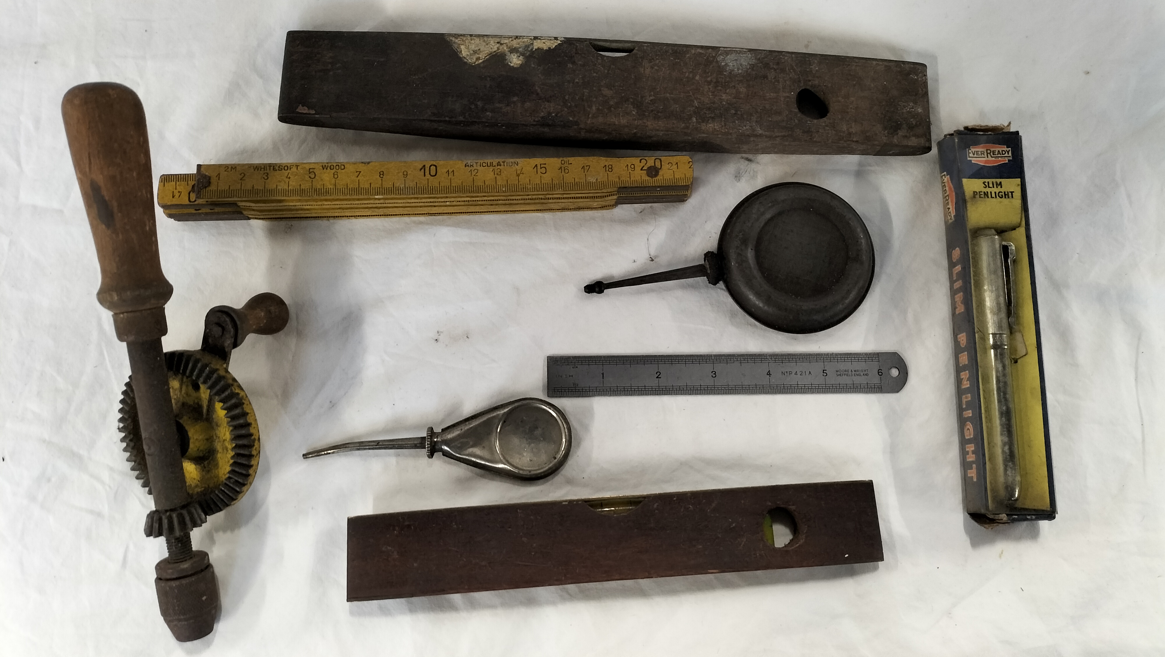 This collection comprises various mid-20th century workshop tools and accessories. Included is a bevel-gear manual hand drill featuring a yellow-painted drive wheel, turned timber handle, and crank knob with a cast metal body. Two boat-shaped spirit levels are present, constructed from hardwood with metal top plates and glass vials. Measuring instruments include a 6-inch engineers steel rule marked Moore and Wright, Sheffield England, No P 421 A, and a yellow-painted wooden folding carpenter rule branded Whitesoft. The lot also contains two vintage thumb-pump precision oilers in plated steel, one circular and one teardrop-shaped. Additionally, there is an Ever Ready Slim Penlight in silver-tone metal, housed in its original retail card and plastic packaging.
