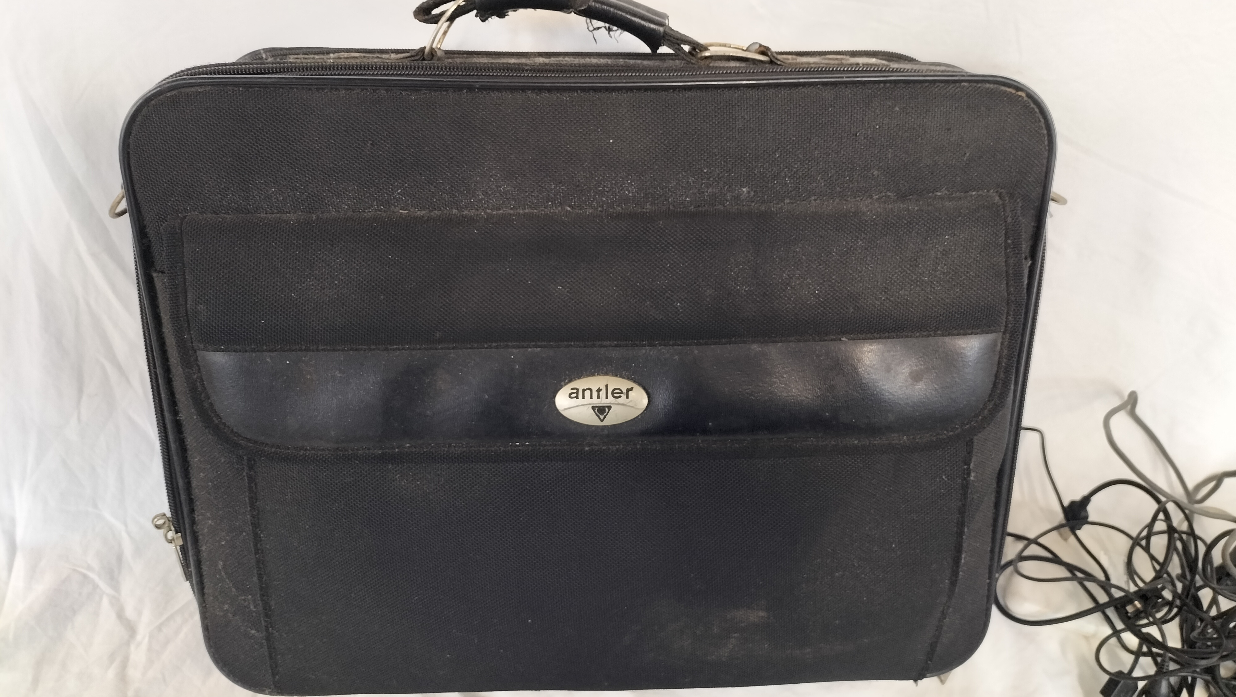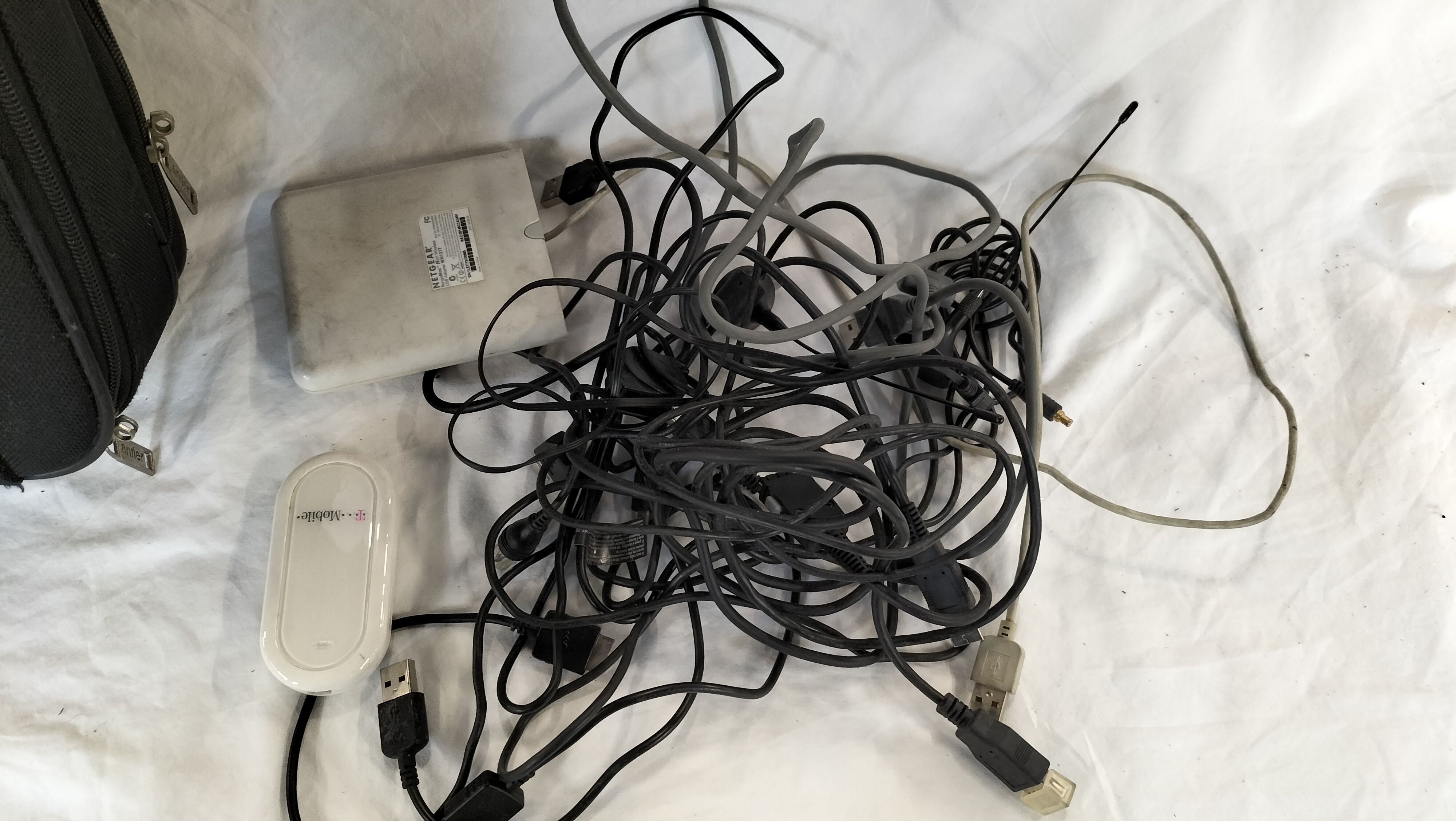 This lot features a laptop bag manufactured by Antler and an assortment of electronic accessories. The bag is a black soft-sided fabric briefcase-style carrier with a front flap pocket and a main zipped compartment. It includes a detachable black shoulder strap with metal clips. The electronic accessories include a white Netgear wireless adapter, model number WG111v3, and a white T-Mobile branded mobile internet device. Also included is an assortment of tangled cables, comprising various USB leads and power cables. No laptop computer is included in this lot.