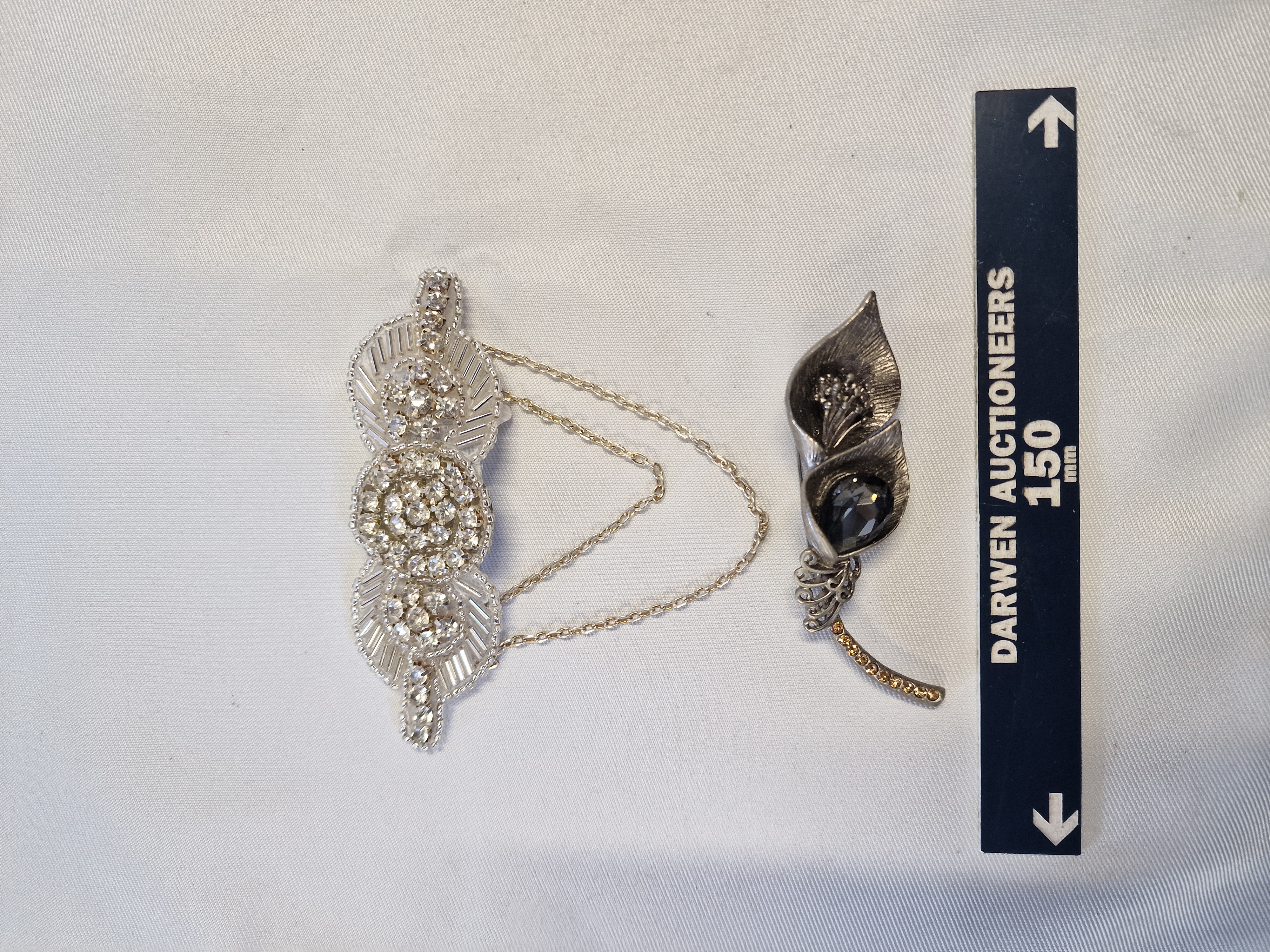 Art Deco brooch approximately 70mm length; calla lily brooch approximately 60mm length.