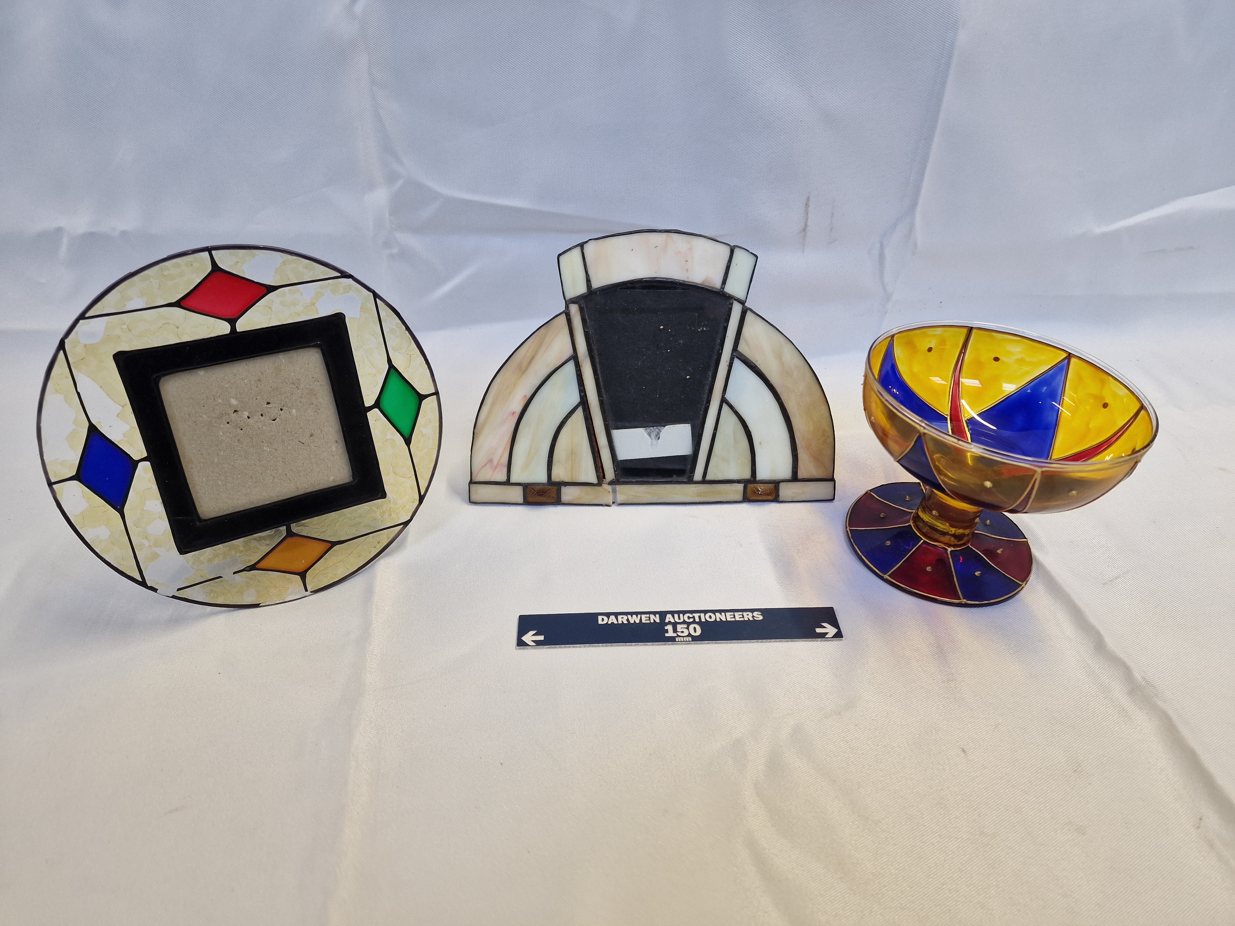 A collection of three decorative glass items including two Art Deco style leaded glass photo frames and a hand-painted pedestal bowl. The frames feature marbled opalescent glass panels and copper foil construction with geometric accents, while the amber glass compote is decorated with primary-coloured enamel in a Cubist aesthetic. No manufacturer marks or signatures are present on any of the pieces.