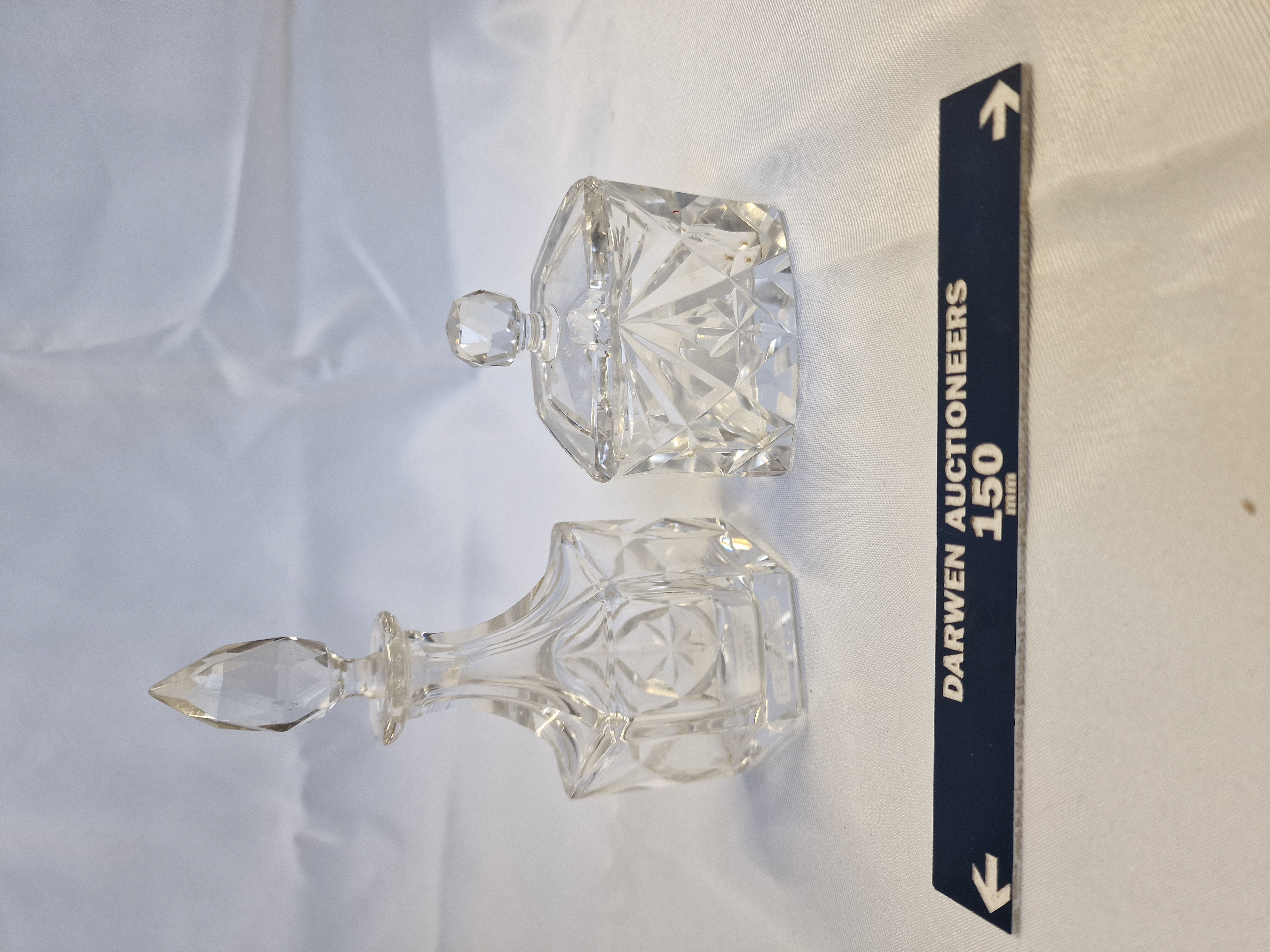 Stuart Crystal cut lead crystal perfume bottle and lidded jar, mid-20th century. Both pieces feature deep-wheel cut fan and starburst motifs on square-section bodies with faceted stoppers. The perfume bottle base bears an acid-etched Stuart mark.