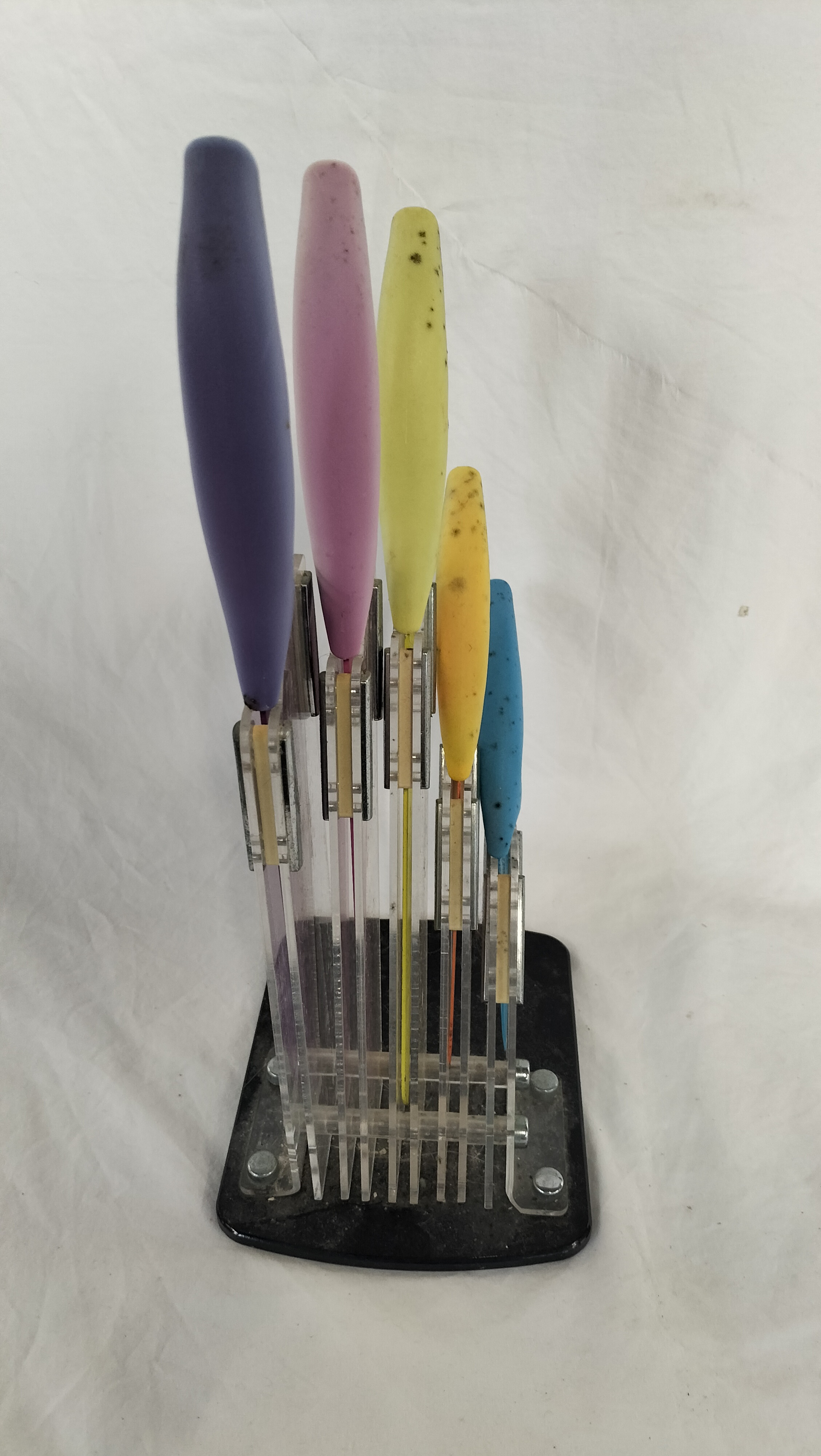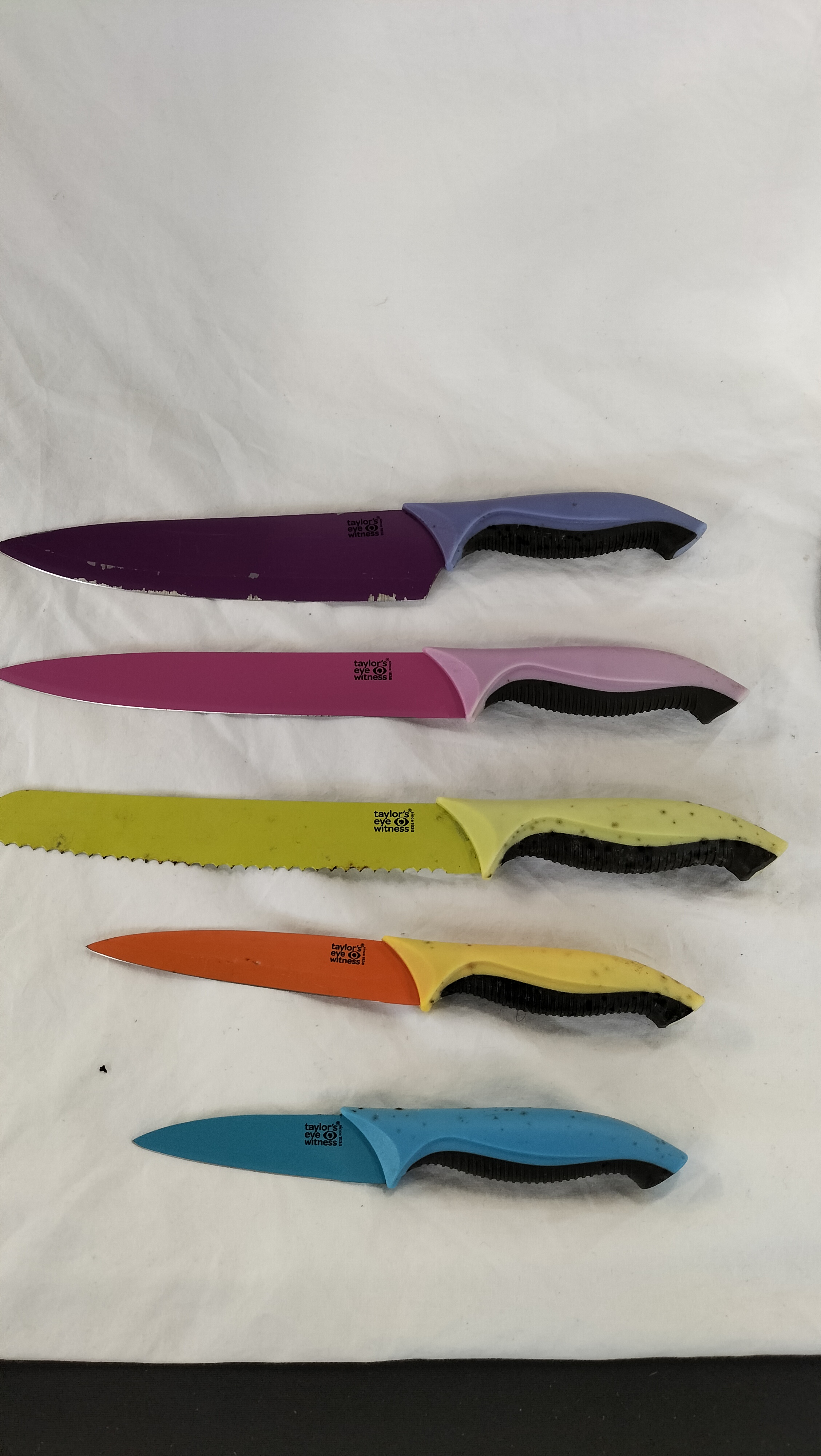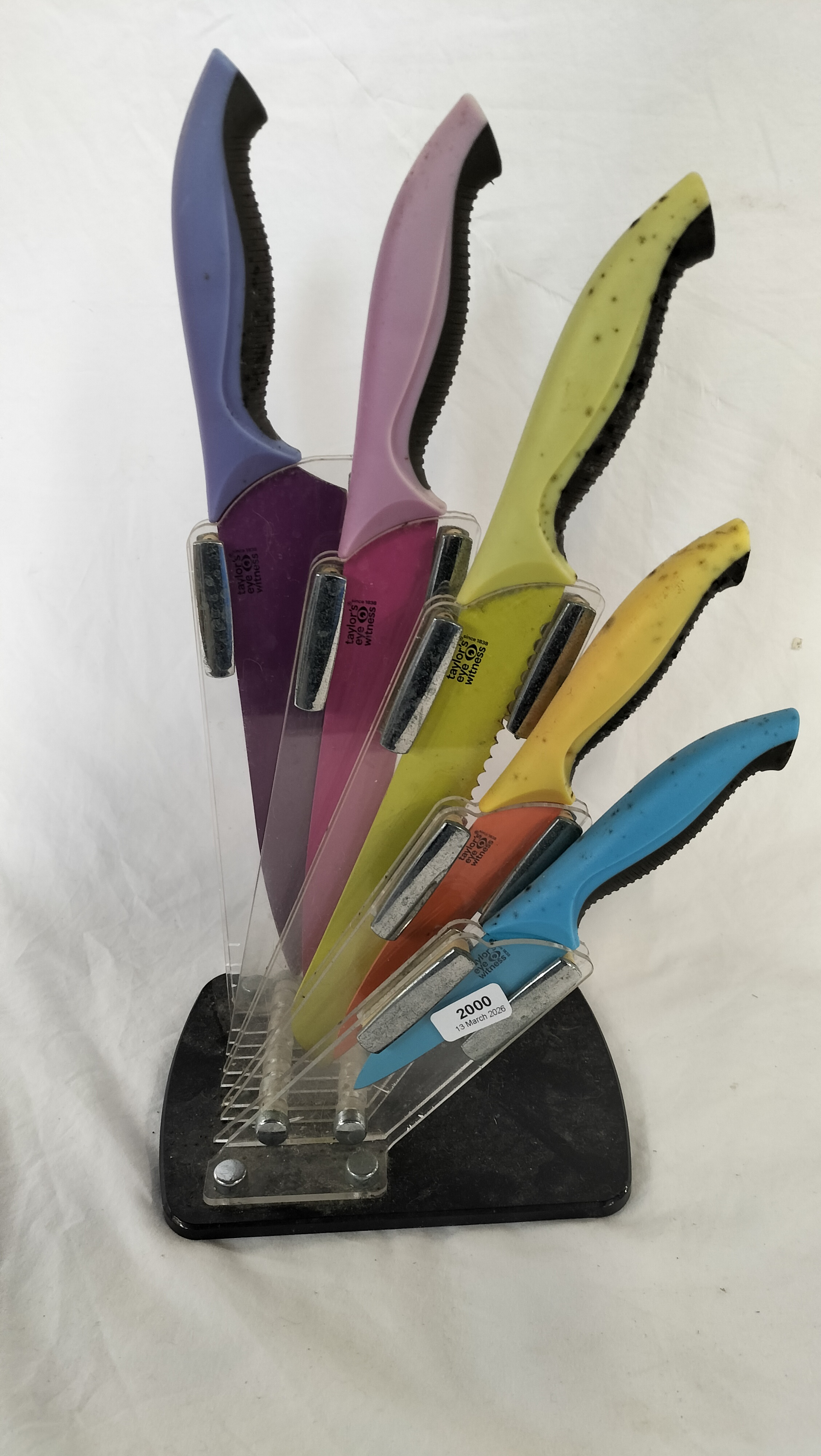 A five piece set of contemporary kitchen knives manufactured by Taylor’s Eye Witness of Sheffield. The set consists of a chef’s knife, a carving or slicing knife, a serrated bread knife, a utility knife, and a paring knife. The blades are crafted from stainless steel and feature a non-stick coating in a variety of colours including purple, pink, lime green, orange, and blue. The knives are fitted with ergonomic contoured plastic handles in coordinating colours, each featuring a black textured rubberised grip for improved safety and comfort. The set is housed in a modern fan-style display stand constructed from clear acrylic with magnetic supports for the blades and a black composite base. Each blade is clearly marked with the Taylor’s Eye Witness logo, the eye symbol, and the text since 1838.